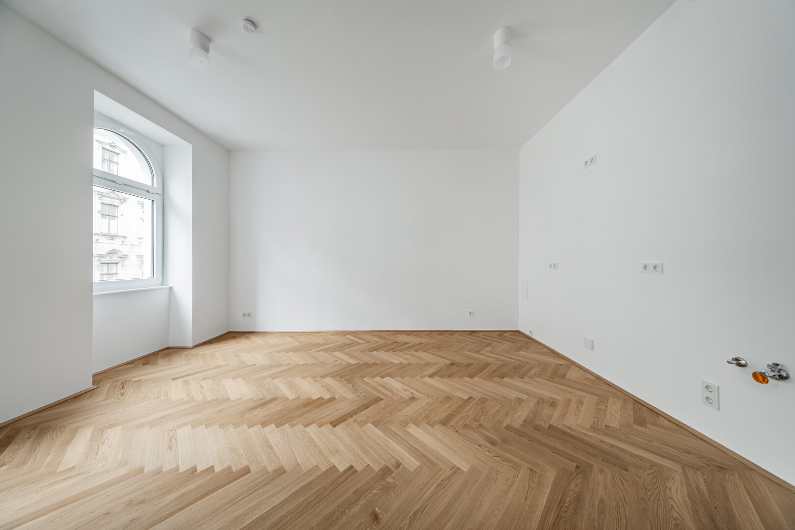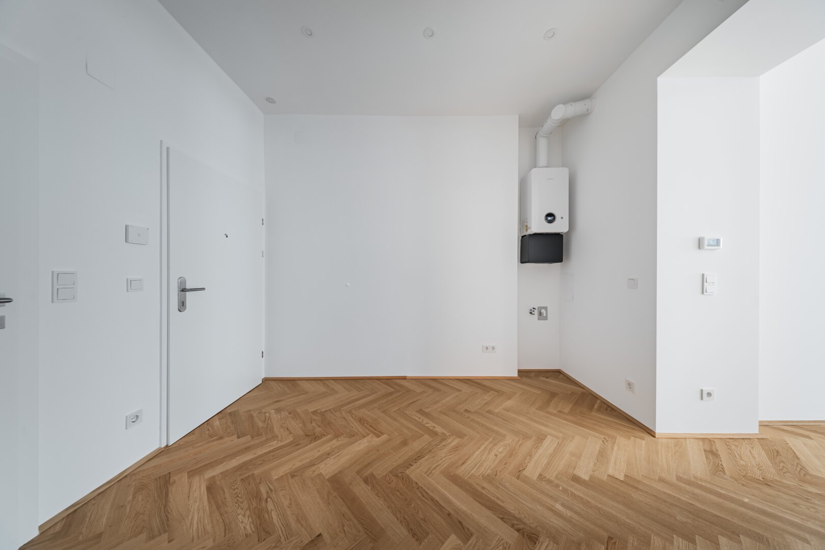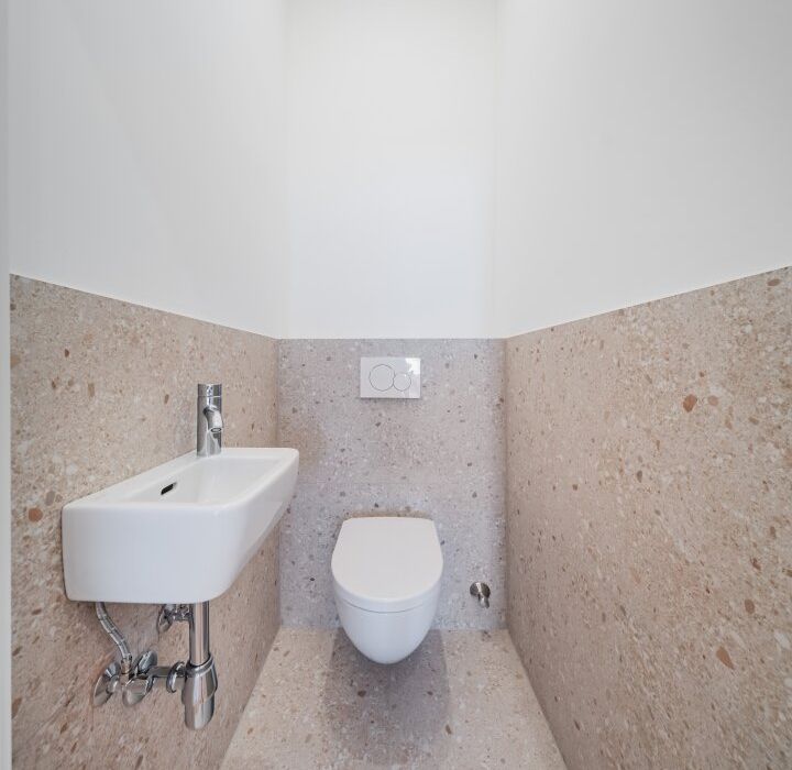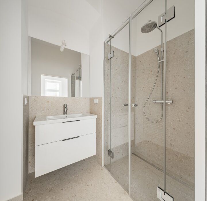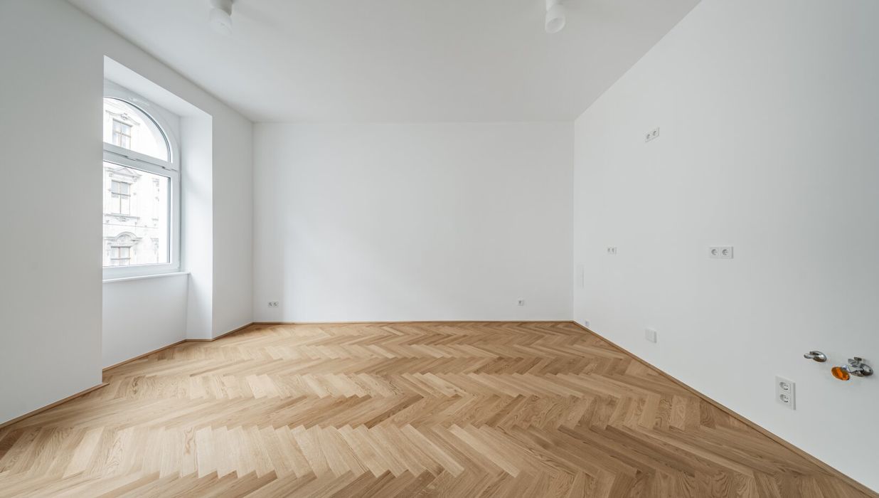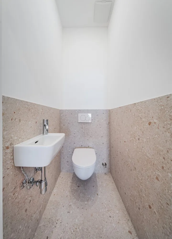 Über den Vorraum mit Waschmaschinenanschluss gelangt man in die straßenseitige Wohnküche, das hofseitige Schlafzimmer sowie in das Bad mit Walk-In-Dusche und das separate WC.
