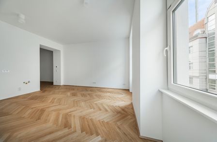 Die wunderschön sanierte Zwei-Zimmer-Altbauwohnung auf der 1. Etage bietet auf rund 44 qm Wohnfläche einen zentral begehbaren Grundriss.