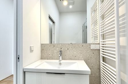 Über den Vorraum gelangt man in den straßenseitigen Wohnraum mit Küchenanschlüssen, in das Bad mit Walk-In-Dusche und WC sowie in den Abstellraum mit Waschmaschinenanschluss. Die Wohnung ist nach Westen ausgerichtet.
