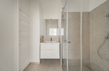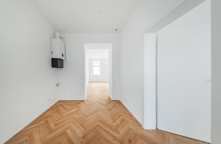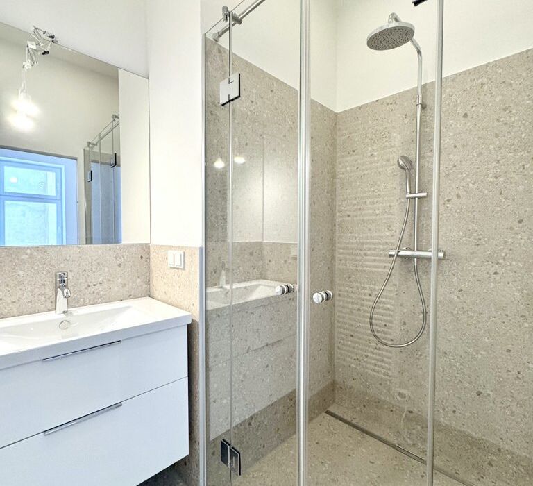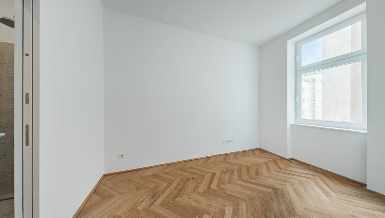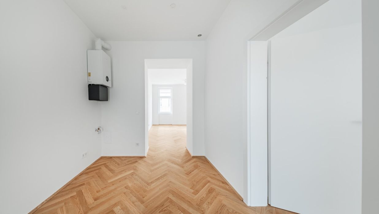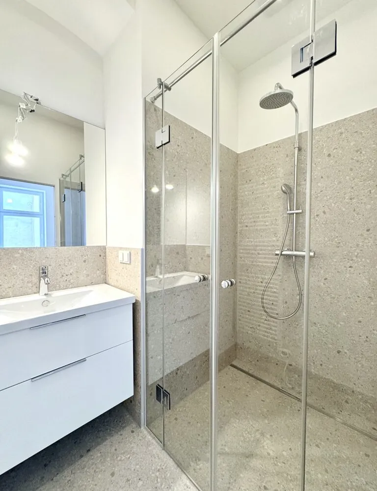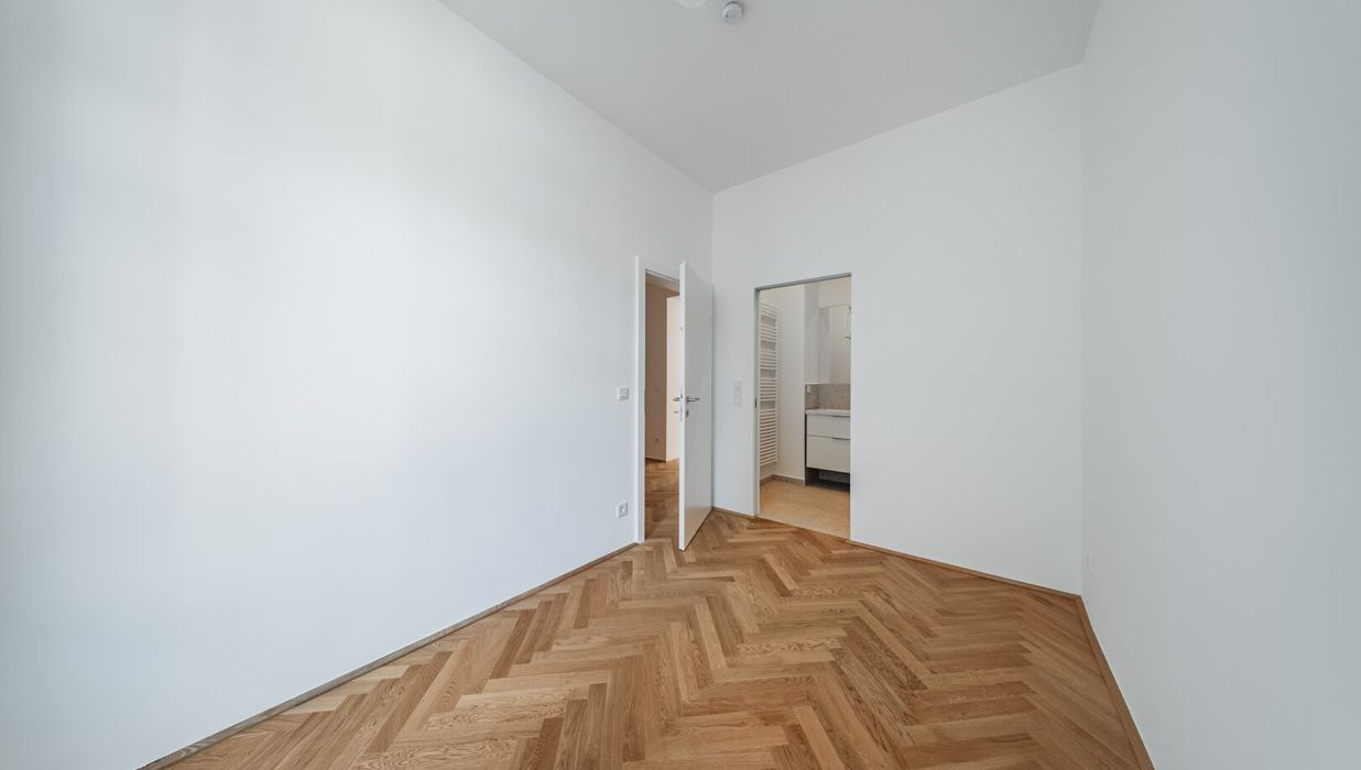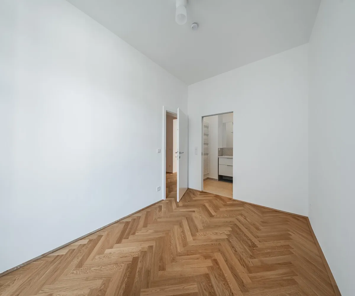 Über den Vorraum gelangt man in die straßenseitige Wohnküche, das hofseitige Schlafzimmer plus en Suite-Bad mit Walk-In-Dusche und das separate WC.