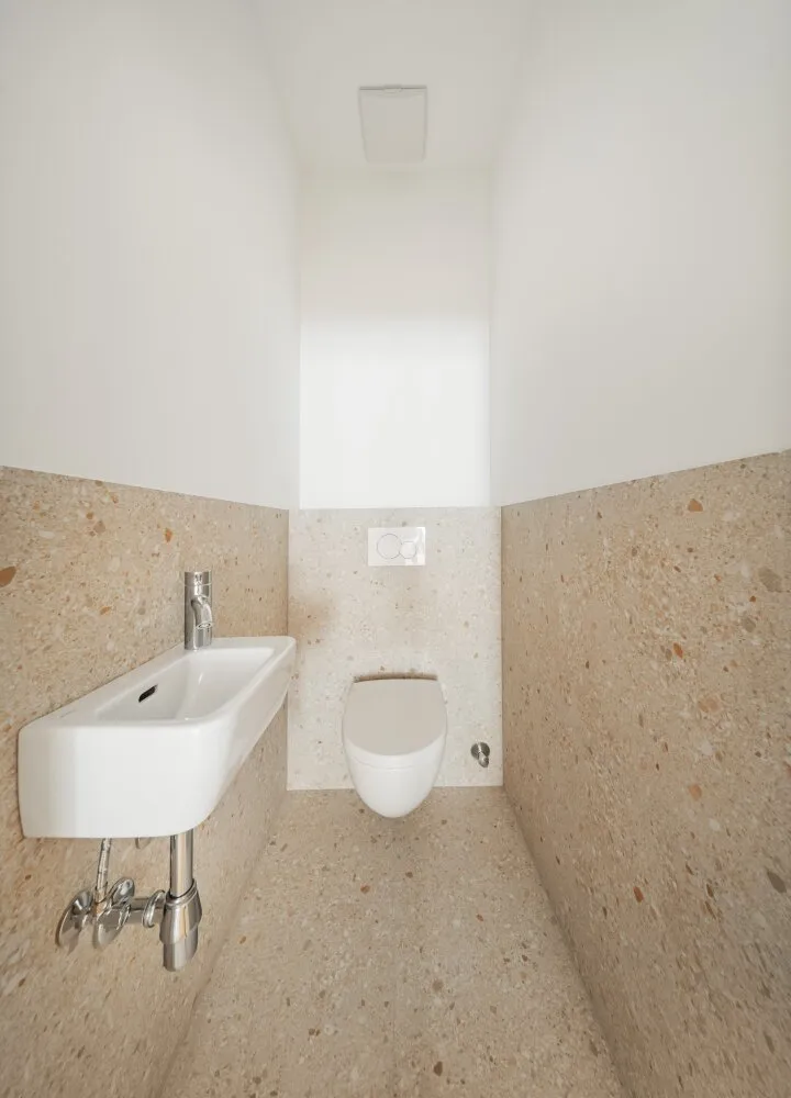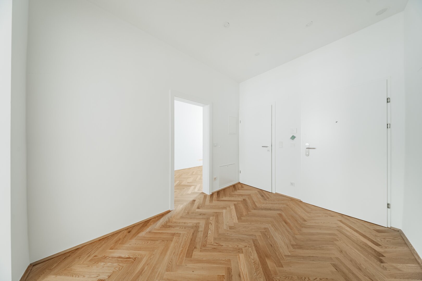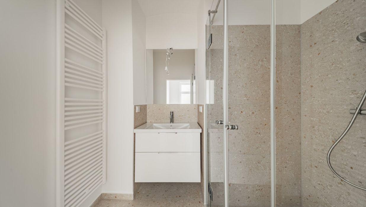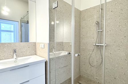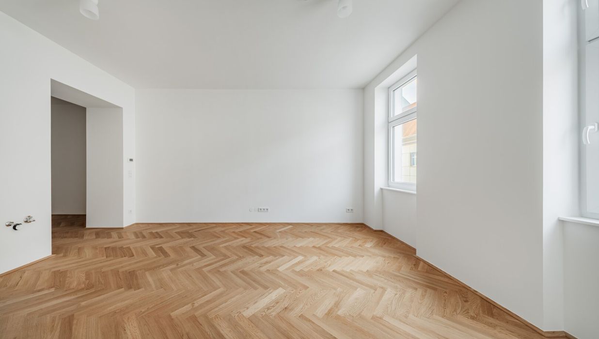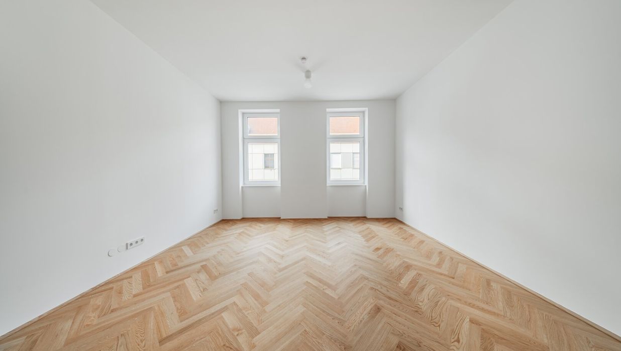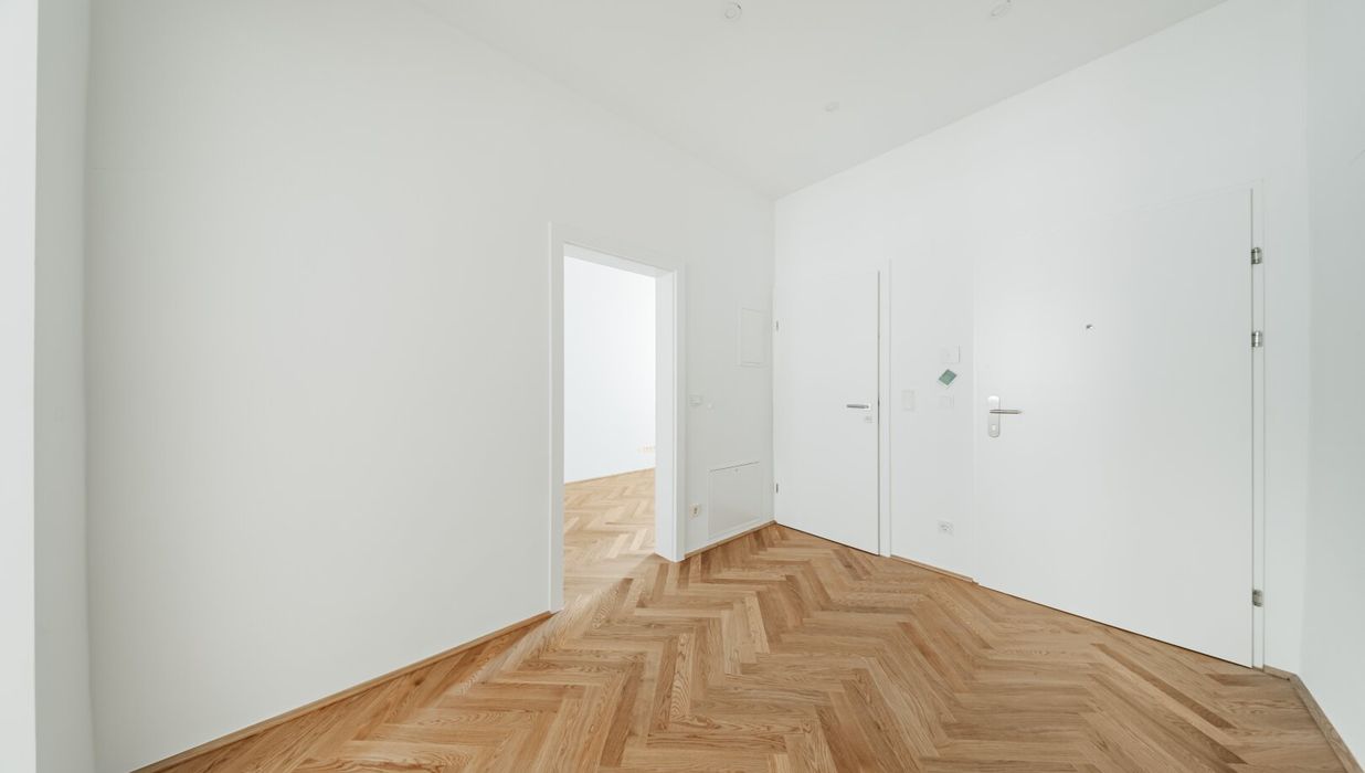 Über den Vorraum gelangt man in die straßenseitige Wohnküche, das hofseitige Schlafzimmer plus en Suite-Bad mit Walk-In-Dusche und das separate WC.