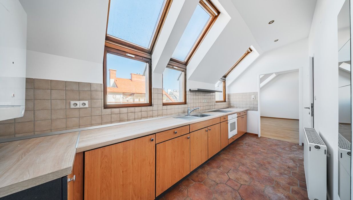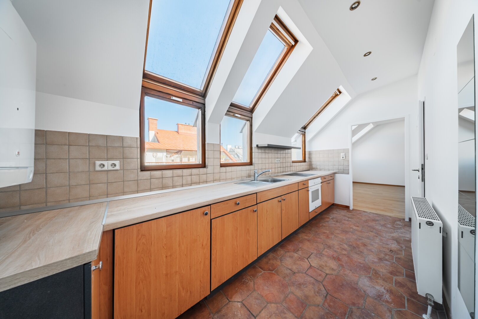 Die helle Dachgeschoßwohnung mit rund 42 qm Wohnfläche verfügt über einen sehr guten Grundriss und bietet folgende Räumlichkeiten: