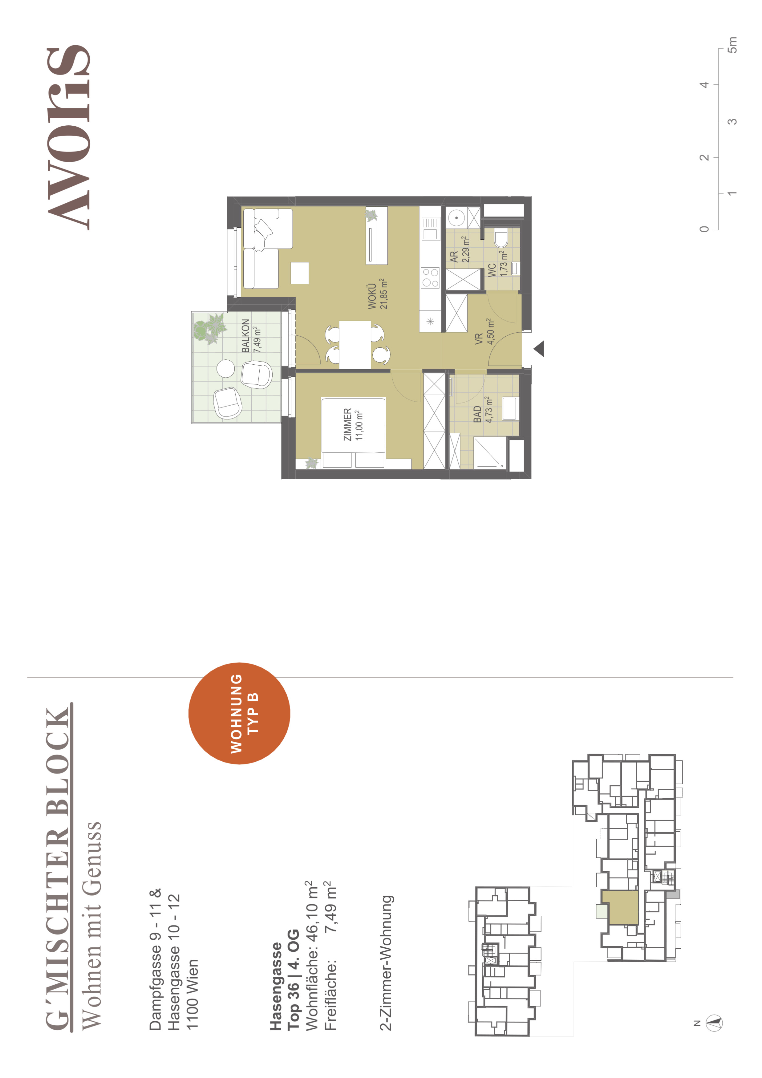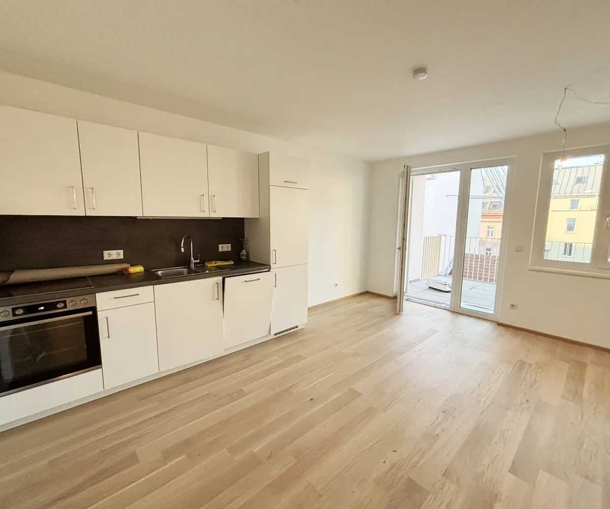 Zur Verfügung steht eine 2 Zimmer Wohnung welche sich im 4. Obergeschoss befindet. Die Wohnung gliedert sich in eine Wohnküche, ein Schlafzimmer, ein Badezimmer mit Dusche, eine separate Toilette, einen Abstellraum mit Waschmaschinenanschluss, einen Vorraum und einem großzügigen Balkon.