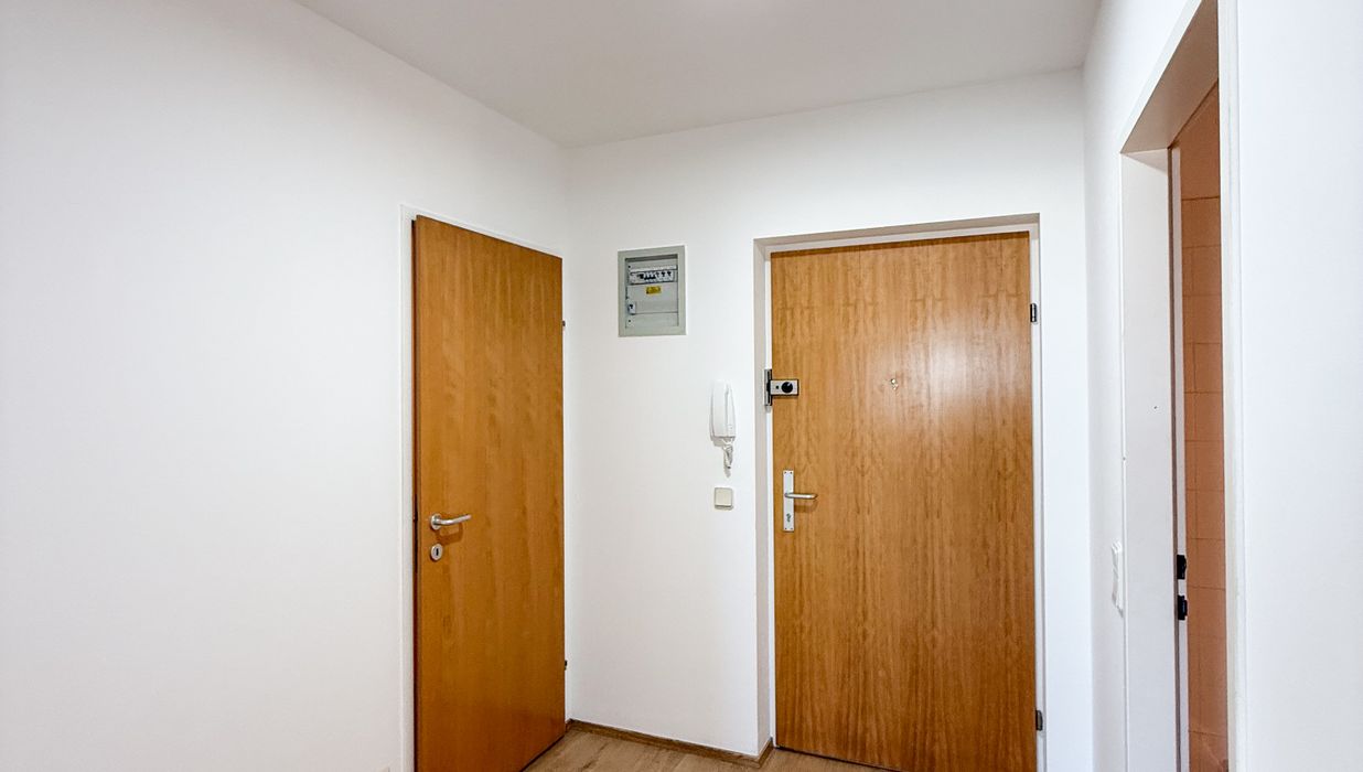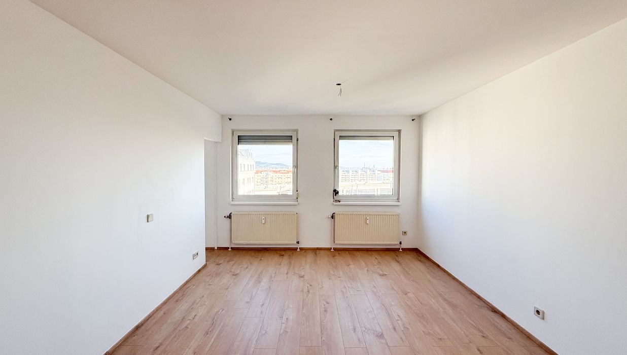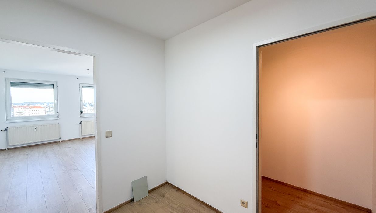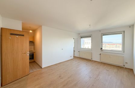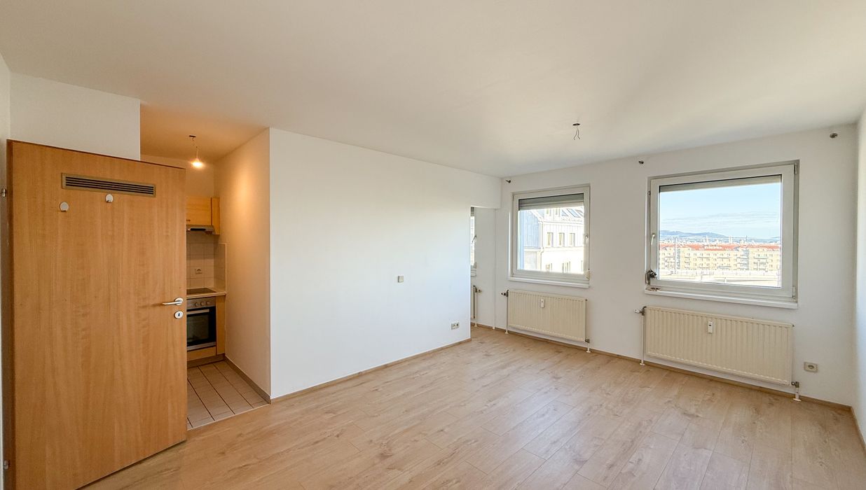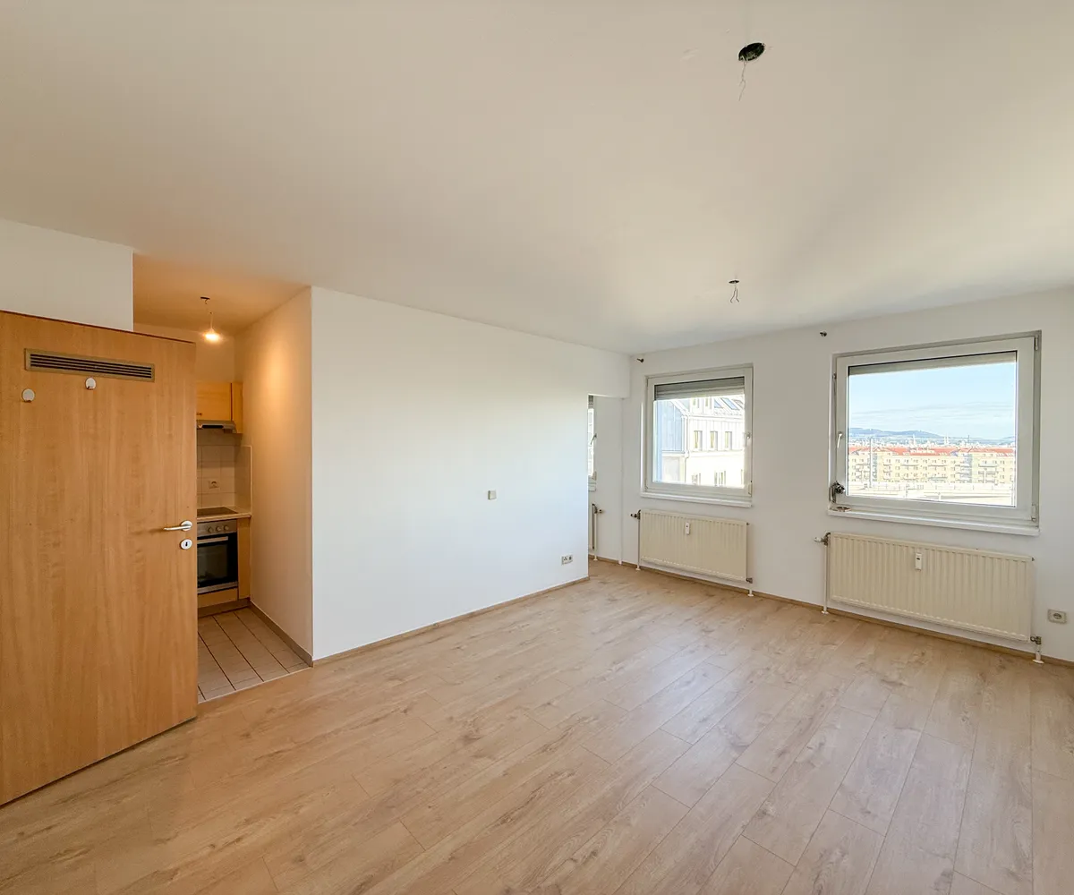 Die Wohnung liegt im 8. Obergeschoß eines 1993 errichteten Mehrfamilienhaus mit glatter Fassade und Personenaufzug. Die ca. 42 m² große 1-Zimmer-Wohnung, verfügt über einen