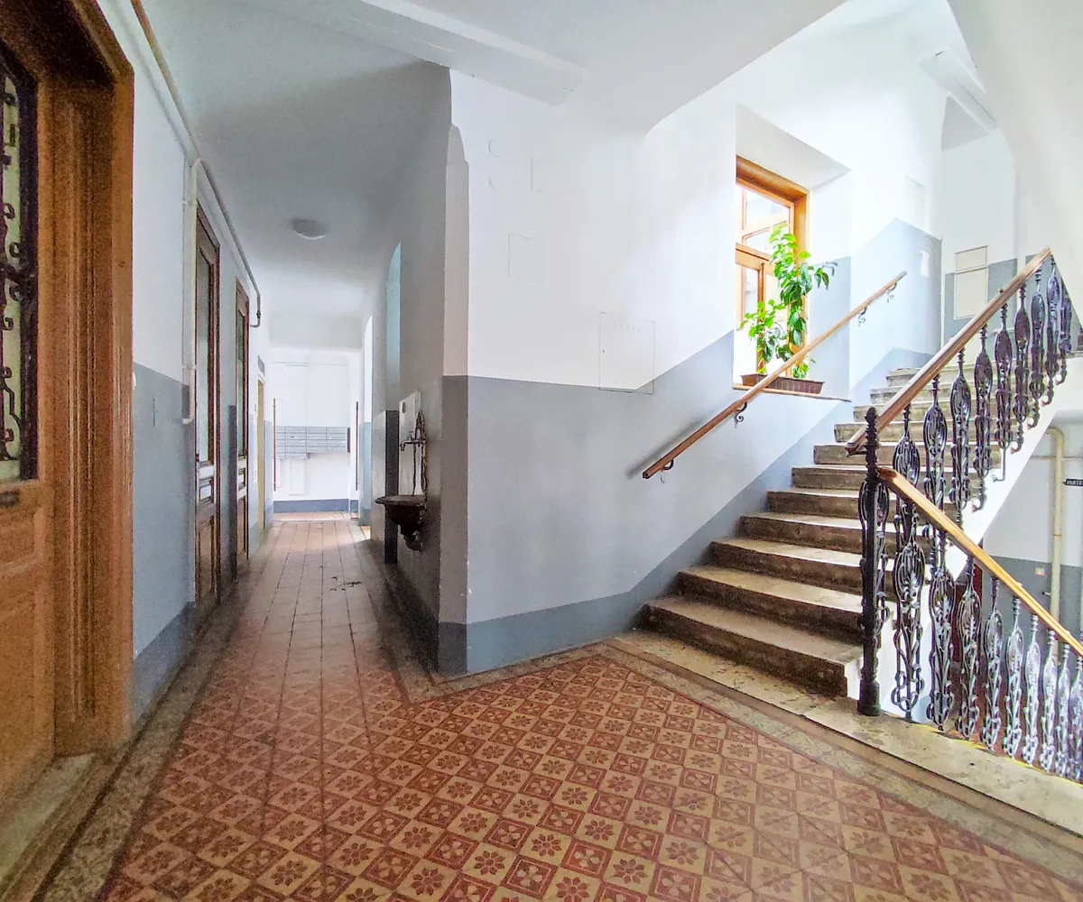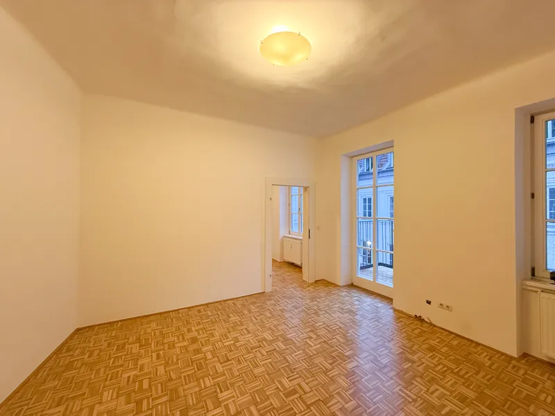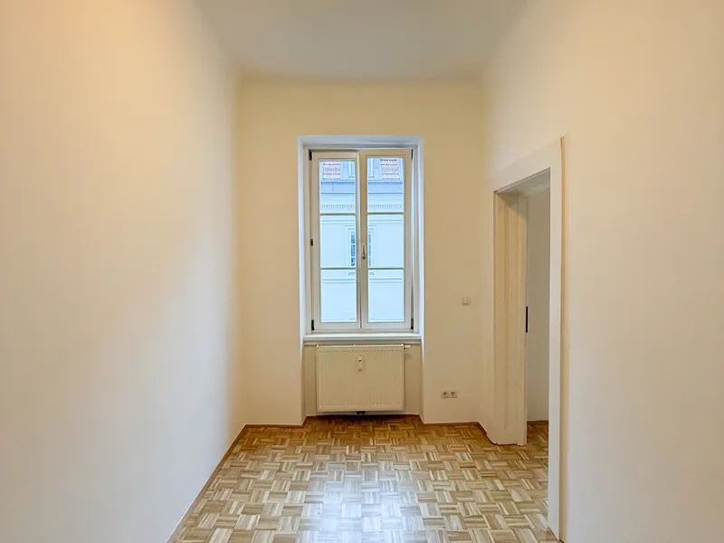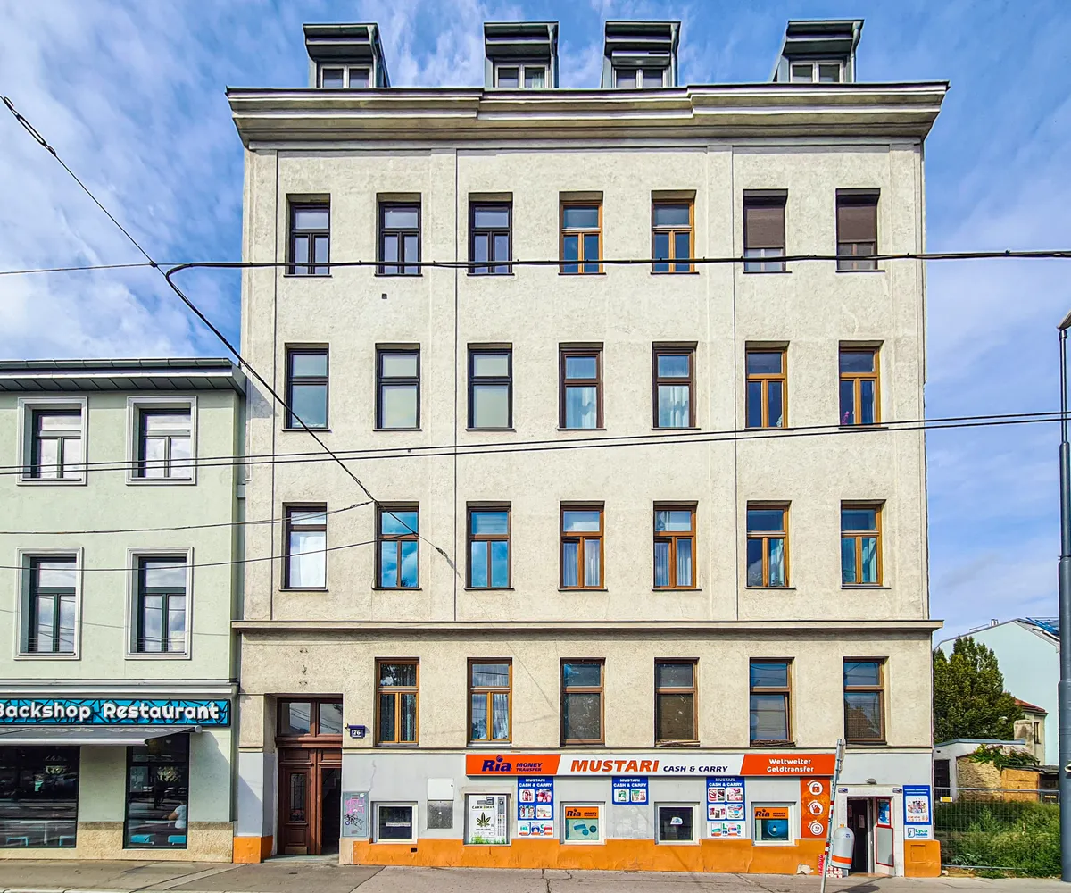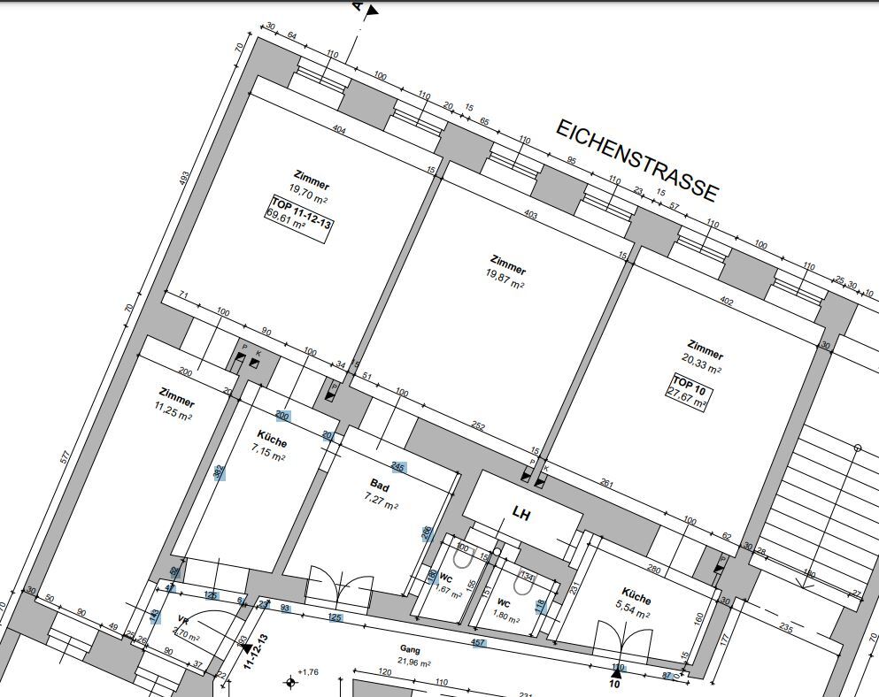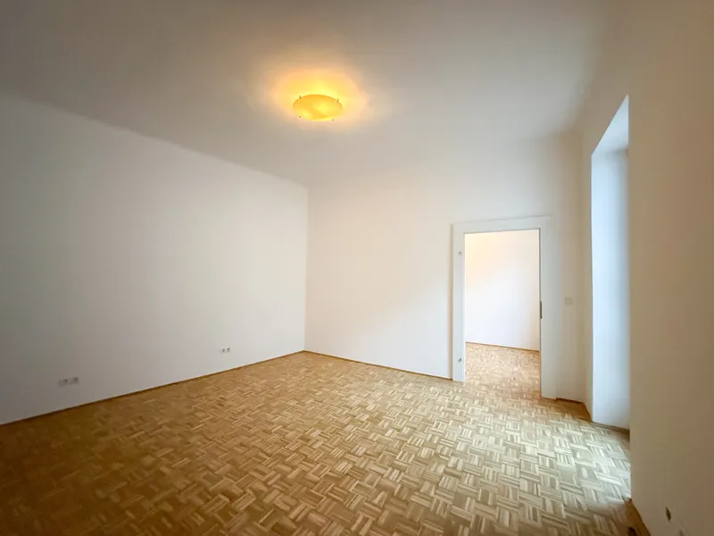 Die Wohnung verfügt über eine Nutzfläche von ca. 69,35 m² und befindet sich im Hochparterre der Liegenschaft mit straßenseitiger Ausrichtung. Insgesamt stehen 3 Zimmer mit einer Fläche von jeweils 19,70 m², 19,87 m², sowie 11,25 m² zur Verfügung. Der Eingangsbereich im Stiegenhaus ist lt. Nutzwertgutachten der Wohnung zugeordnet, die Nutzfläche kann somit erweitert werden (vor Ort nicht ausgeführt!).