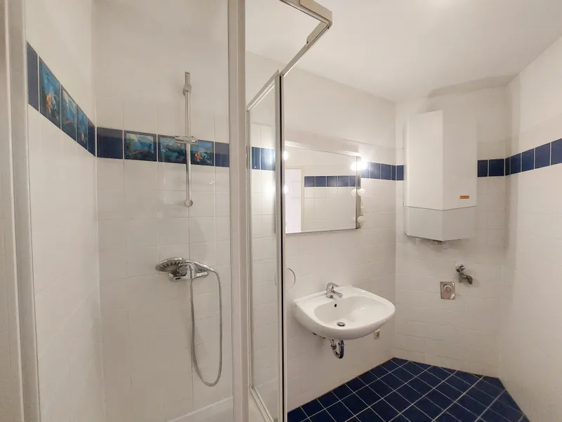 Vollständig ausgestattet: Bad mit komplett verfliesten Oberflächen , gepflegte Armaturen , schönes WC , Dusche