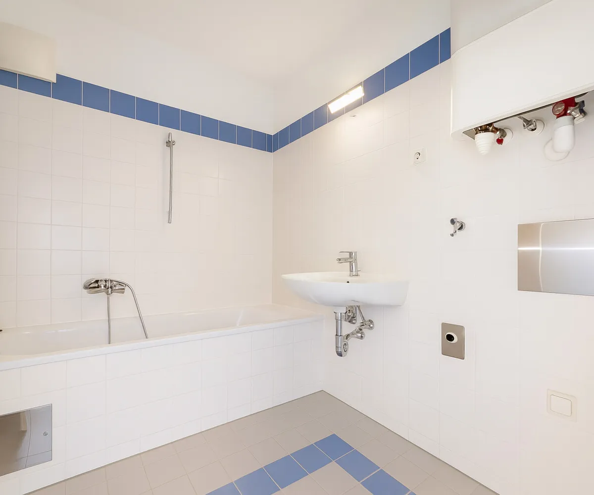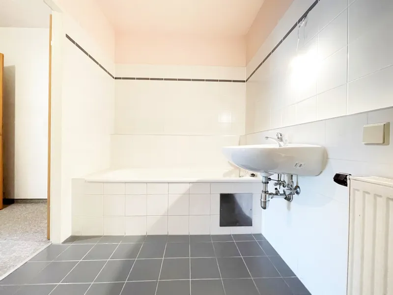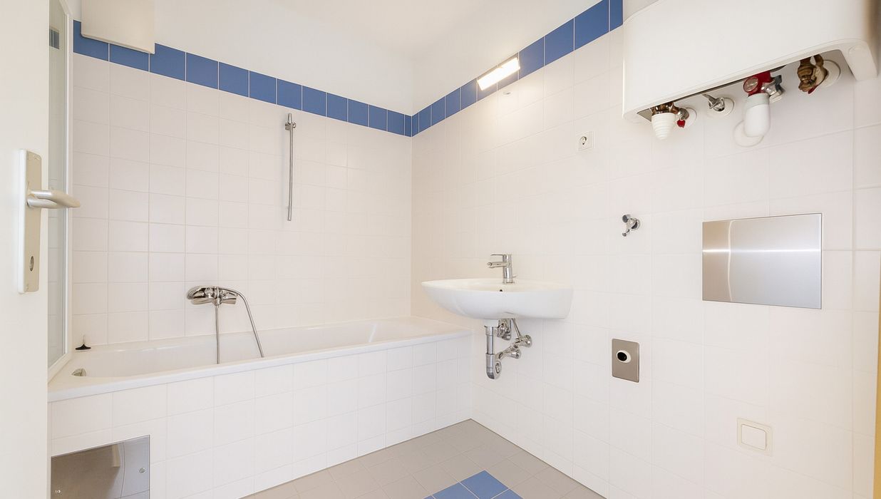 Badezimmer mit Badewanne und Waschmaschinenanschluss