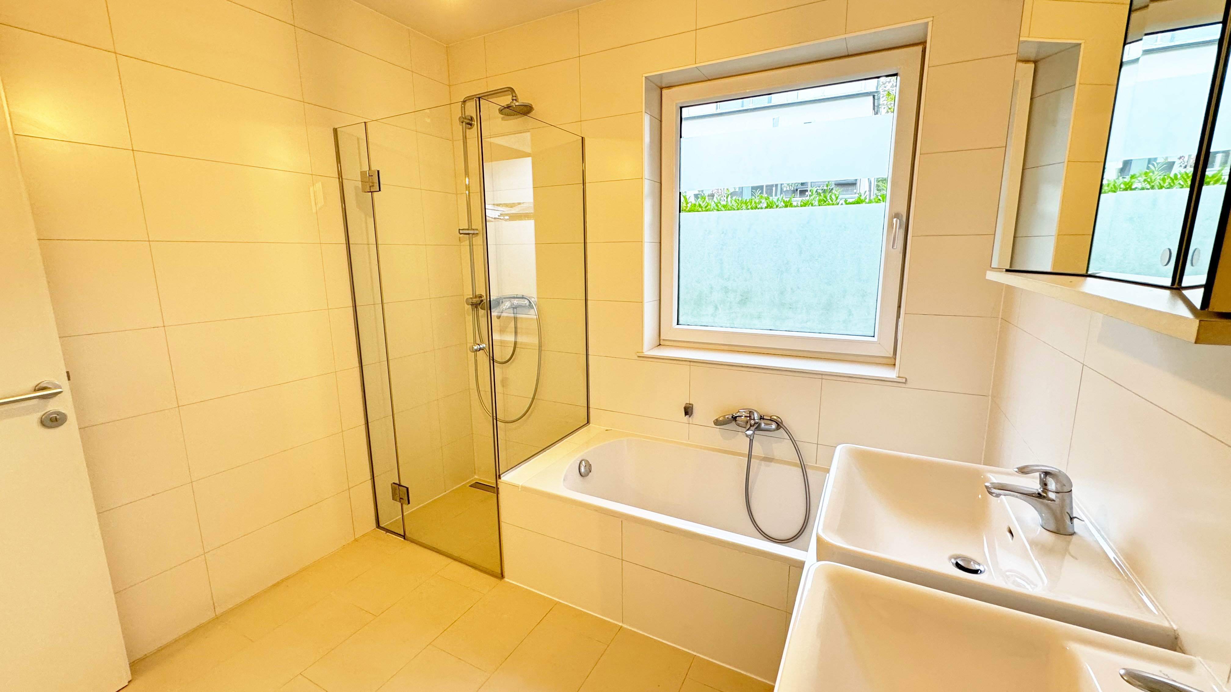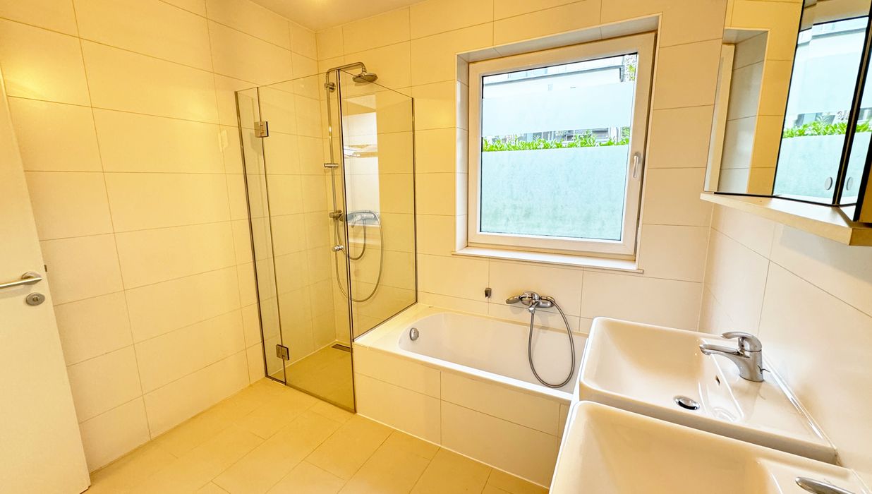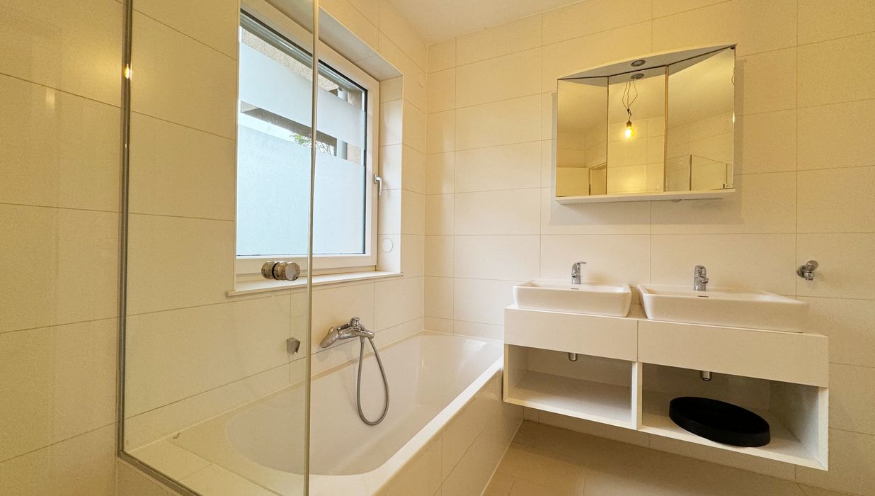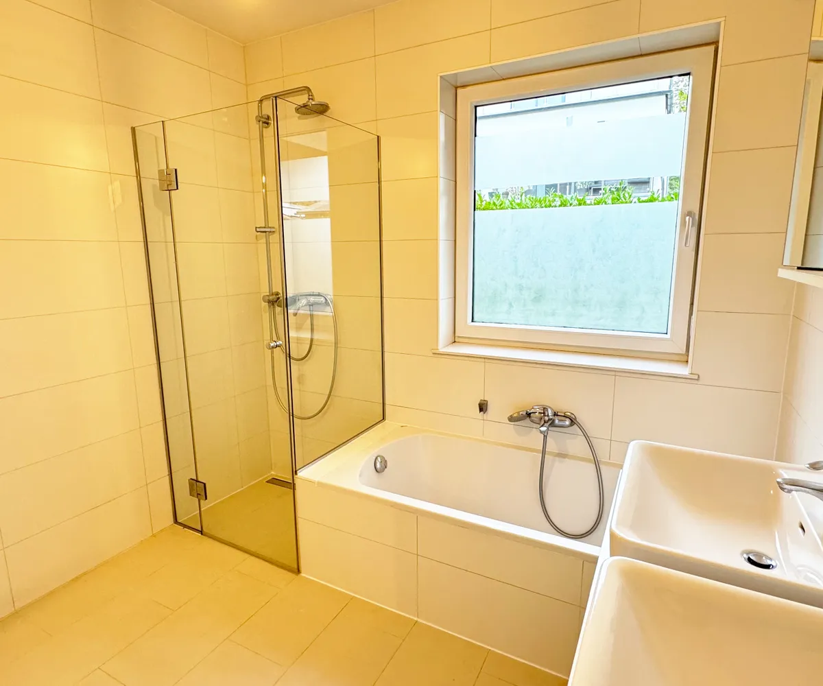Das Badezimmer verfügt über ein Fenster, das viel Tageslicht hereinlässt. Zur Ausstattung gehören eine Badewanne, eine barrierefreie Dusche, ein Doppelwaschtisch, der bereits mit Ober- als auch Unterschränken ausgestattet ist sowie ein Waschmaschinenanschluss. Die separate Toilette und der Abstellraum sind praktische Ergänzungen, die über den großzügigen Vorraum zugänglich sind.