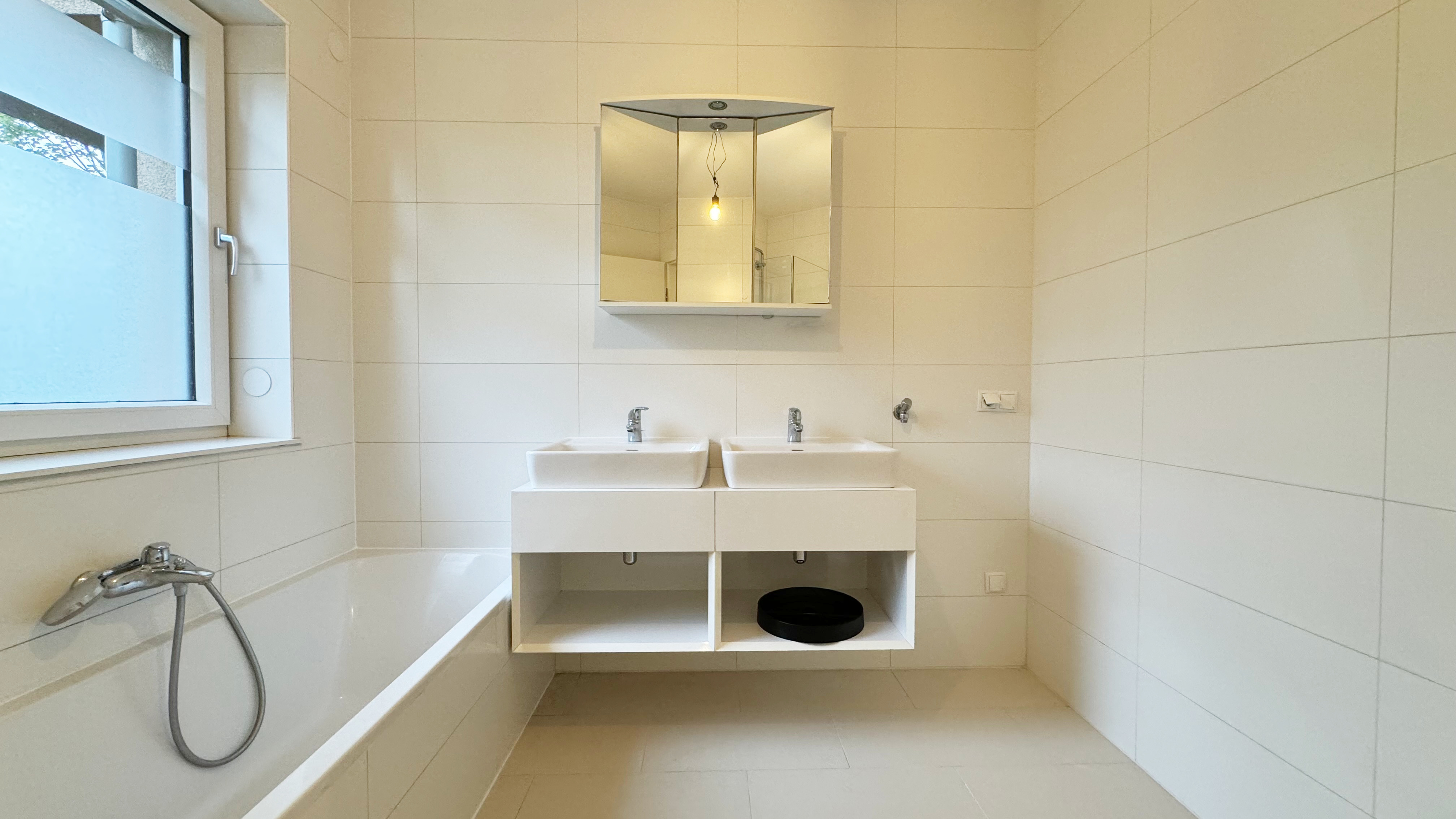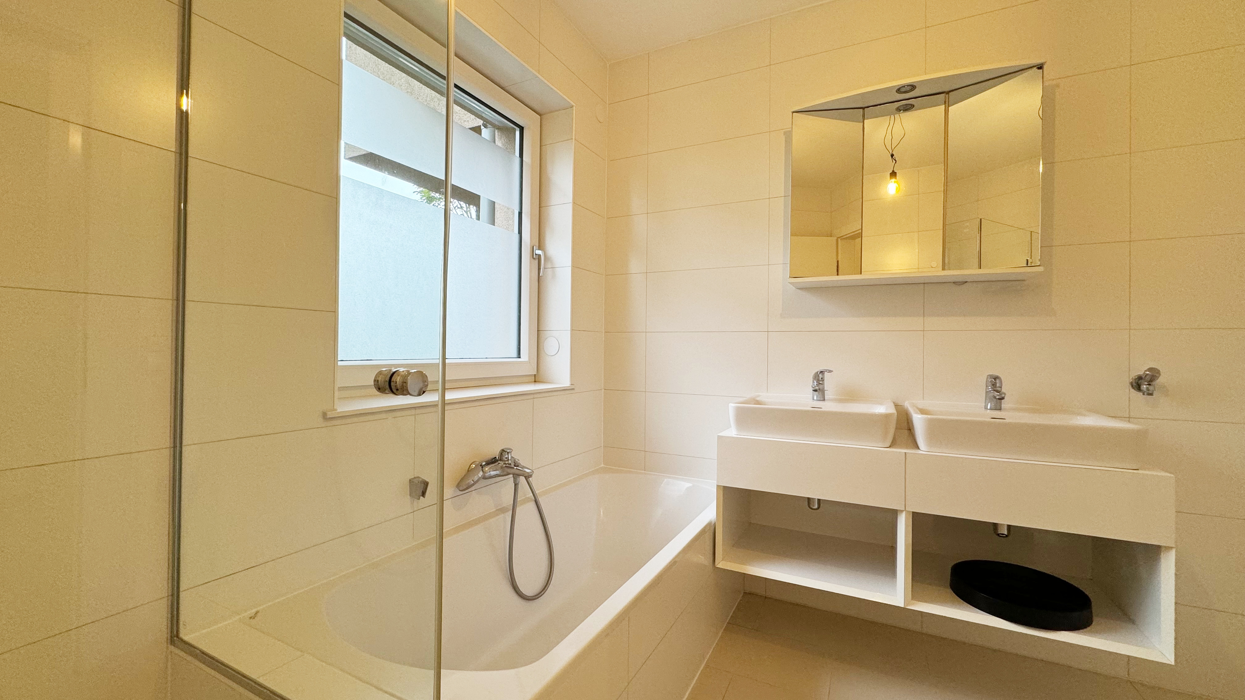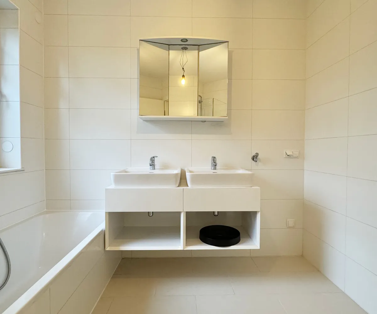 Das Badezimmer verfügt über ein Fenster, das viel Tageslicht hereinlässt. Zur Ausstattung gehören eine Badewanne, eine barrierefreie Dusche, ein Doppelwaschtisch, der bereits mit Ober- als auch Unterschränken ausgestattet ist sowie ein Waschmaschinenanschluss. Die separate Toilette und der Abstellraum sind praktische Ergänzungen, die über den großzügigen Vorraum zugänglich sind.