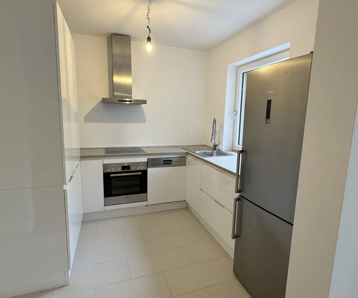 Die optisch vom Wohnbereich abgetrennte, moderne Einbauküche ist mit hochwertigen Geräten der Marken Bosch und Siemens ausgestattet – ideal für Hobbyköche und Gourmets.
