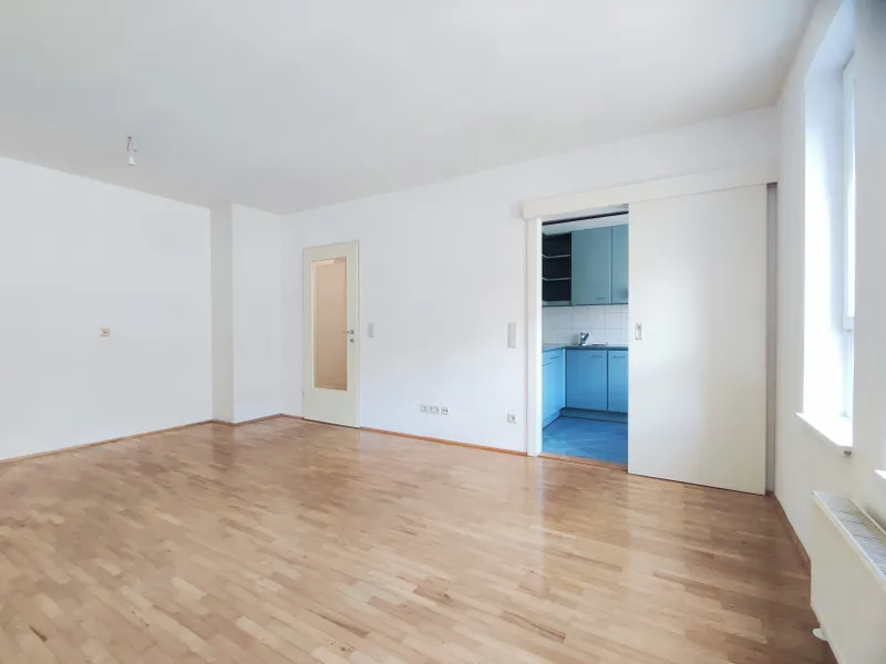 Vom zentralen Vorraum gelangt man geradeaus in das geräumige Wohnzimmer mit angeschlossener Loggia.