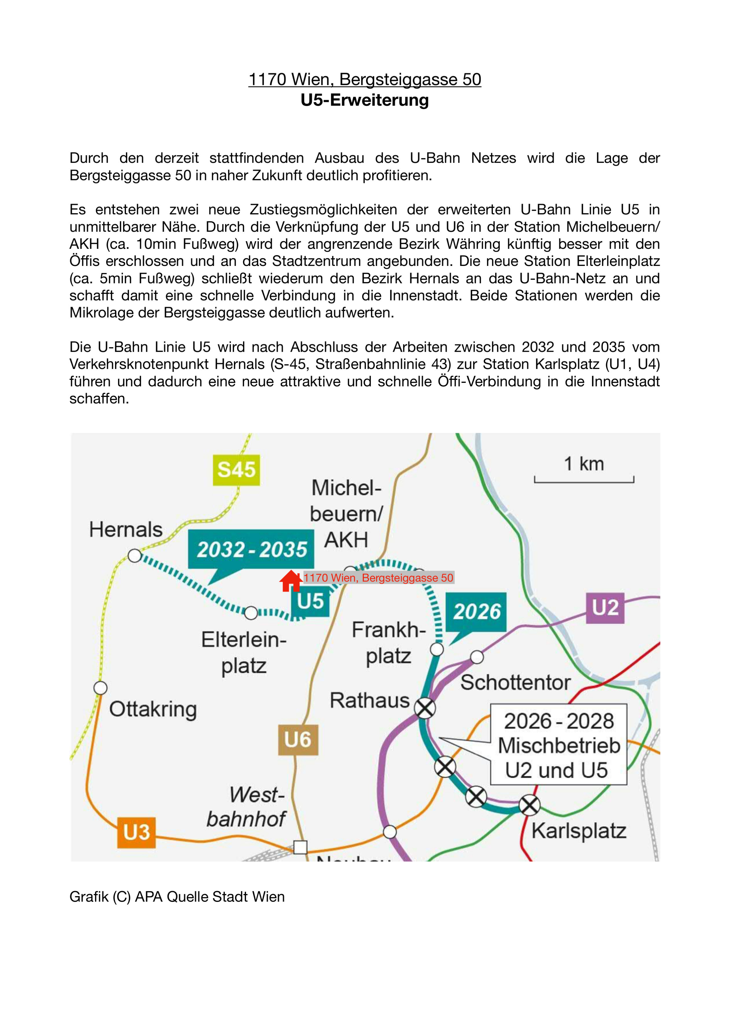 Es entstehen zwei neue Zustiegsmöglichkeiten der erweiterten U-Bahnlinie U5 in unmittelbarer Nähe, Durch die Verknüpfung der U5 und U6 in der Station Michelbeuern/AKH (ca. 10 Gehminuten) wird der angrenzende Bezirk Währing künftig besser mit den Öffis erschlossen und an das Stadtzentrum angebunden. Die neue Station Elterleinplatz (ca. 5 Gehminuten) schließt wiederum den Bezirk Hernals an das U-Bahnnetz an und schafft damit eine schnelle Verbindung in die Innenstadt. Beide Stationen werden die Mikrolage der Bergsteiggasse deutlich aufwerten.
