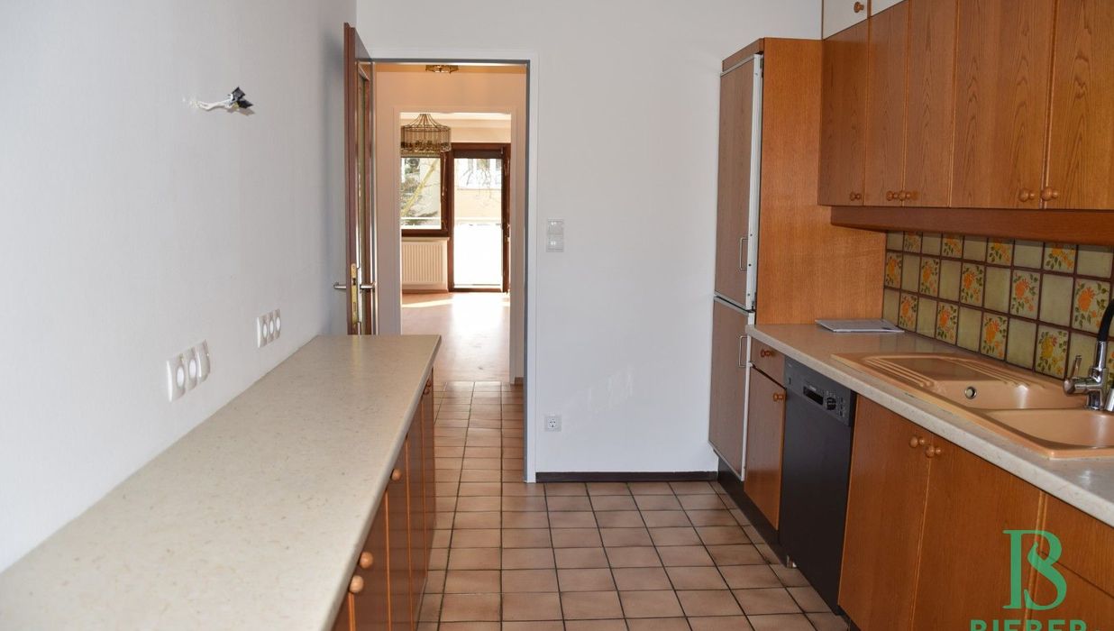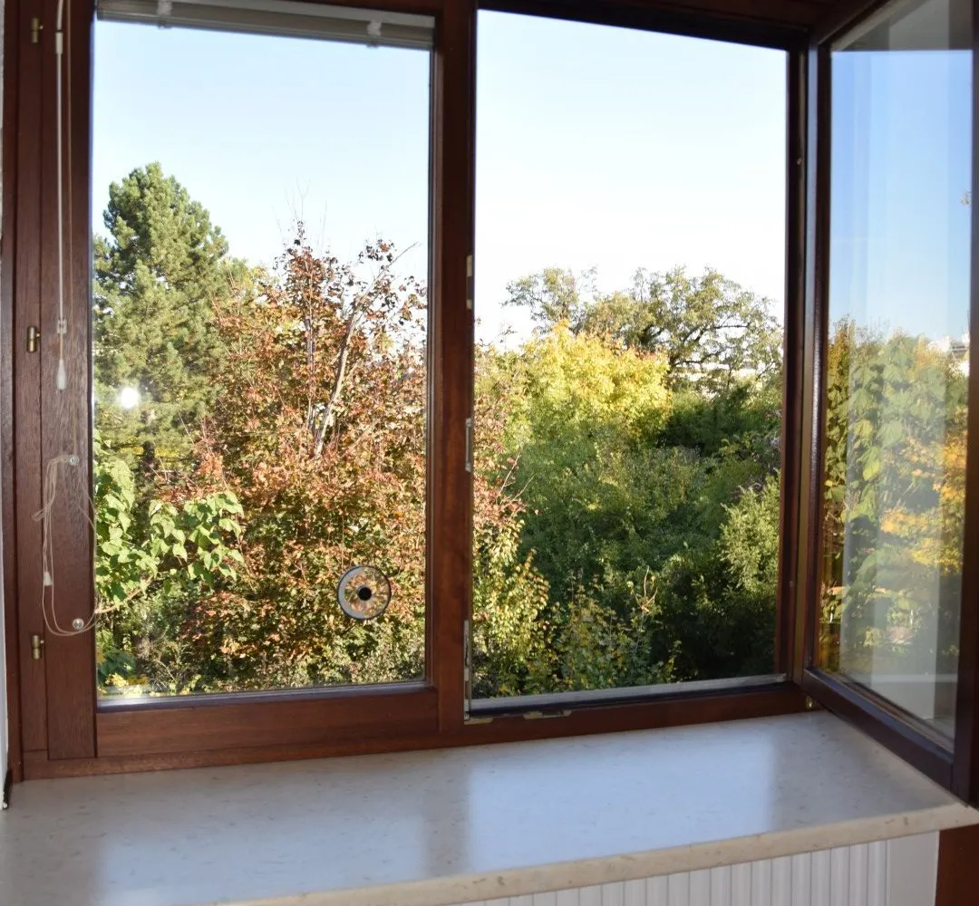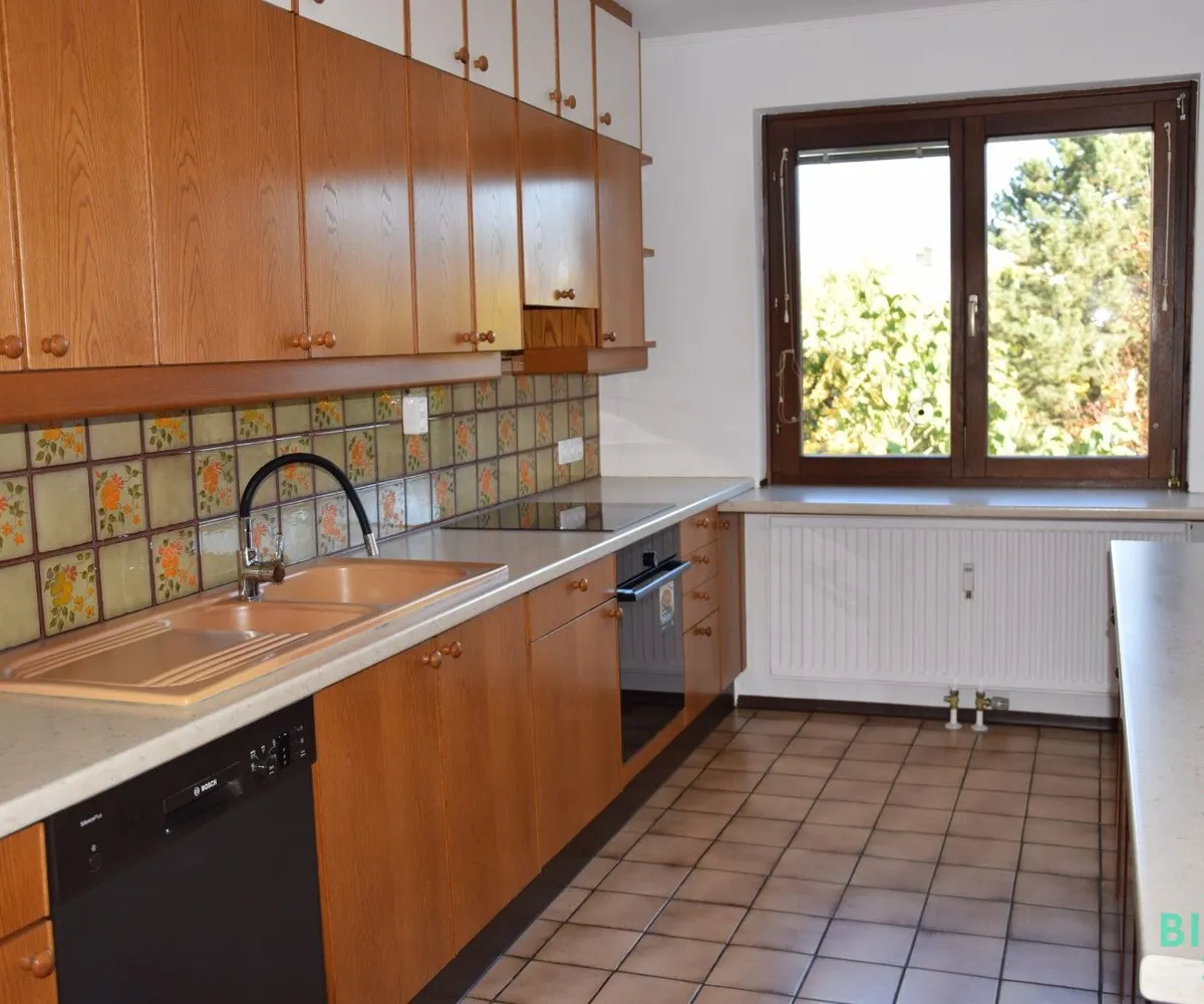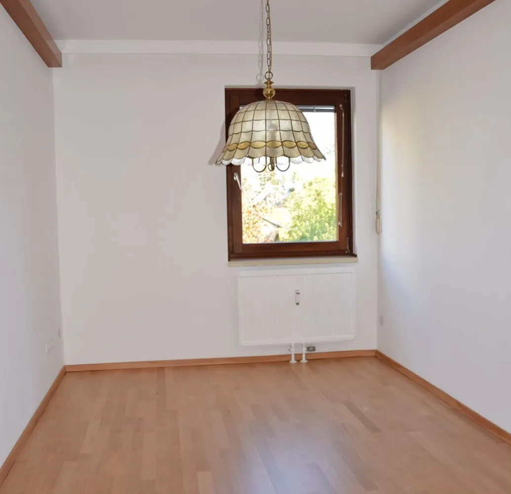 Die Einrichtung ist sehr gepflegt, die Einbaumöbel aus Vollholz und in einem der Zimmer, das auch als Büro Verwendung finden kann, ist ein Doppelschrankbett untergebracht. Die großflächige Fensterfront im Wohnraum wird zusätzlich zu den Innenrollos durch eine elektrischen Aussenrollo beschattet. Von der Küche aus sowie von den drei Zimmern aus hat man einen wunderbaren Grünblick und absolute Ruhelage!