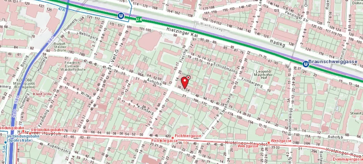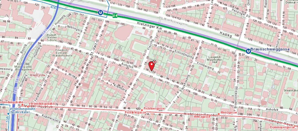Die Lage spricht für sich - rundum Grün und Ruhe, die Geschäfte des täglichen Bedarfs sind fußläufig zu erreichen sowie die U4-Stationen Unter St. Veit oder Braunschweiggasse und die Strassenbahnlinie 10.