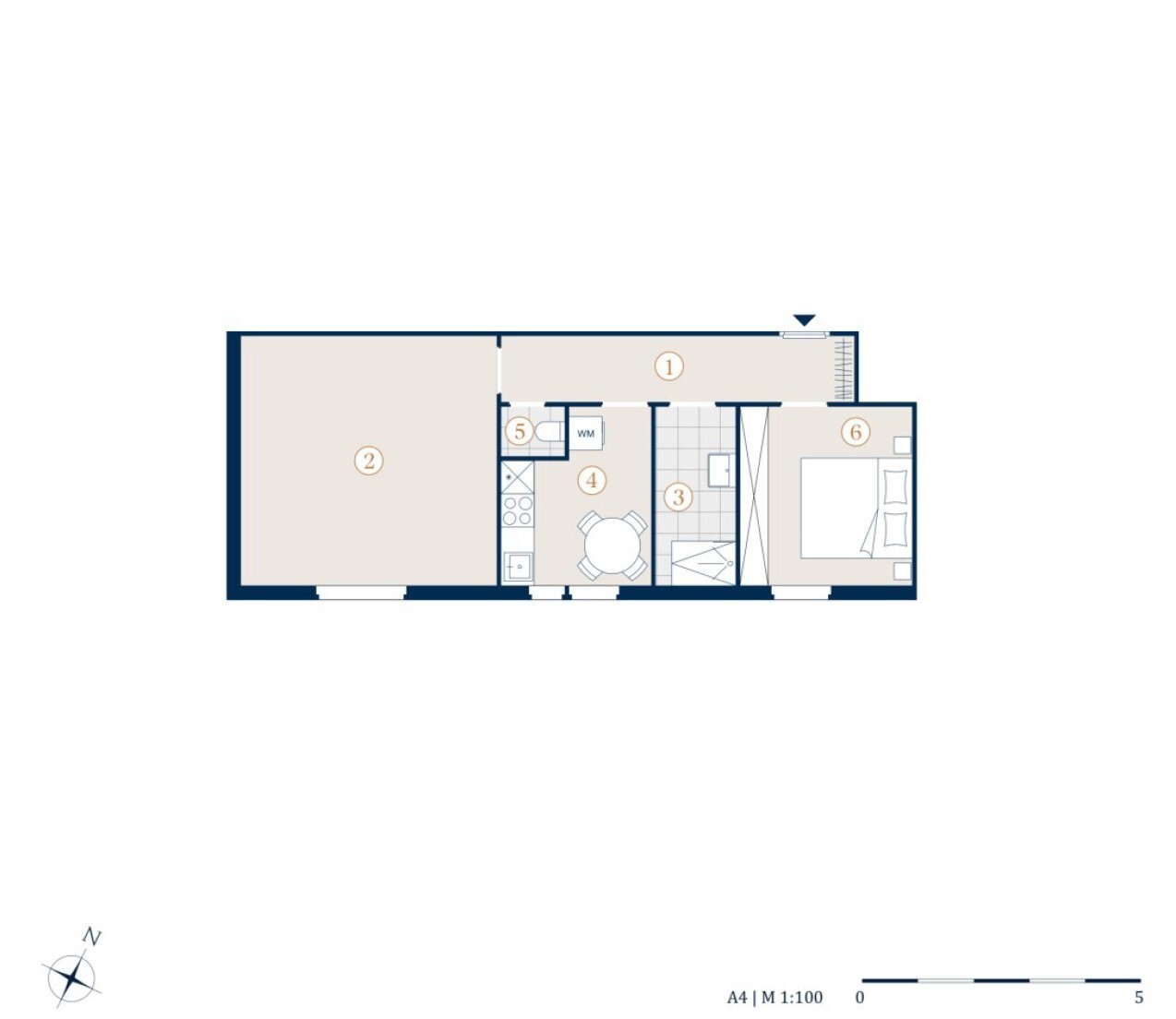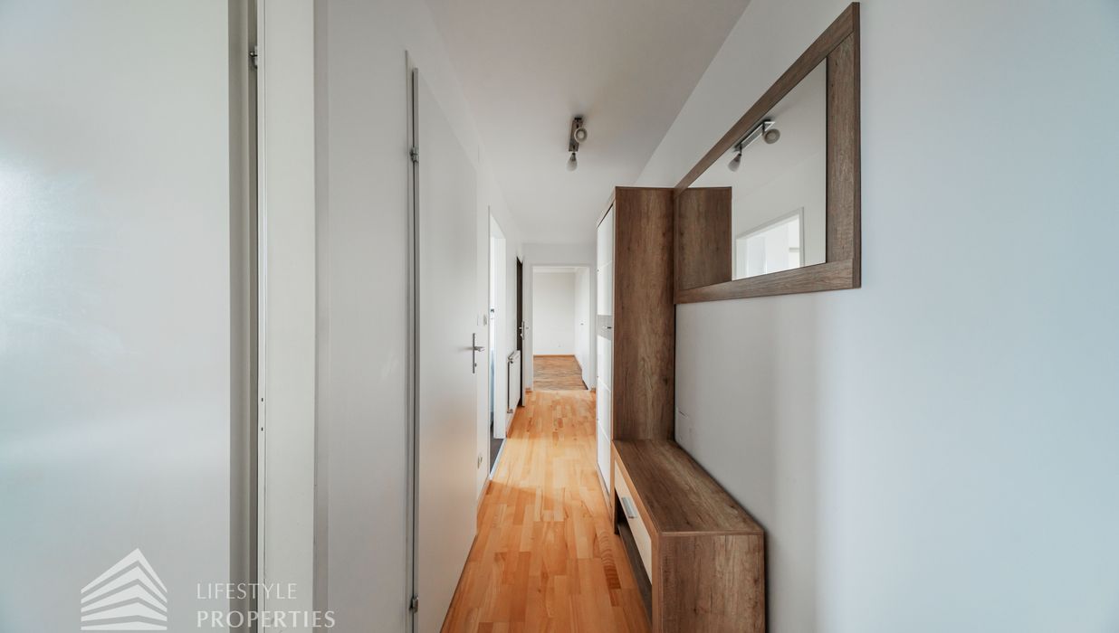 Sie betreten die Wohnung und befinden sich im Vorraum. Gerade durch gelangen Sie in das Schlafzimmer. Im Flur weiter gelangen Sie in die voll ausgestattete Küche, von hier gelangen Sie auch in das Bad. Dieses ist mit einer Dusche und einem Waschbecken ausgestattet. Am Ende des Gangs befindet sich der helle Wohnraum. Das separate WC ist auch vom Vorraum erreichbar.