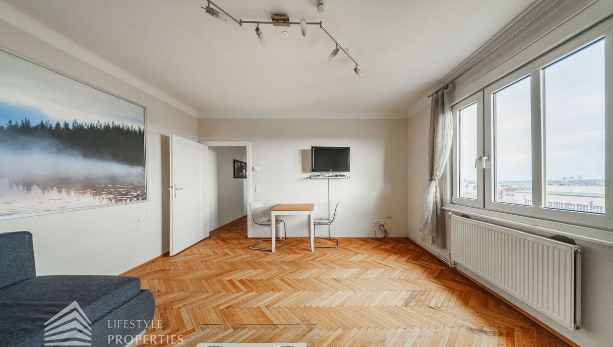 Sie verfügt über ca. 52 m² Wohnfläche und befindet sich im 4. Stock eines im Jahr 1936 erbauten Altbaus. Die Wohnung gliedert sich in einen Vorraum, einen Wohnraum, ein Schlafzimmer, eine Küche, ein Badezimmer und ein separates WC. Die Wohnräume sind mit Fischgrätparkett ausgestattet. Beheizt wird mittels Gas-Etagenheizung.