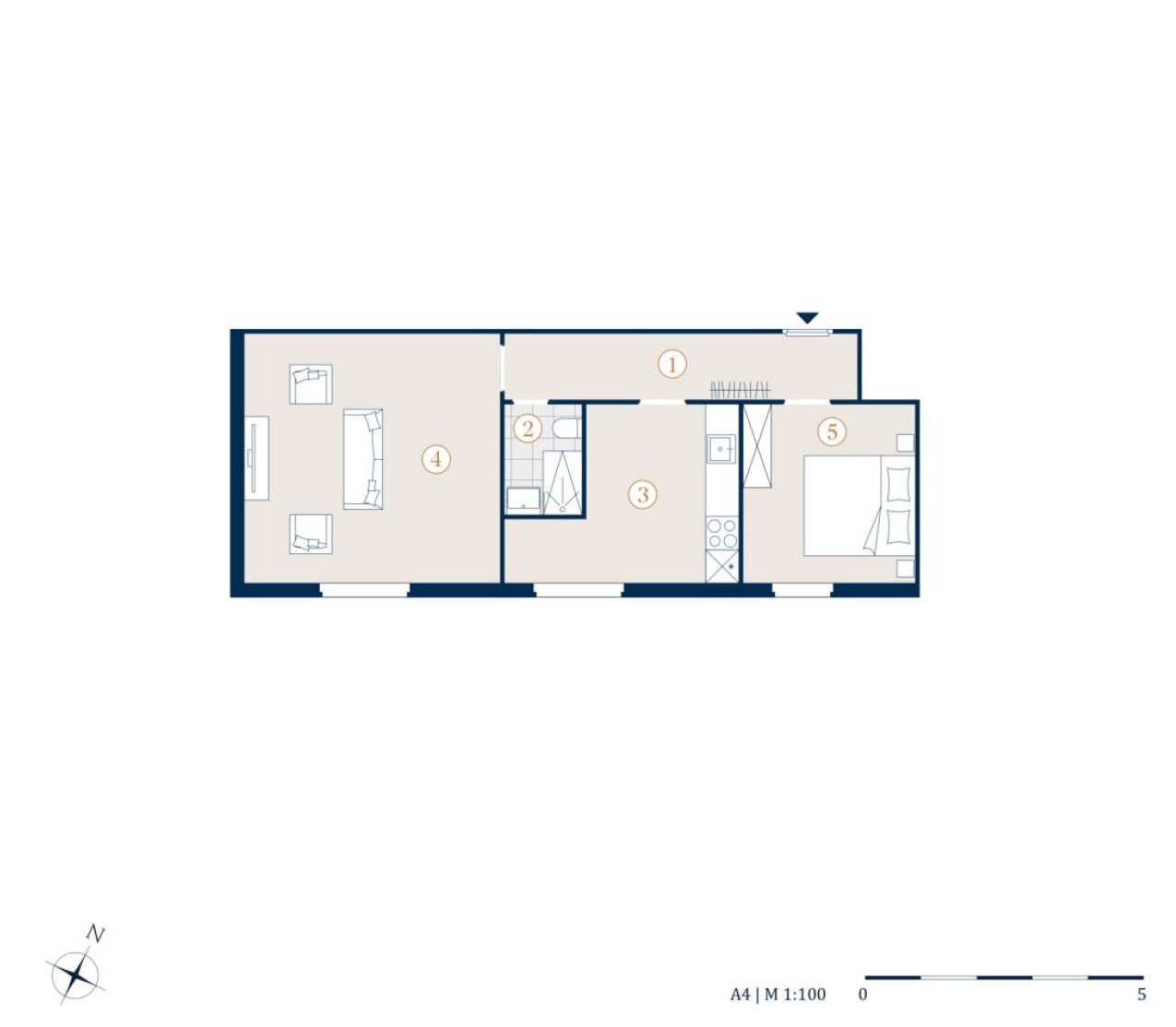 Sie betreten die Wohnung und befinden sich im Vorraum. Gerade durch gelangen Sie in das Schlafzimmer. Im Flur weiter gelangen Sie in die voll ausgestattete Küche, von hier gelangen Sie auch in das Bad. Dieses ist mit einer Dusche und einem Waschbecken ausgestattet. Am Ende des Gangs befindet sich der helle Wohnraum. Das separate WC ist auch vom Vorraum erreichbar.