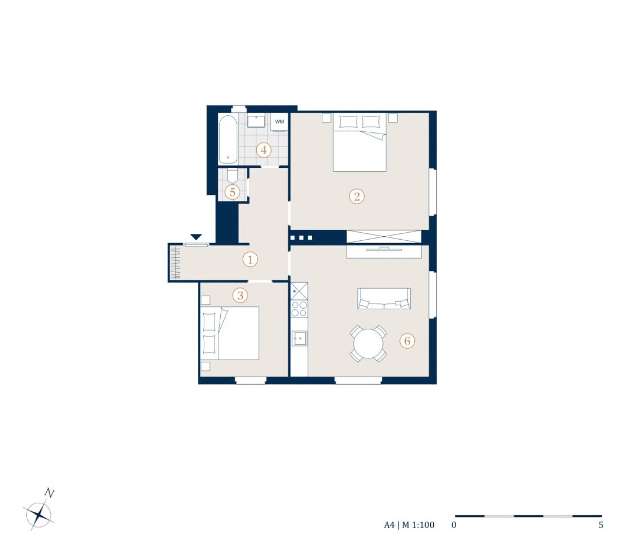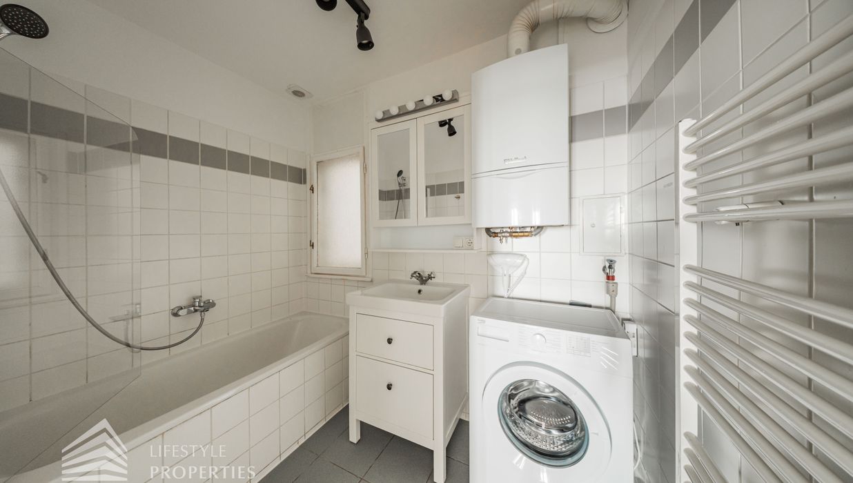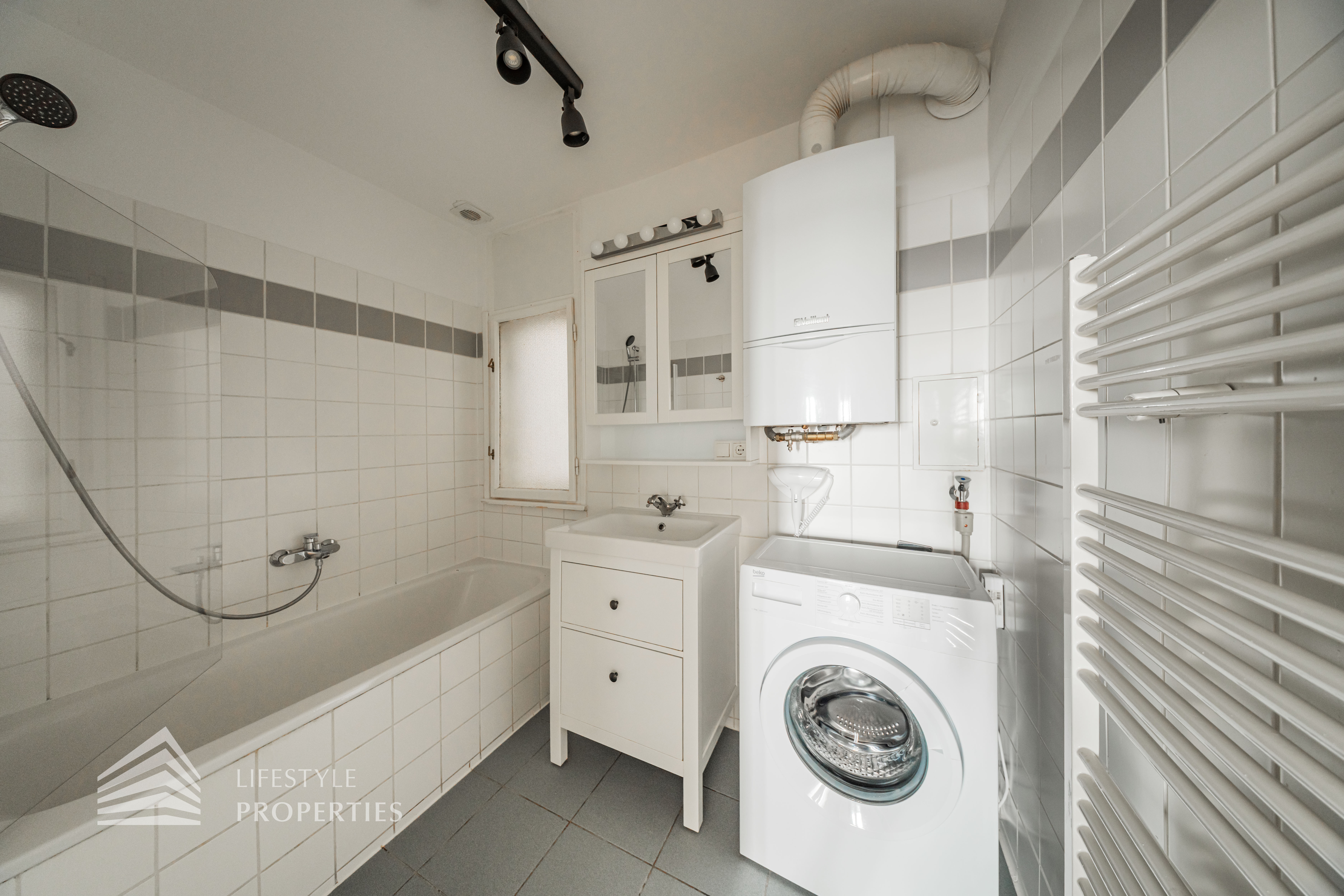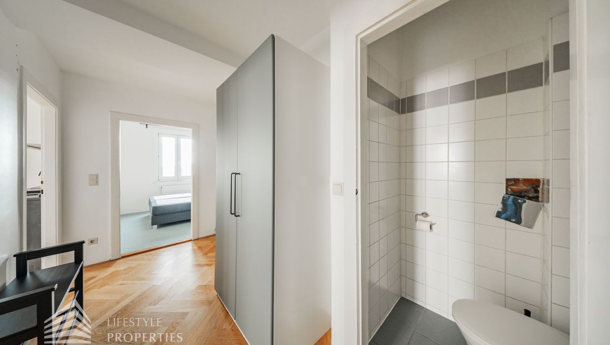 Sie betreten die Wohnung und befinden sich im Vorraum. Rechts befindet sich eines der Zimmer, gerade durch gelangen Sie in die geräumige Wohnküche. Weiter den Flur runter rechts, befindet sich das zweite Zimmer. Das Badezimmer verfügt über ein Fenster und ist mit einer Badewanne, einem Waschbecken, einem Waschmaschinenanschluss und einem Handtuchtrockner ausgestattet. Das separate WC befindet sich auch im Vorraum.