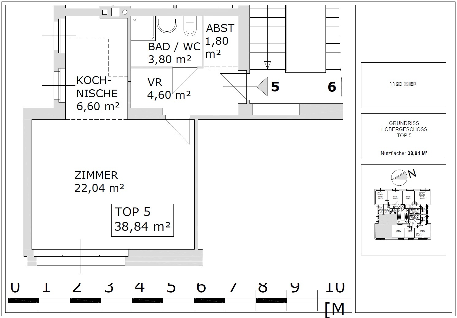Die Wohnung befindet sich in einem Neubau, liegt im 1. Stock und ist bequem über einen Lift erreichbar. Sie verfügt über eine Größe von ca. 38 m² und gliedert sich in einen Vorraum, einen Wohn- Schlafraum mit Kochnische, ein Bad mit WC und einen Abstellraum.