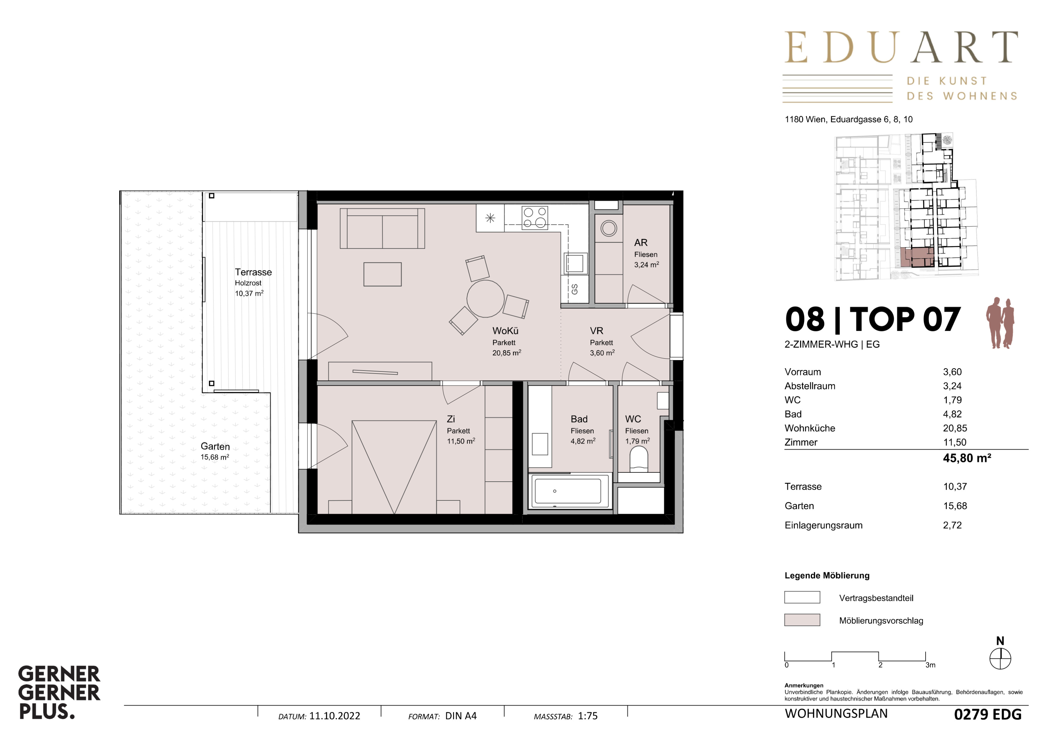 Die Wohnung befindet sich im Erdgeschoss und verfügt über einen Wohnraum mit voll ausgestatteter Küche, ein separat begehbares Schlafzimmer, ein Badezimmer mit Badewanne, ein separates WC sowie einen Vorraum und einen Abstellraum mit Waschmaschinenanschluss. Die westseitige Terrasse und der gemütliche, westseitige Garten lädt zu gemütlichen Stunden im Freien ein.