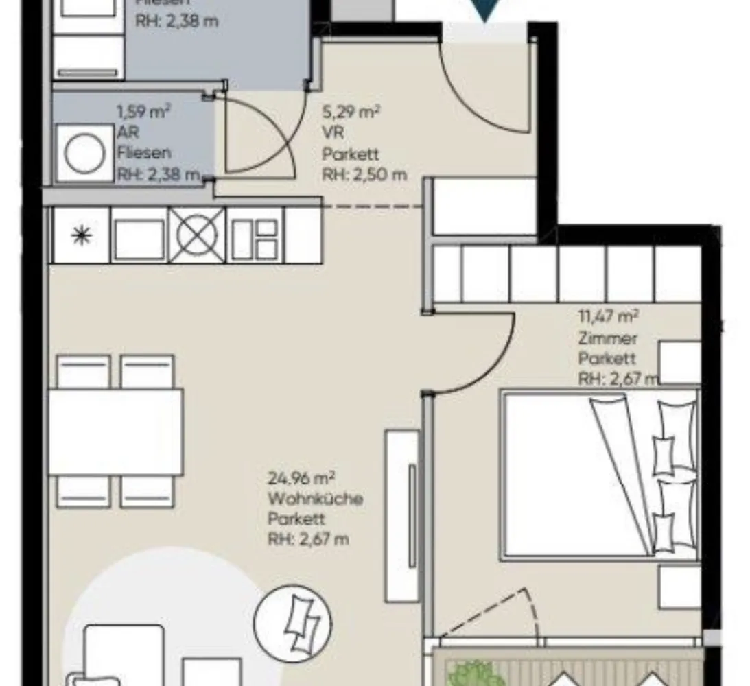 Die Wohnung besteht aus 2 Zimmern, mit knapp 49m² Wohnfläche sowie einer eigenen Loggia mit ca. 6m² und gliedert sich in folgende, funktionelle Raumaufteilung: