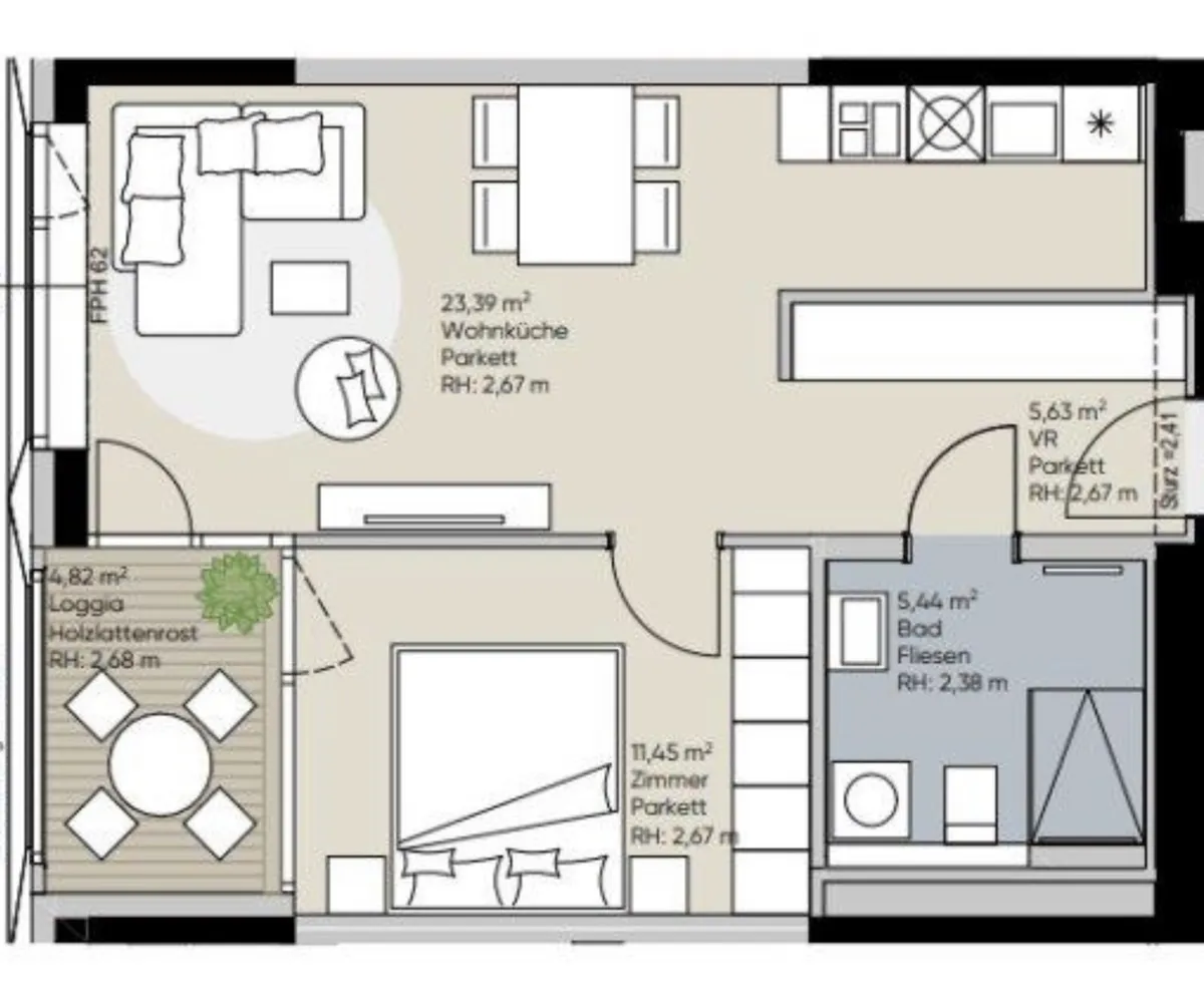 Die Wohnung besteht aus 2 Zimmern, mit knapp 46m² Wohnfläche sowie einer eigenen Loggia mit ca. 6m² und gliedert sich in folgende, funktionelle Raumaufteilung: