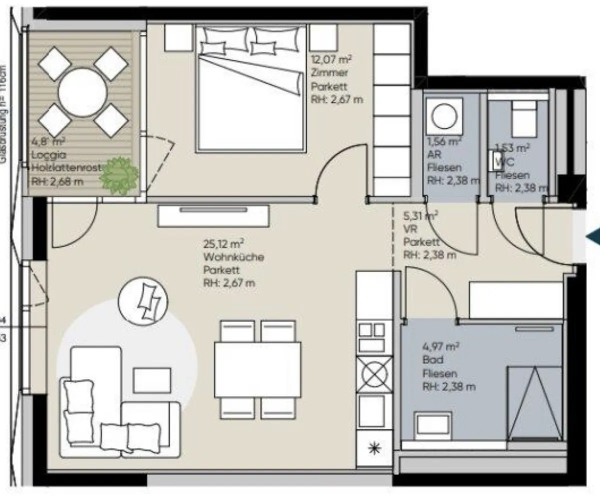 Die Wohnung besteht aus 2 Zimmern, mit knapp 51m² Wohnfläche sowie einer eigenen Loggia mit ca. 5m² und gliedert sich in folgende, funktionelle Raumaufteilung:
