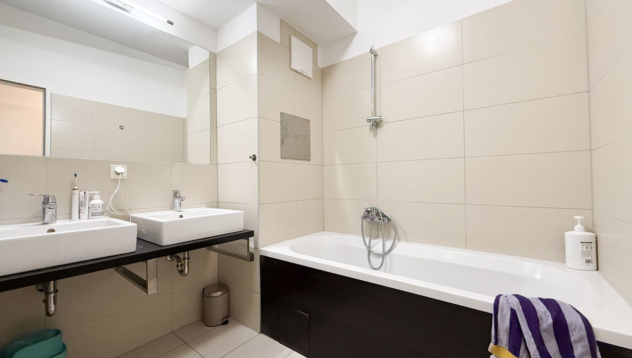 Badezimmer mit Badewanne, zwei Waschbecken und Waschmaschinenanschluss