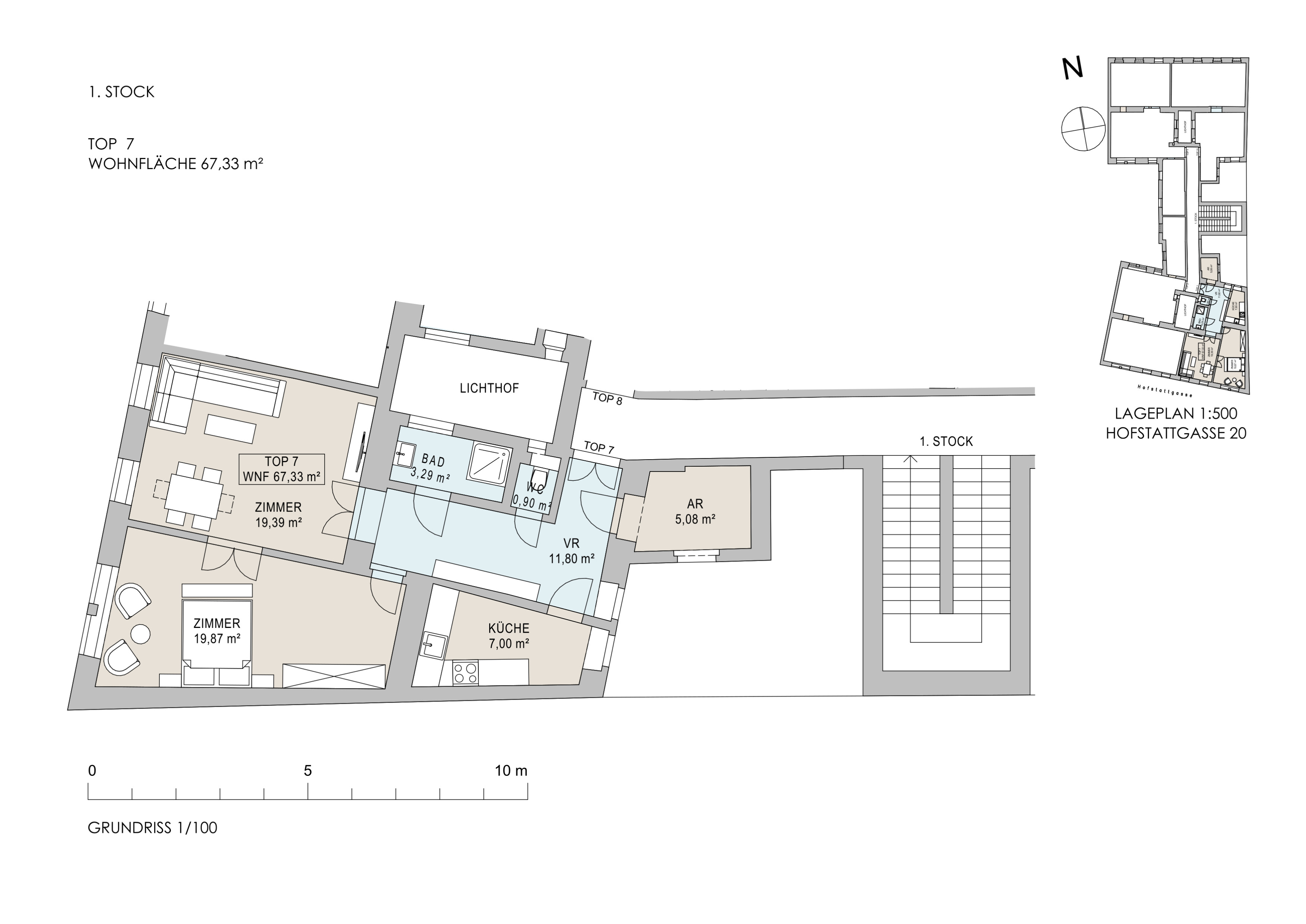 Die Hofstattgasse liegt ruhig, aber zentral – mit idealer Anbindung und viel Grün in der Umgebung.