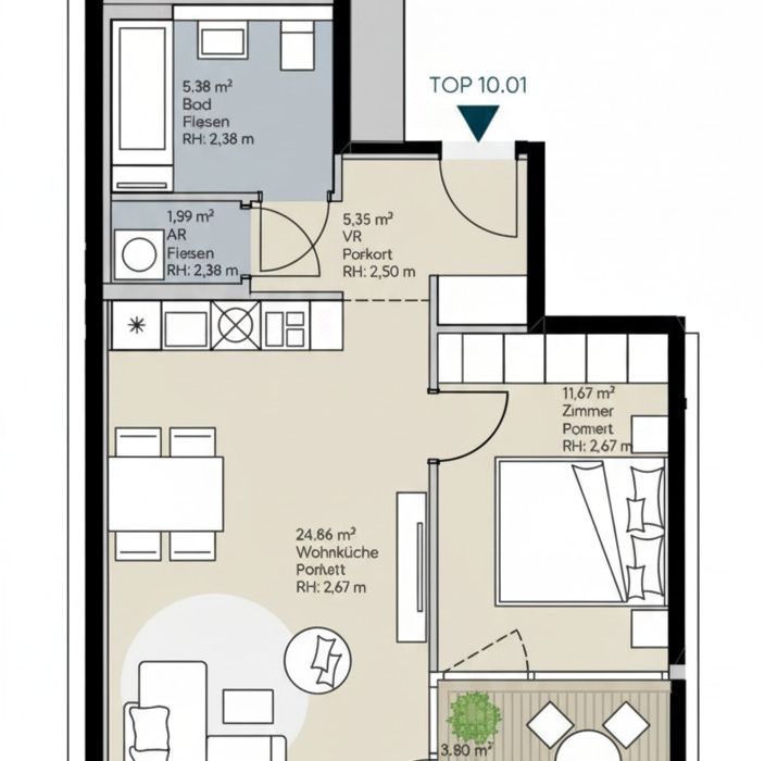 Diese Wohnung verzaubert mit ihrem luftigen, charmanten Wohnbereich sowie einer durchdachten Raumaufteilung . Gleich beim Eingang befindet sich eine kompakte Garderobennische sowie separate Zugänge zum Badezimmer und Abstellraum. Vom Vorraum aus gelangt man in den hellen Koch-/Ess-/Wohnbereich , der vielfältige Einrichtungskonzepte ermöglicht. Vom Wohnzimmer aus erreicht man die fast 6 m² große Loggia , auf der sich eine gemütliche Unterhaltungsecke einrichten lässt. Das separat gelegene Schlafzimmer bietet ausreichend Platz für ein Bett und einen Einbauschrank .