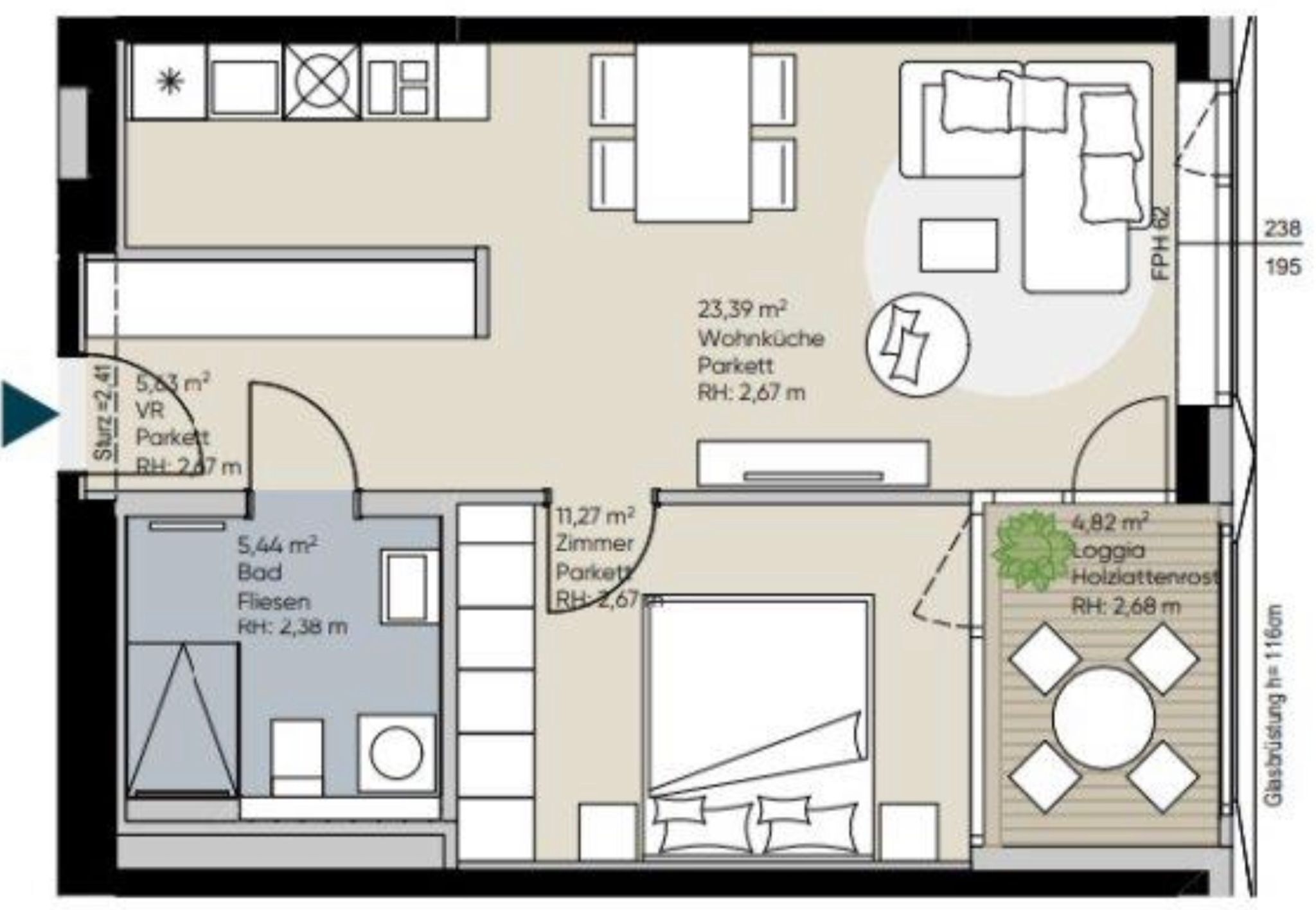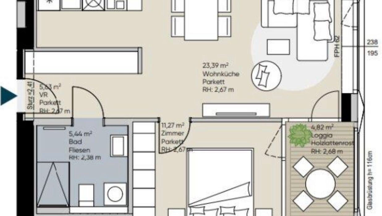Diese modern und hochwertig ausgestattete Wohnung überzeugt mit einem durchdachten Raumkonzept : vom Vorraum mit Nische für Einbaumöbel gelangt man in das luftige, sonnendurchflutete Wohnzimmer . Die Küche liegt separat hinter der Vorraumnische, wodurch der Wohn-Essbereich besonders komfortabel bleibt. Vom Wohnbereich aus gelangt man auf die Loggia mit ca. 5 m², ideal, um den Sonnenuntergang in Ruhe zu genießen . Das separat gelegene Schlafzimmer bietet Gelassenheit und Komfort. Das Bad mit Dusche befindet sich direkt daneben und macht den Alltag besonders angenehm.