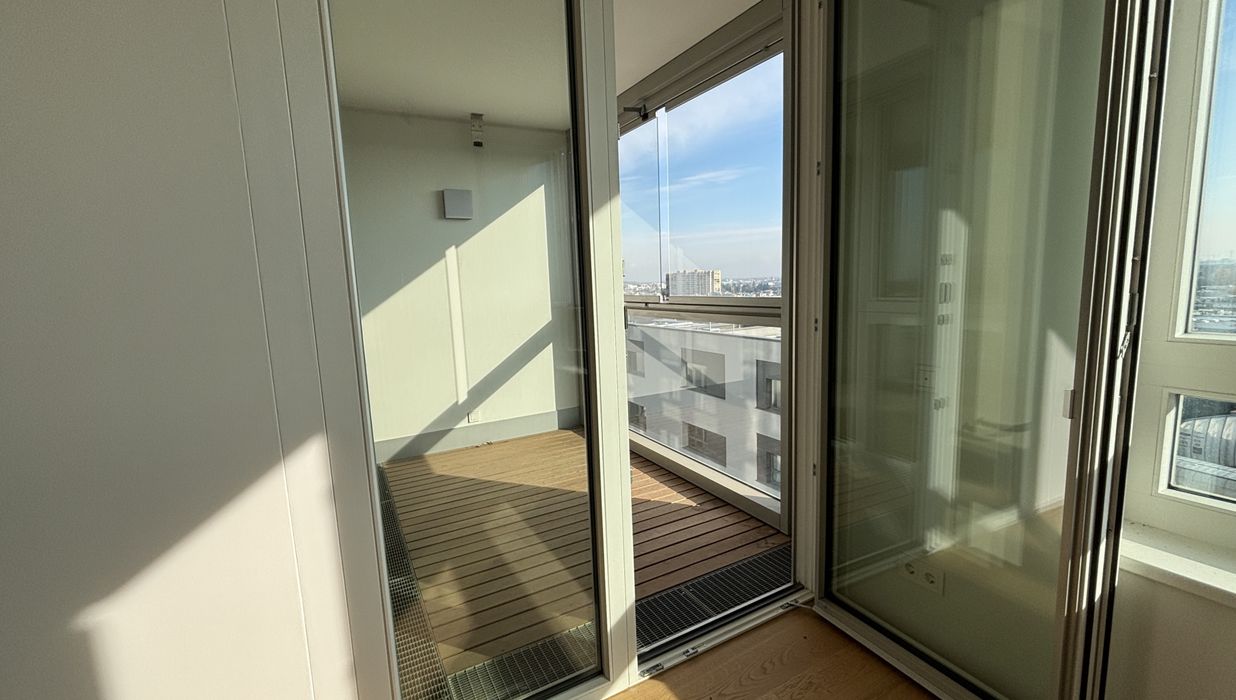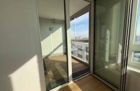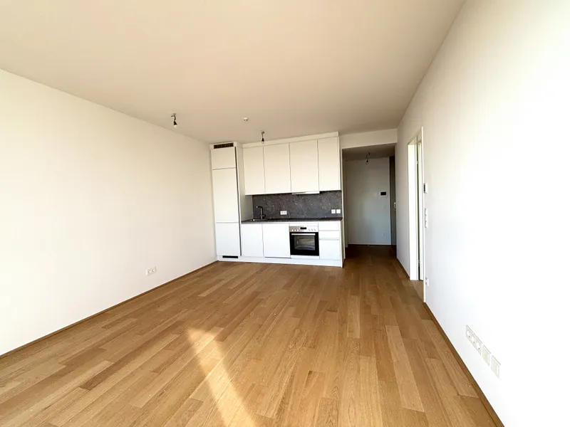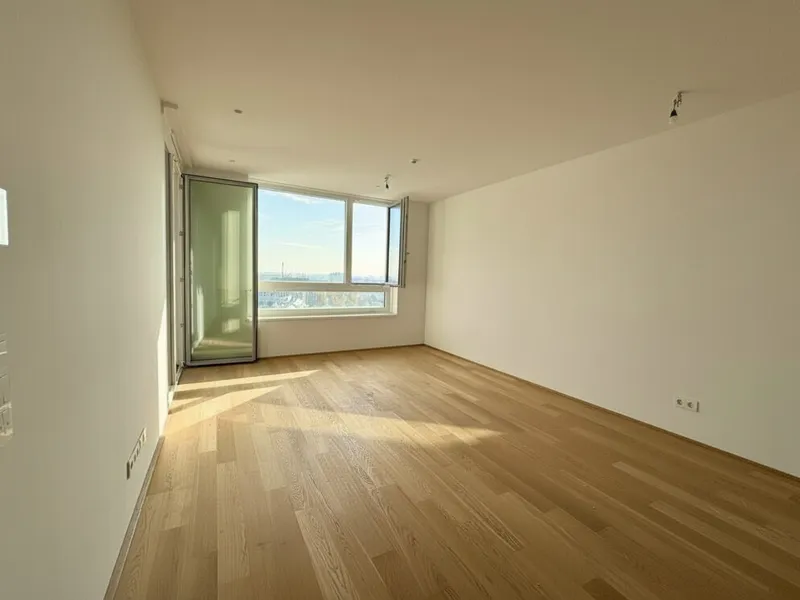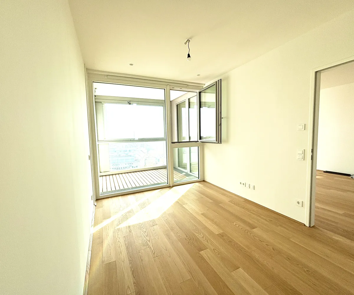 Top 112 befindet sich im 12. Obergeschoss und schenkt luftige, helle Räumlichkeiten . Vom Vorraum aus hat man direkten Zugang zum Bad , zum Abstellraum sowie zur Wohnküche . Der Wohnraum verfügt über eine moderne Einbauküche und einen Ausgang zur Loggia , auf der sich eine gemütliche Frühstücksecke einrichten lässt. Das Schlafzimmer bietet ca. 11 m² Fläche und begeistert mit einem schönen Ausblick durch bodentiefe Fenster .