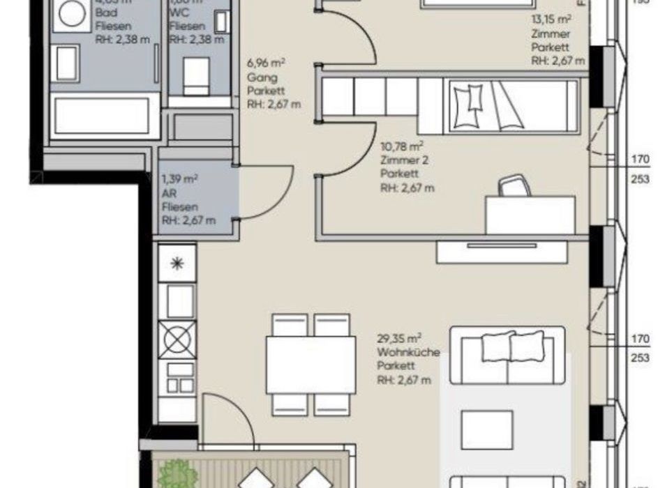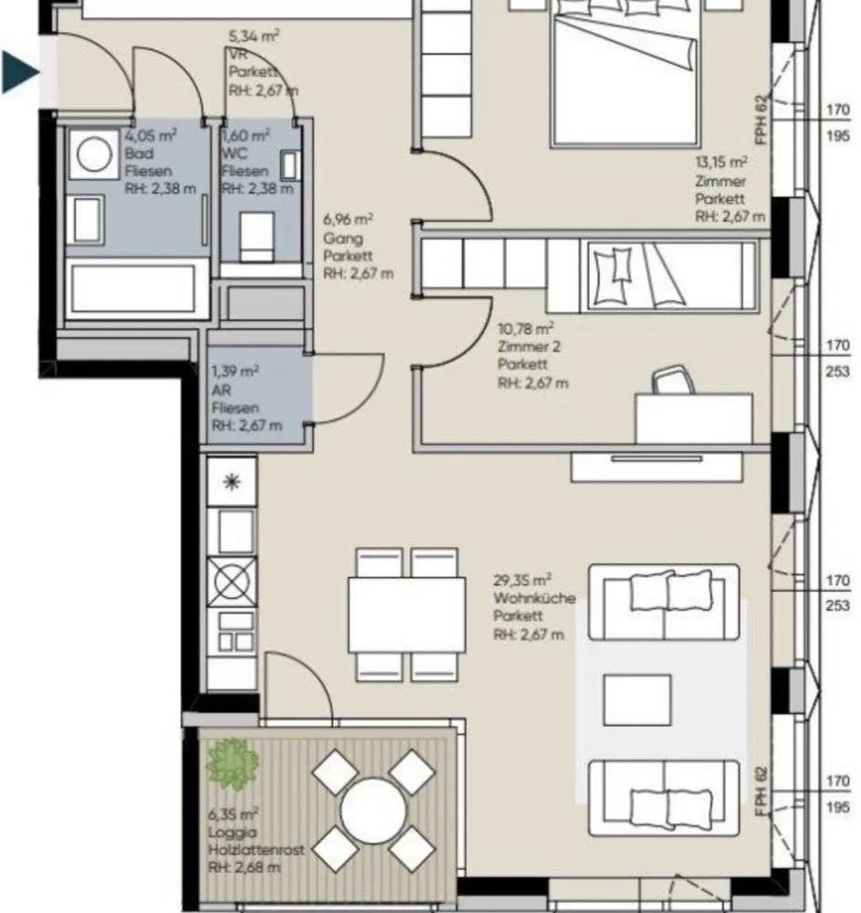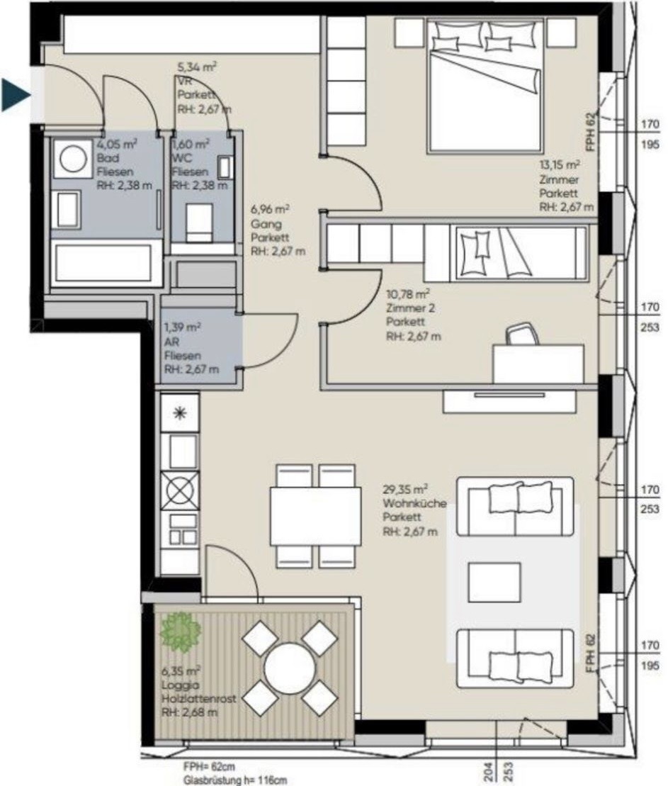 Top 111 ist eine perfekte Wohnung für eine kleine Familie , da sie über zwei Schlafzimmer verfügt. Im Vorraum ist ausreichend Platz für einen Einbauschrank , außerdem befinden sich hier die Zugänge zu Badezimmer und WC . Ein luftiger Gang führt zu beiden Schlafzimmern sowie zum Abstellraum und weiter in die helle, offene Wohnküche . Vom Wohnbereich gelangt man auf die ca. 6 m² große Loggia , die sich wunderbar als gemütlicher Außenbereich gestalten lässt.