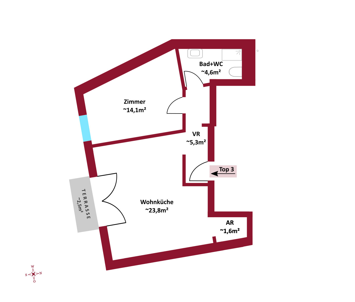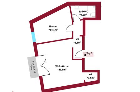 Top 8: ca. 40 m² WNFL, monatliche Miete beträgt 812,-- Euro (inkl. Betriebskosten, 10% Umsatzsteuer)
