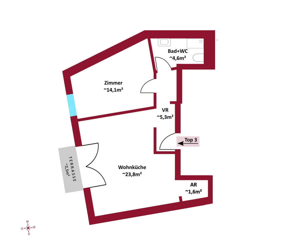 Top 4: ca. 56m² WNFL , monatliche Miete beträgt 1075,-- Euro (inkl. Betriebskosten, 10% Umsatzsteuer)