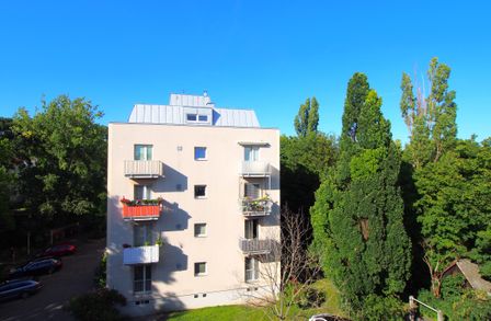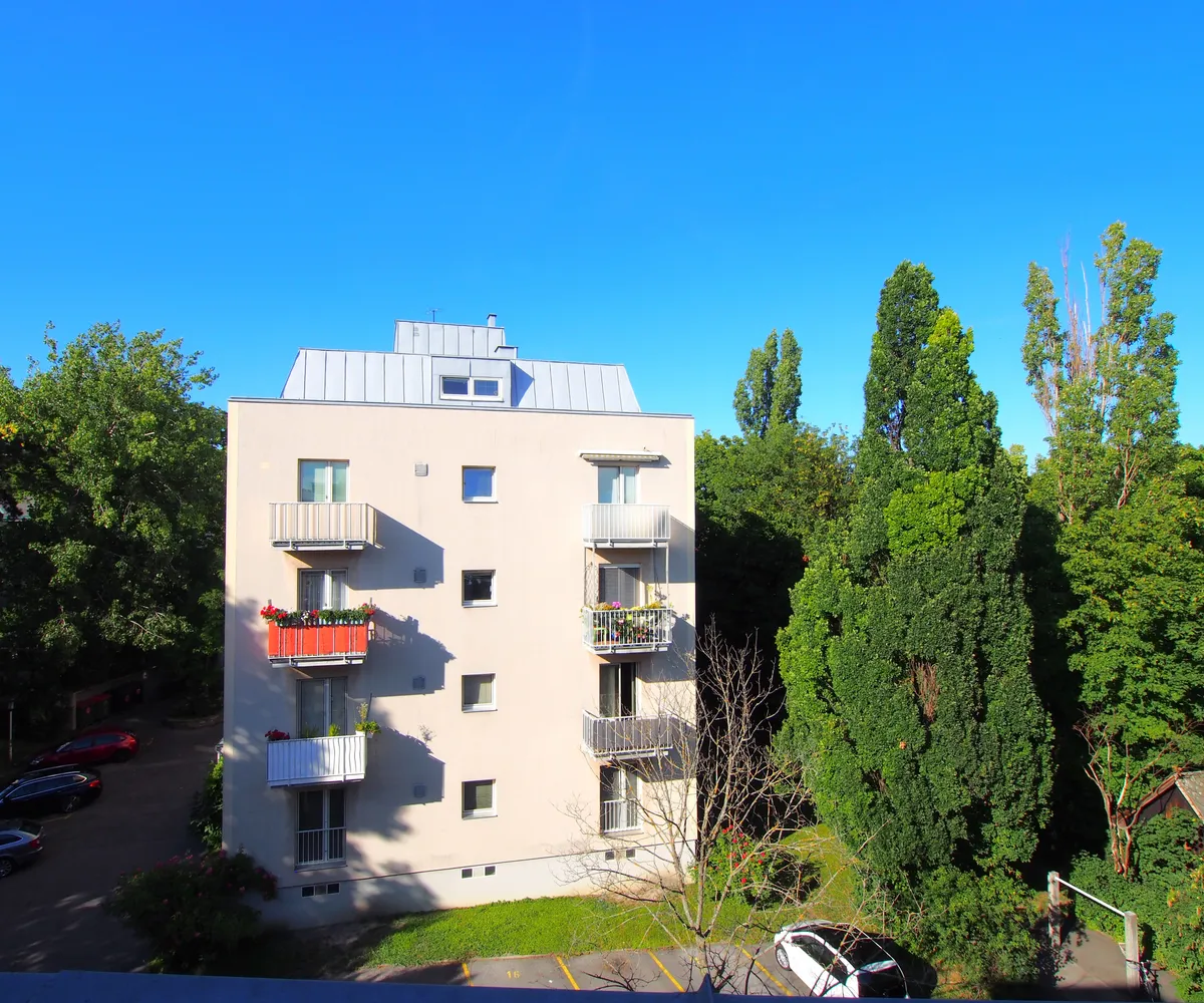 Die Wohnung liegt inmitten einer ruhigen Wohnhausanlage mit 4 Häusern. Die großzügige Anordnung der Häuser erlaubt jeder Wohnung einen Blick ins Grüne.