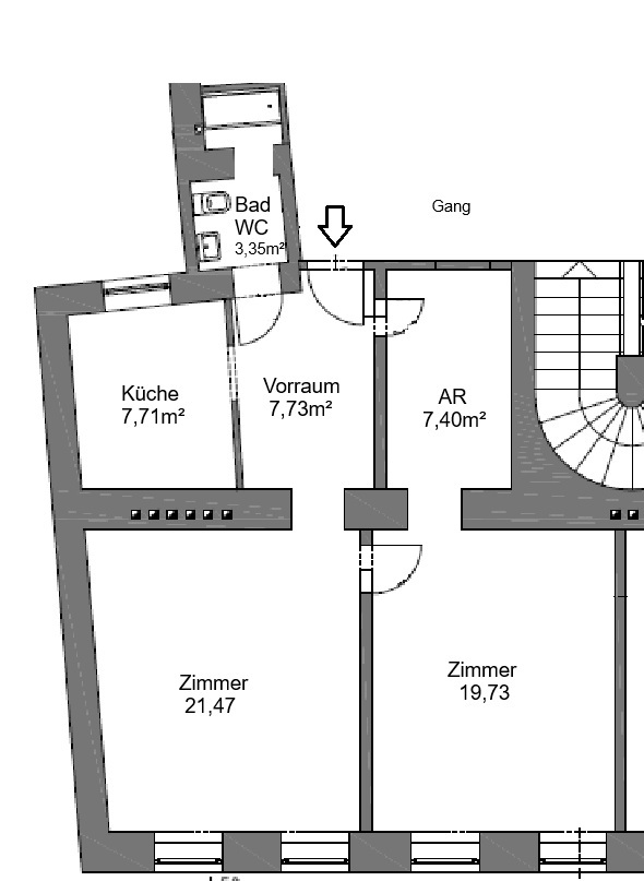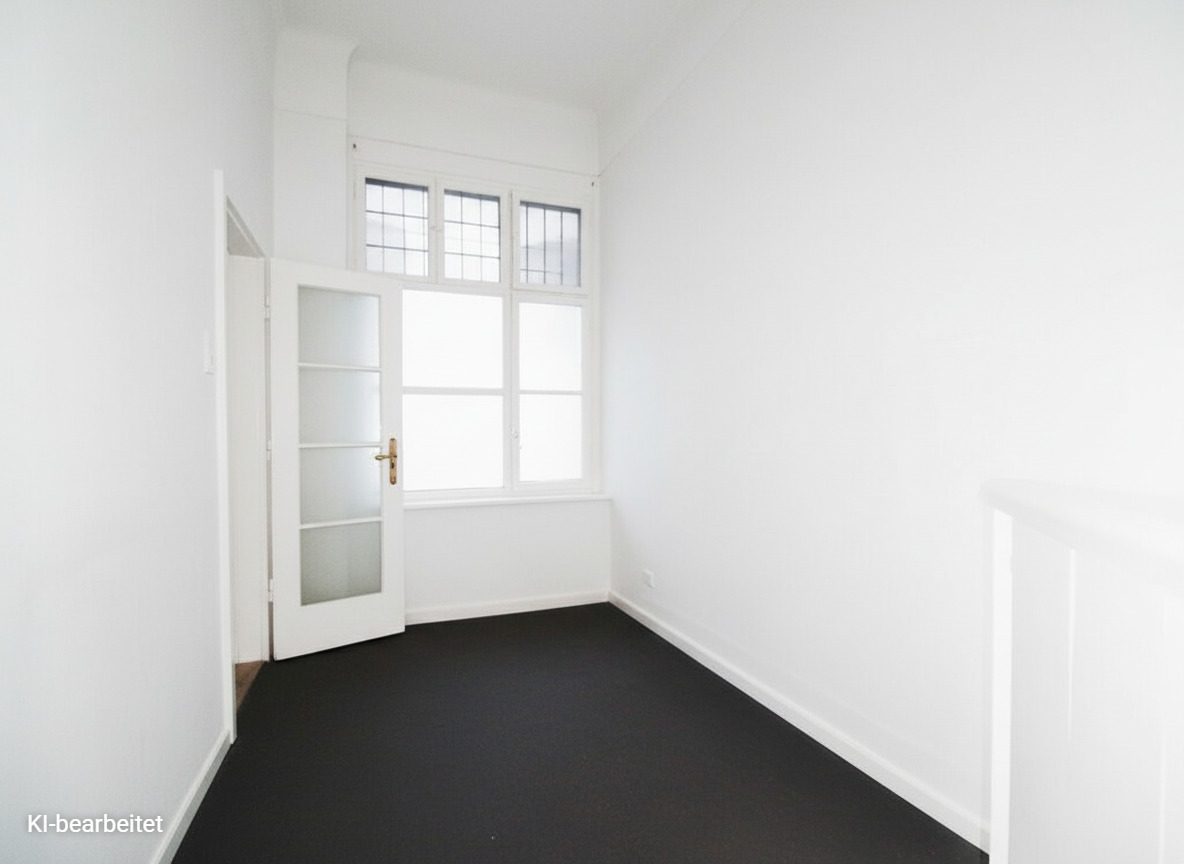 Zwei große Zimmer, eine Küche und der Abstellraum bieten vielfältige Möglichkeiten - durch Verlegung der Küche in den Wohnbereich könnten zwei Schlafzimmer geschaffen werden.