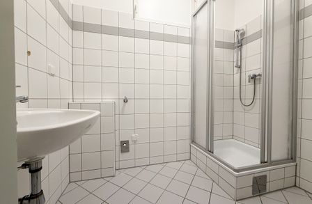 Badezimmer – modern ausgestattet mit Dusche , Waschbecken und Waschmaschinenanschluss