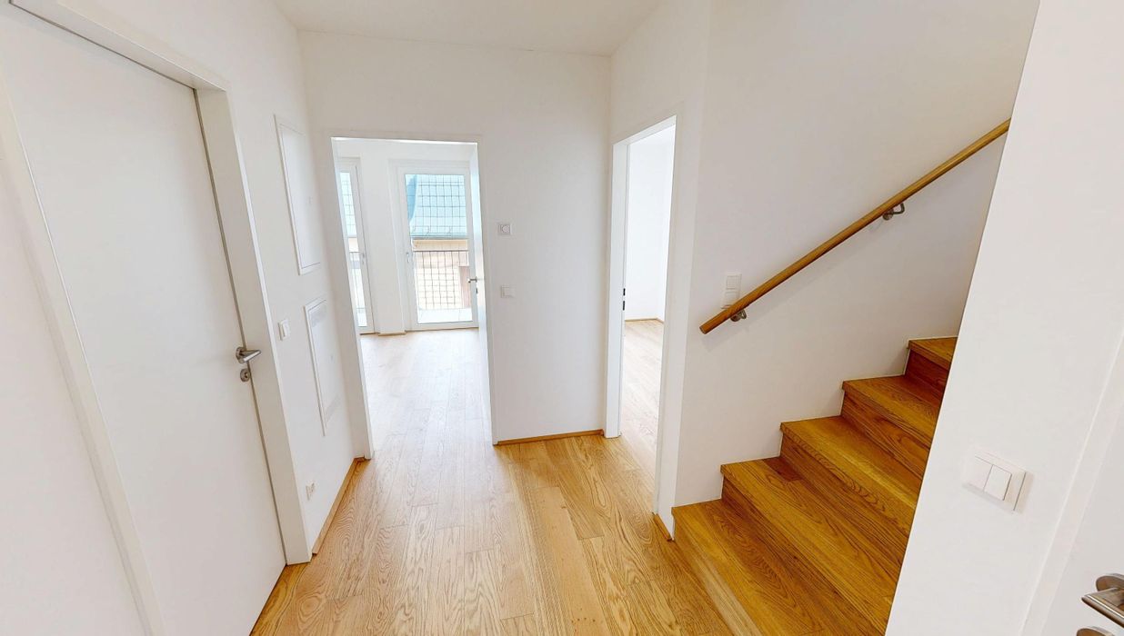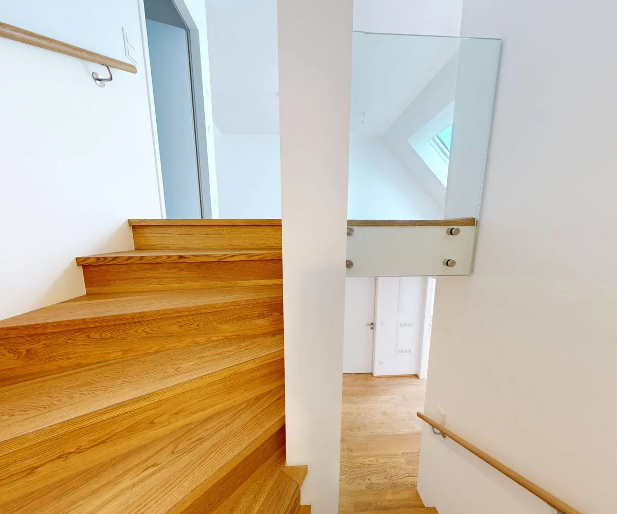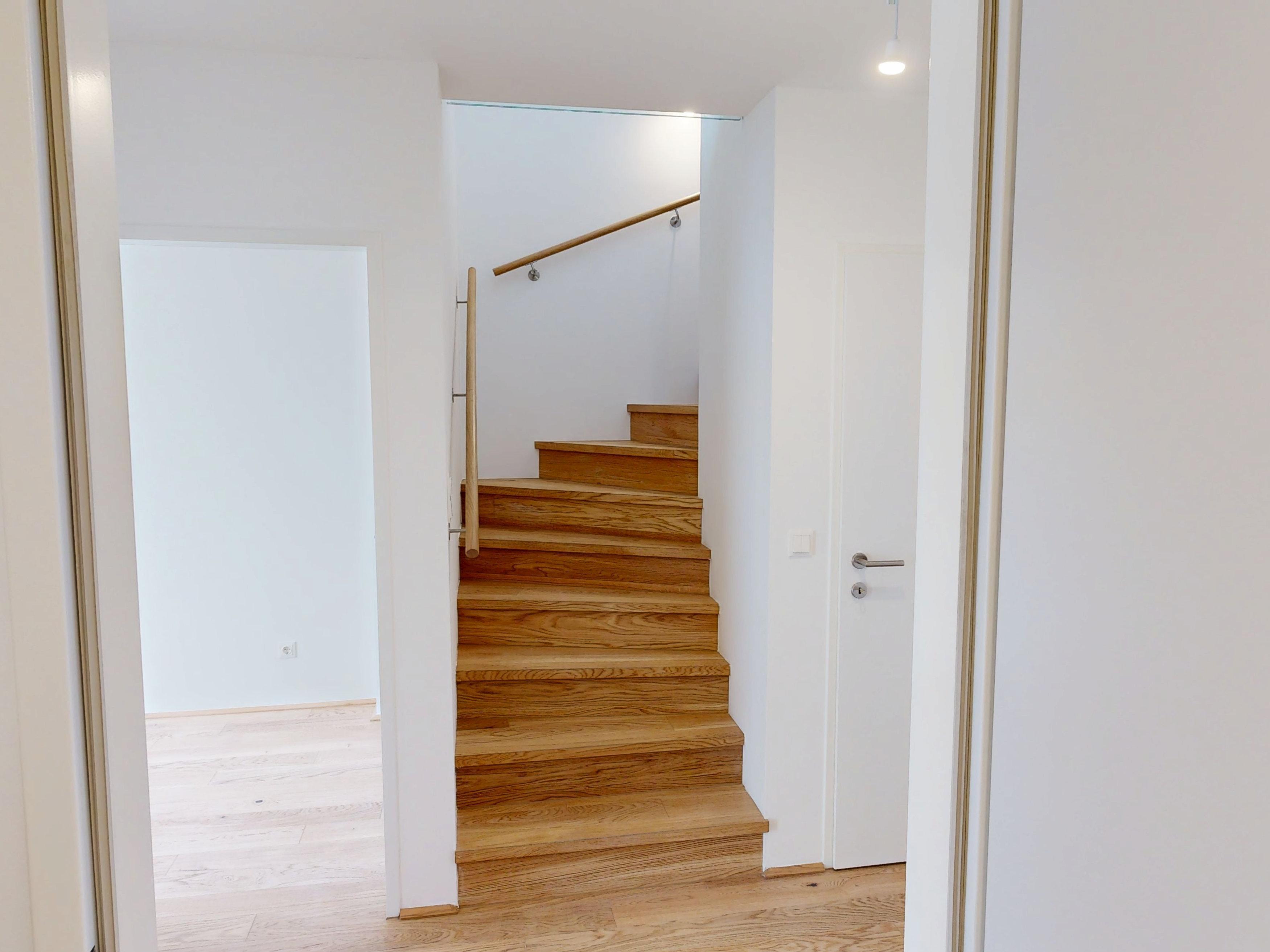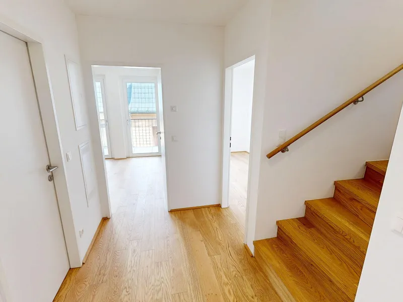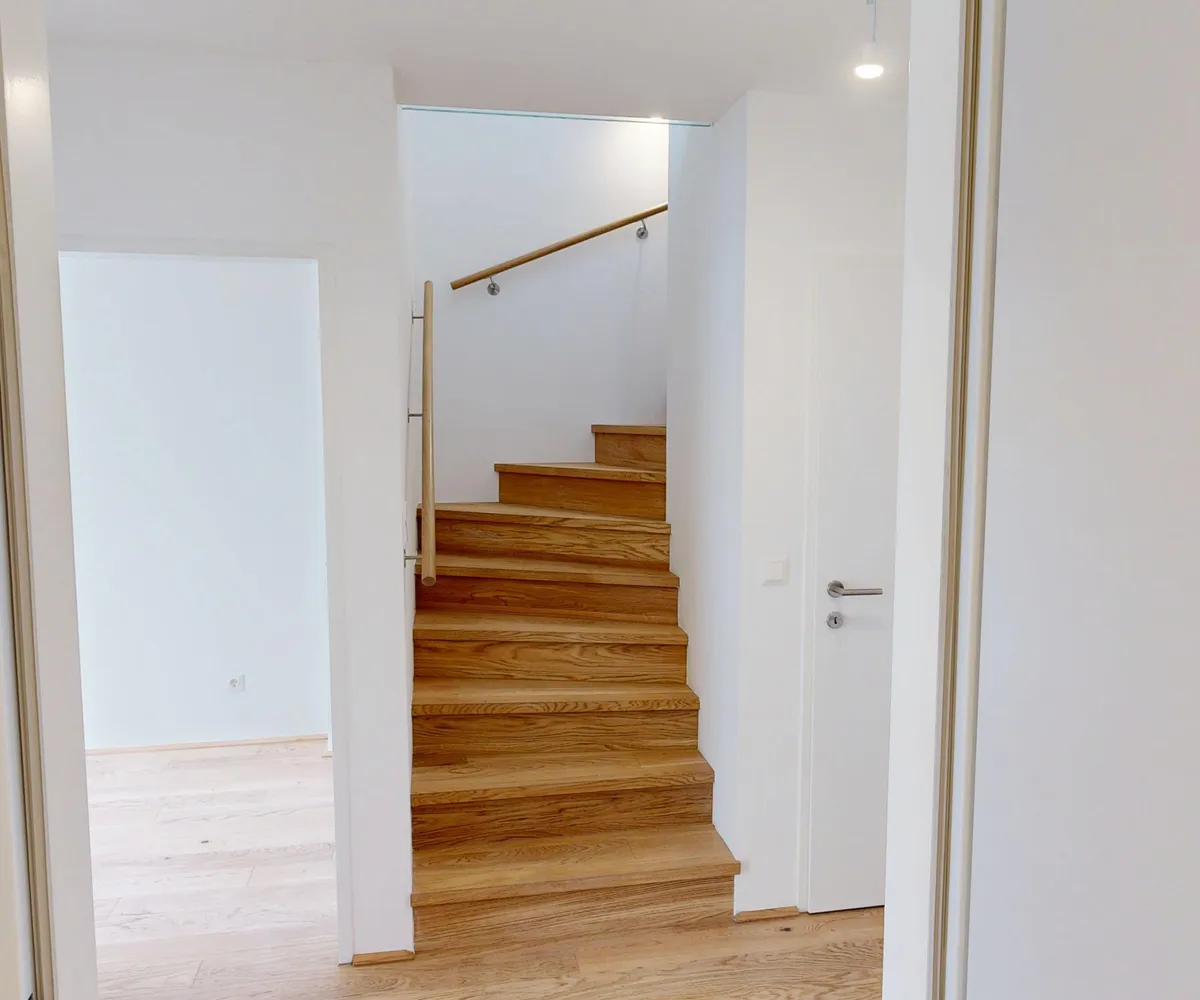 Über die Treppe geht’s hinauf in den großzügigen Wohn- und Essbereich. Offen gestaltet, mit viel Licht und Zugang zu einem weiteren Balkon. Ihrem persönlichen Platz im Freien. Auch ein zweites WC mit großzügigen Stauraum befindet sich auf dieser Etage.