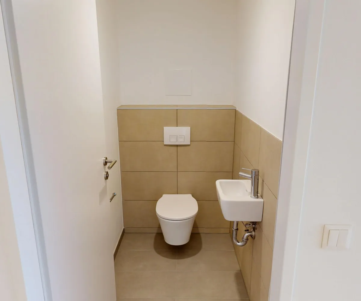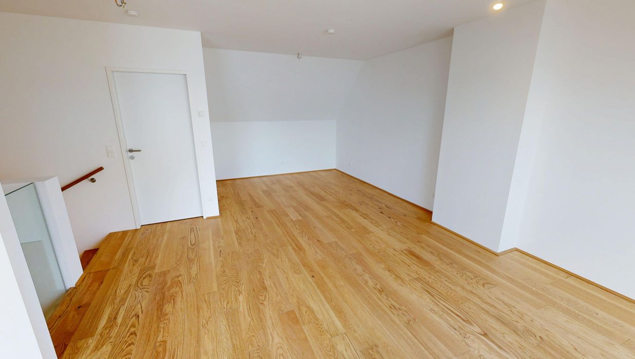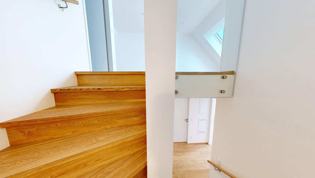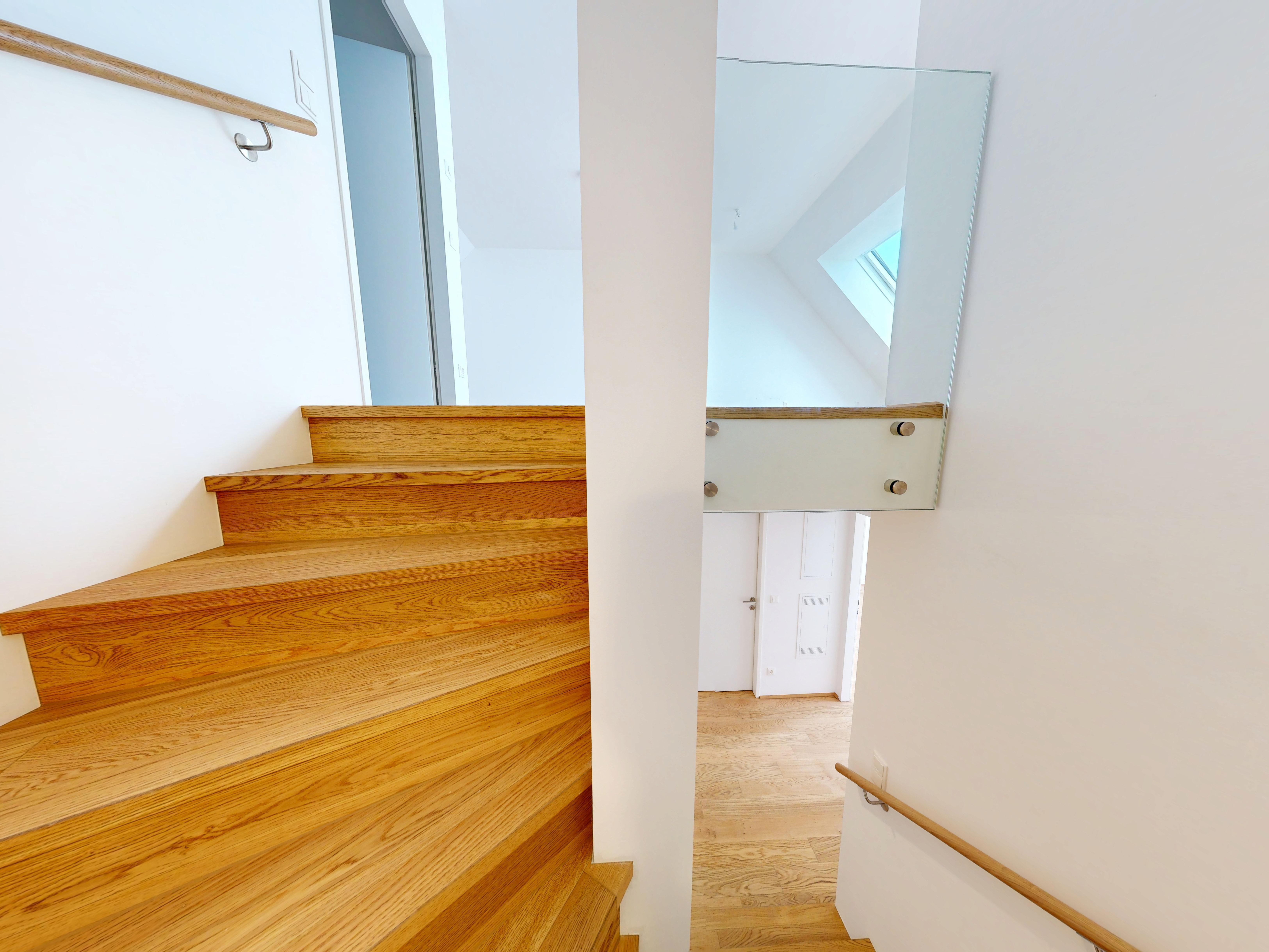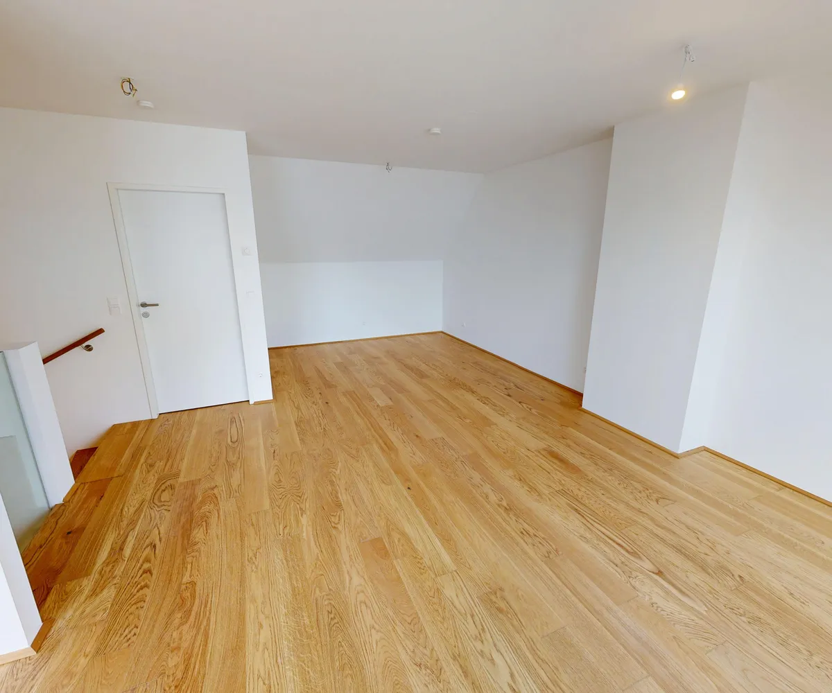 Über die Treppe geht’s hinauf in den großzügigen Wohn- und Essbereich. Offen gestaltet, mit viel Licht und Zugang zu einem weiteren Balkon. Ihrem persönlichen Platz im Freien. Auch ein zweites WC mit großzügigen Stauraum befindet sich auf dieser Etage.