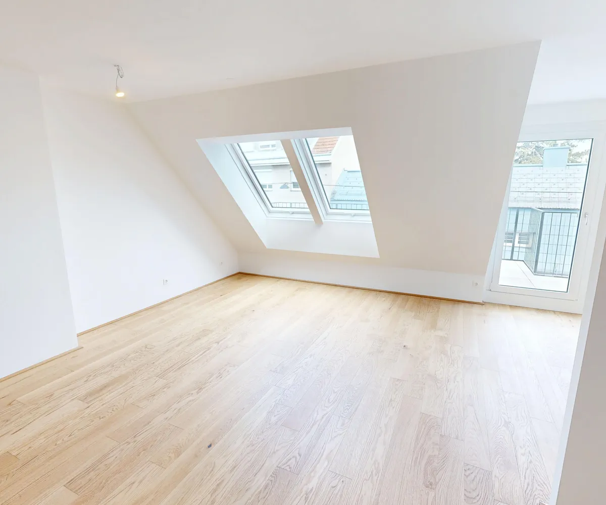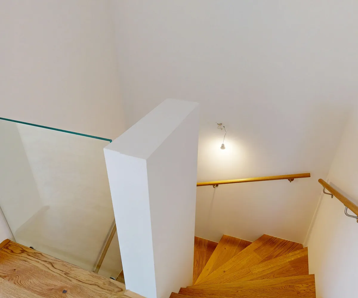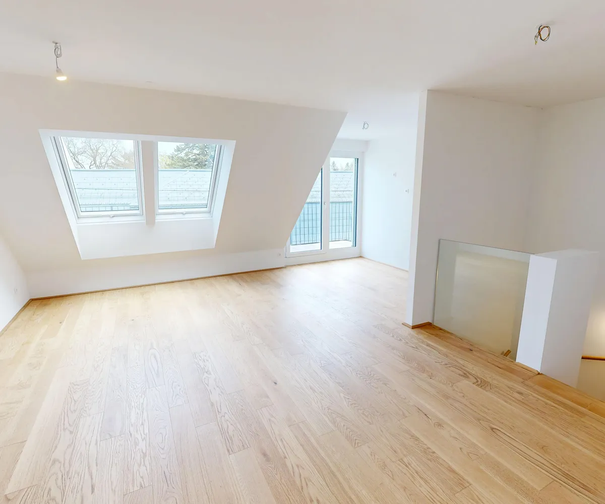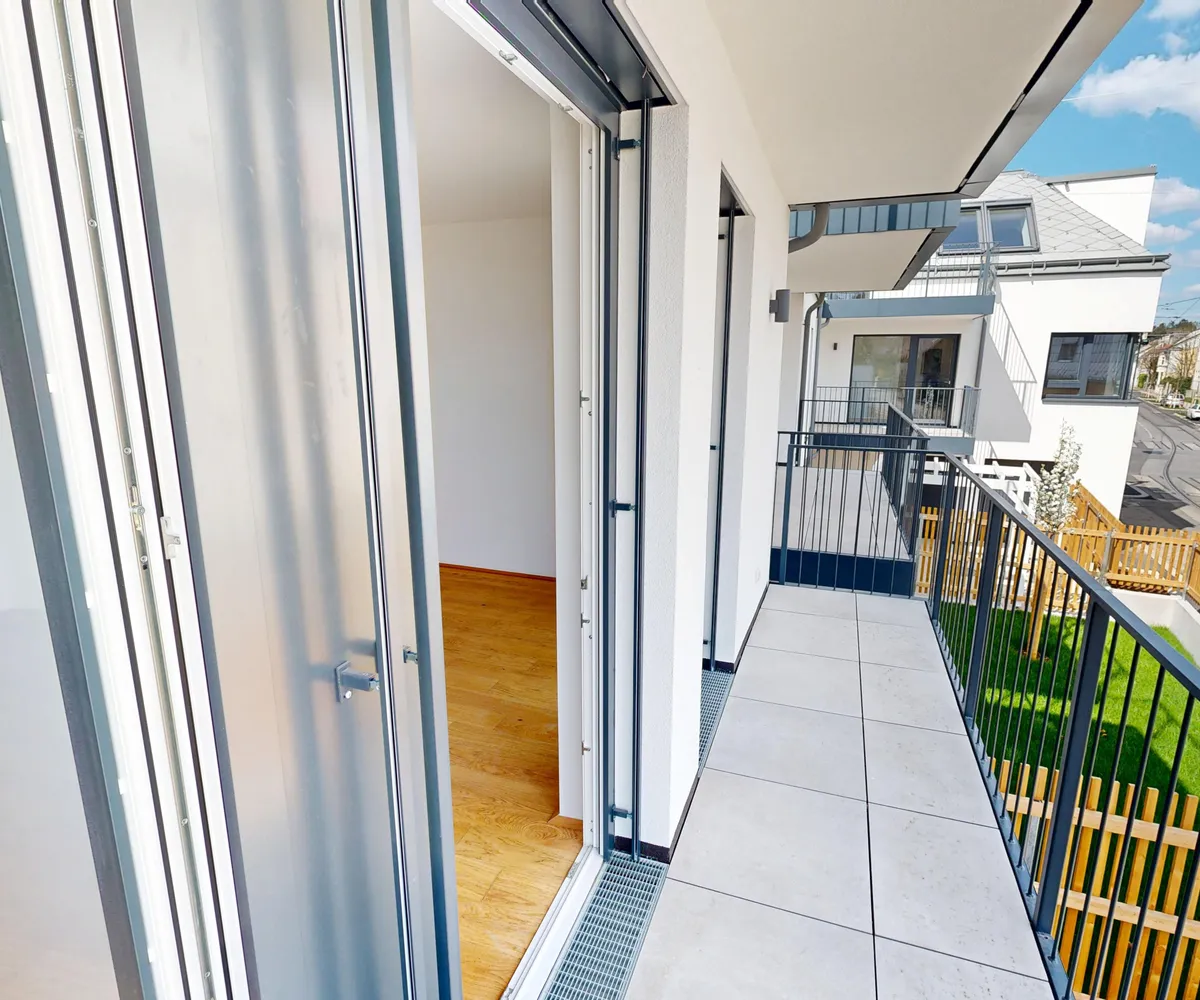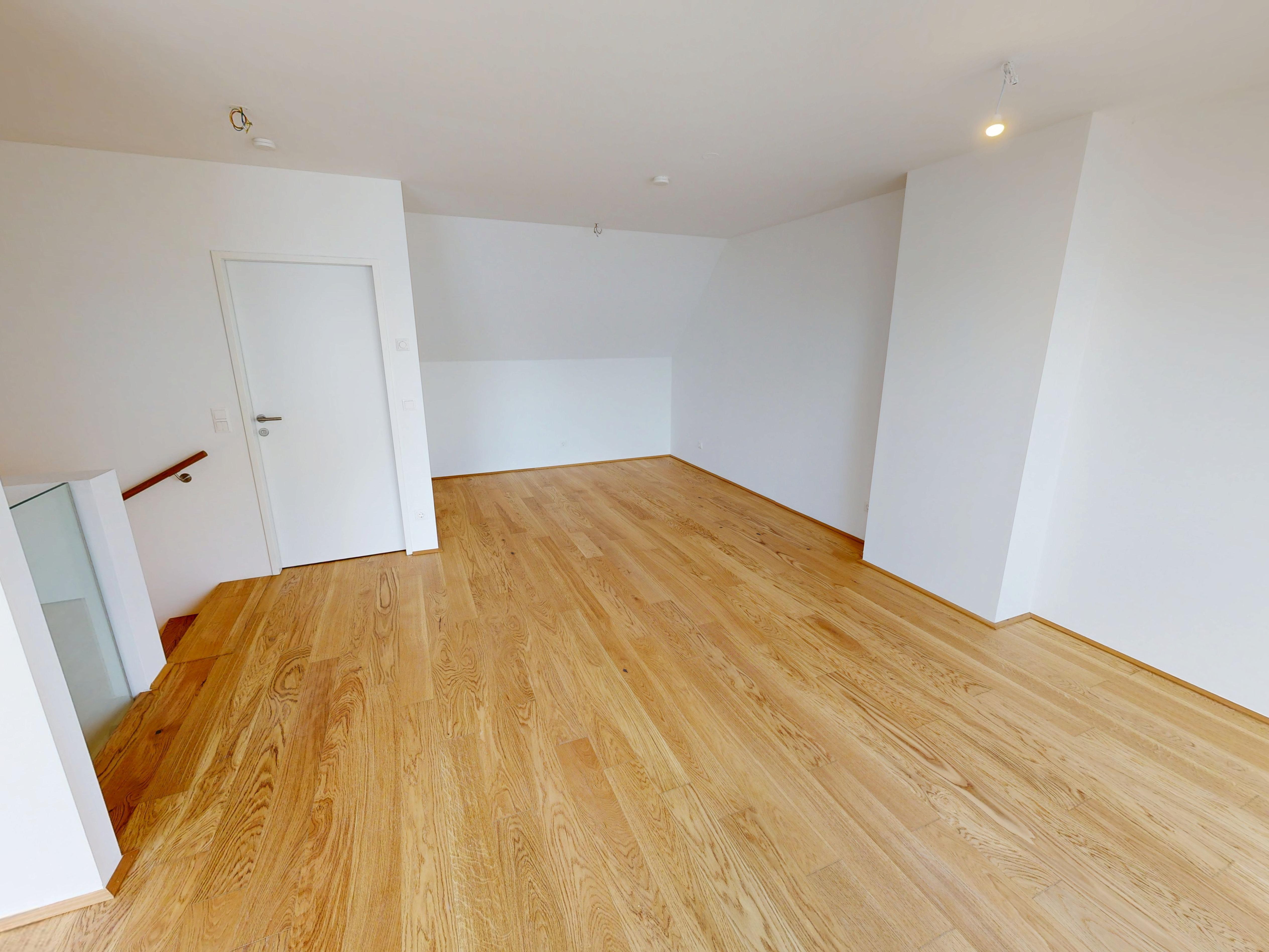Über die Treppe geht’s hinauf in den großzügigen Wohn- und Essbereich. Offen gestaltet, mit viel Licht und Zugang zu einem weiteren Balkon. Ihrem persönlichen Platz im Freien. Auch ein zweites WC mit großzügigen Stauraum befindet sich auf dieser Etage.