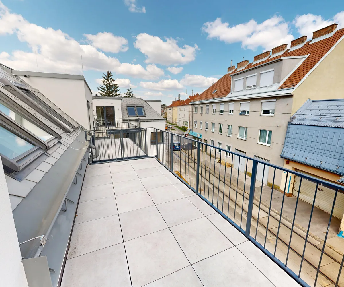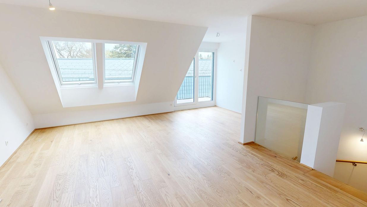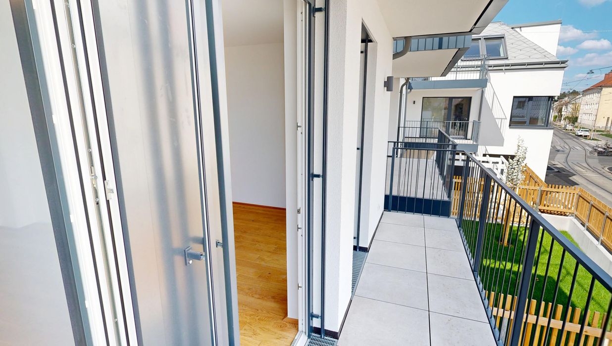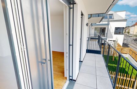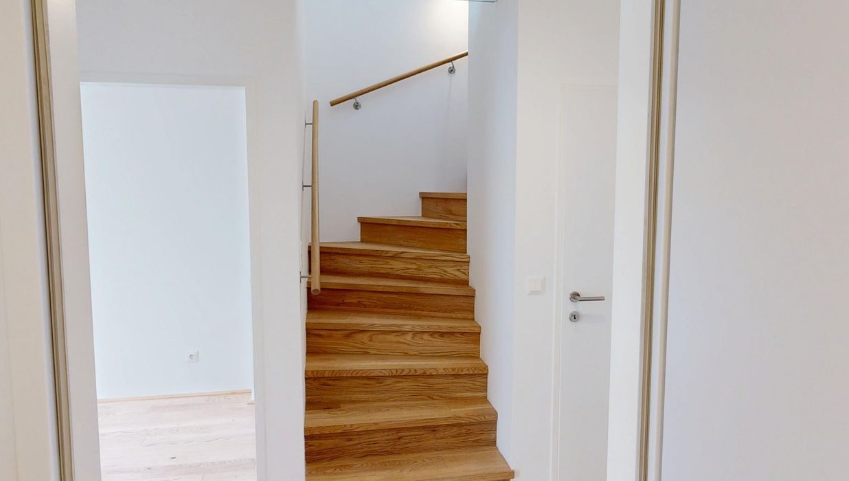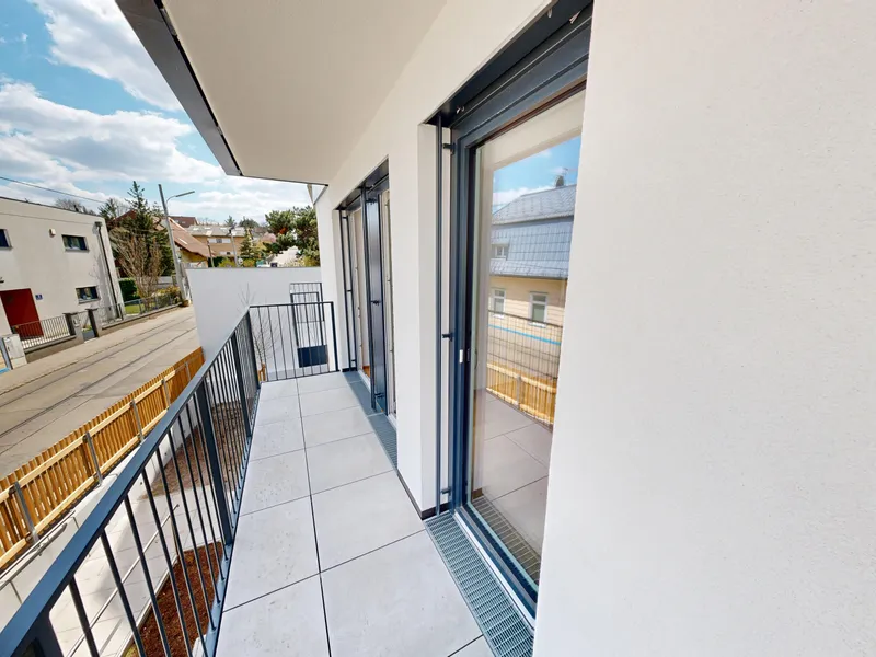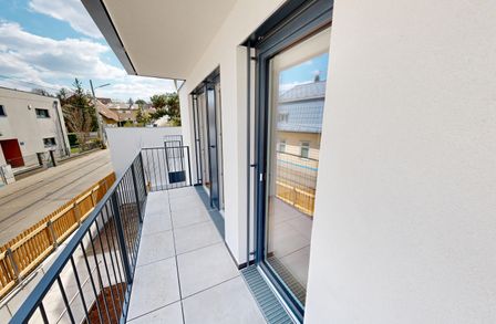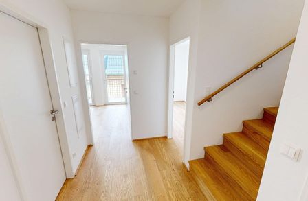 In attraktiver Lage des 23. Bezirks und mit sehr guter Anbindung an den öffentlichen Verkehr sowie der gleichzeitigen Nähe zur Natur liegt der Eingang dieser Wohnung im ersten Stock des Neubaus.