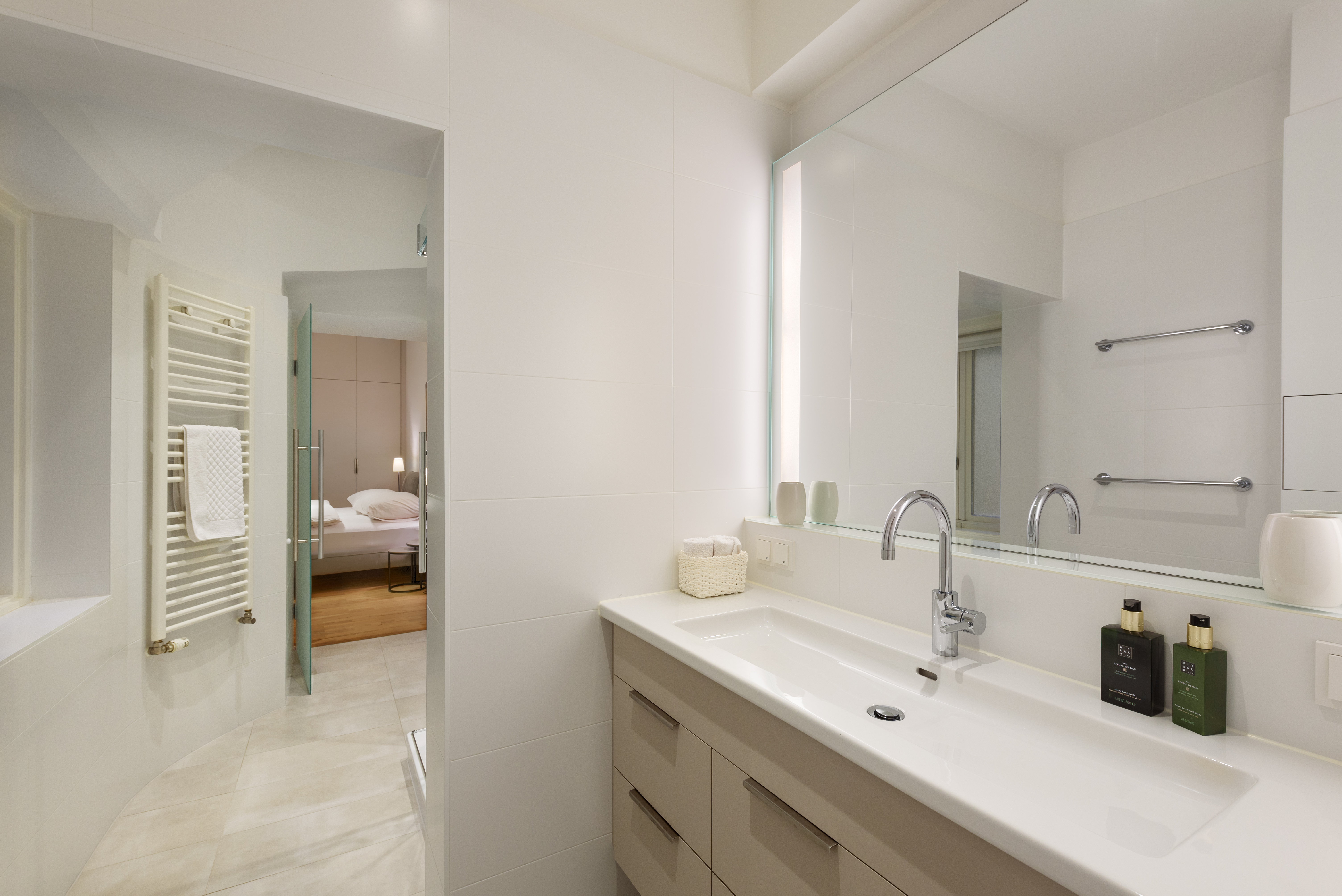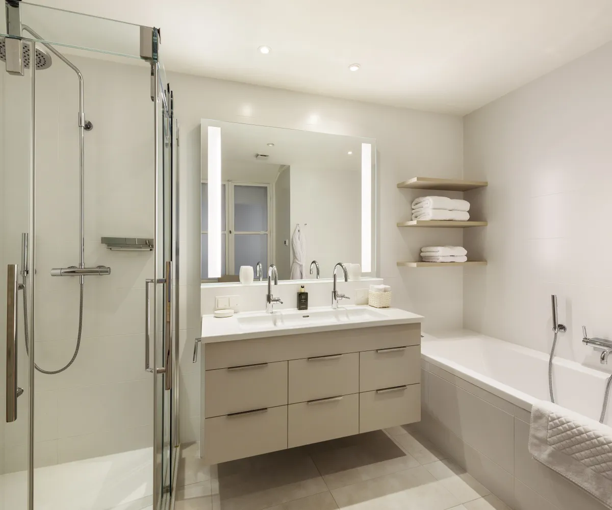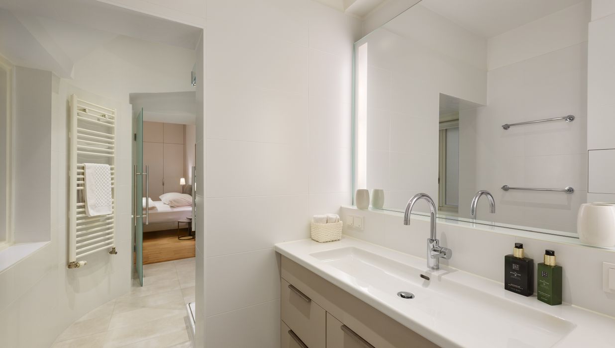 Zwei absolut ruhig gelegene Schlafzimmer sorgen für Privatsphäre und Komfort. Jedes der beiden Schlafbereiche verfügt über ein eigenes Bad - das erste ist mit Dusche und WC ausgestattet, das zweite mit Badewanne, Dusche, Doppelwaschbecken und WC – ideal für Familien oder Gäste. Ein praktischer Schrankraum mit Tischlermöbel bietet ausreichend Stauraum - ergänzt wird die Wohnung durch einen Vorraum mit Gäste-WC.