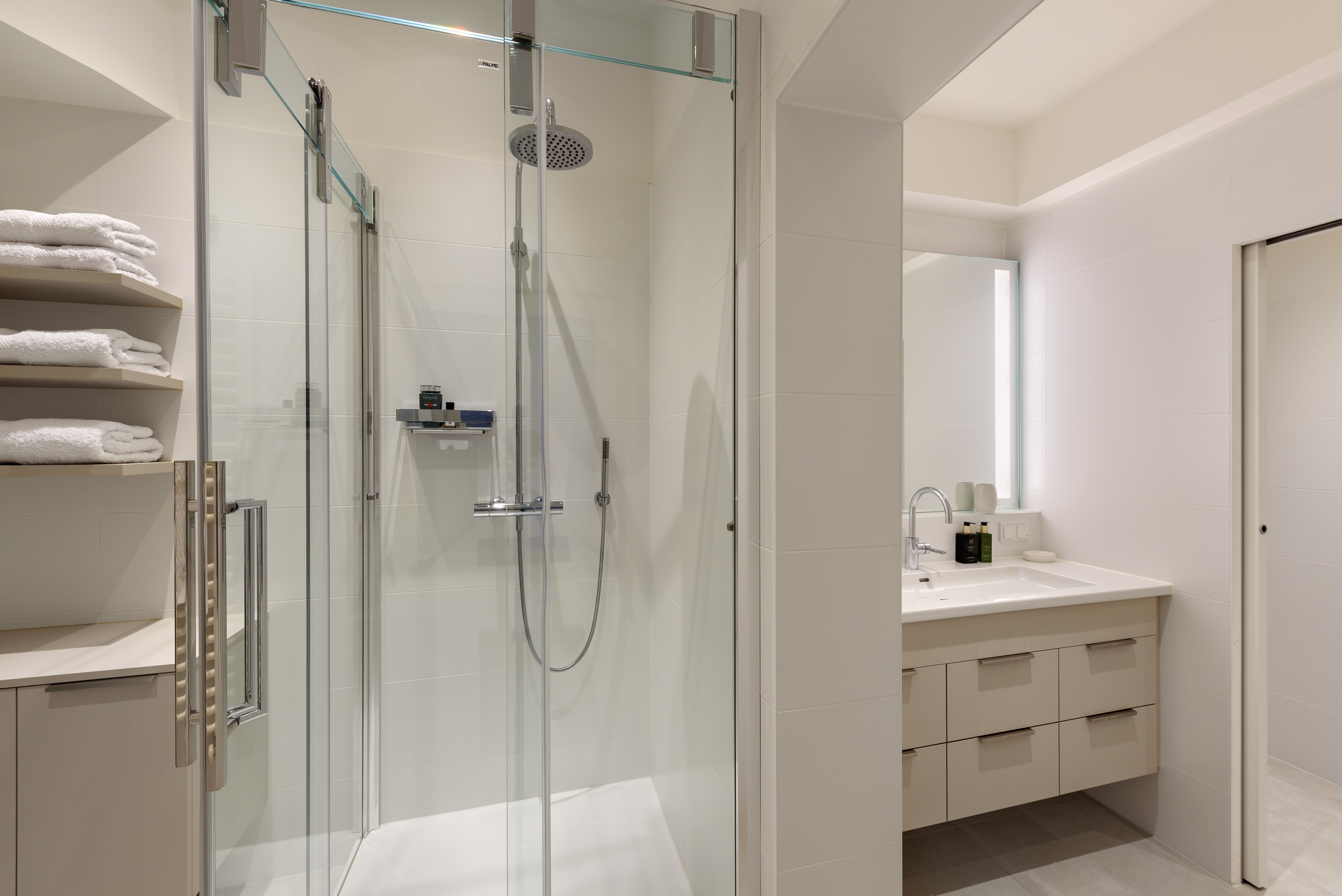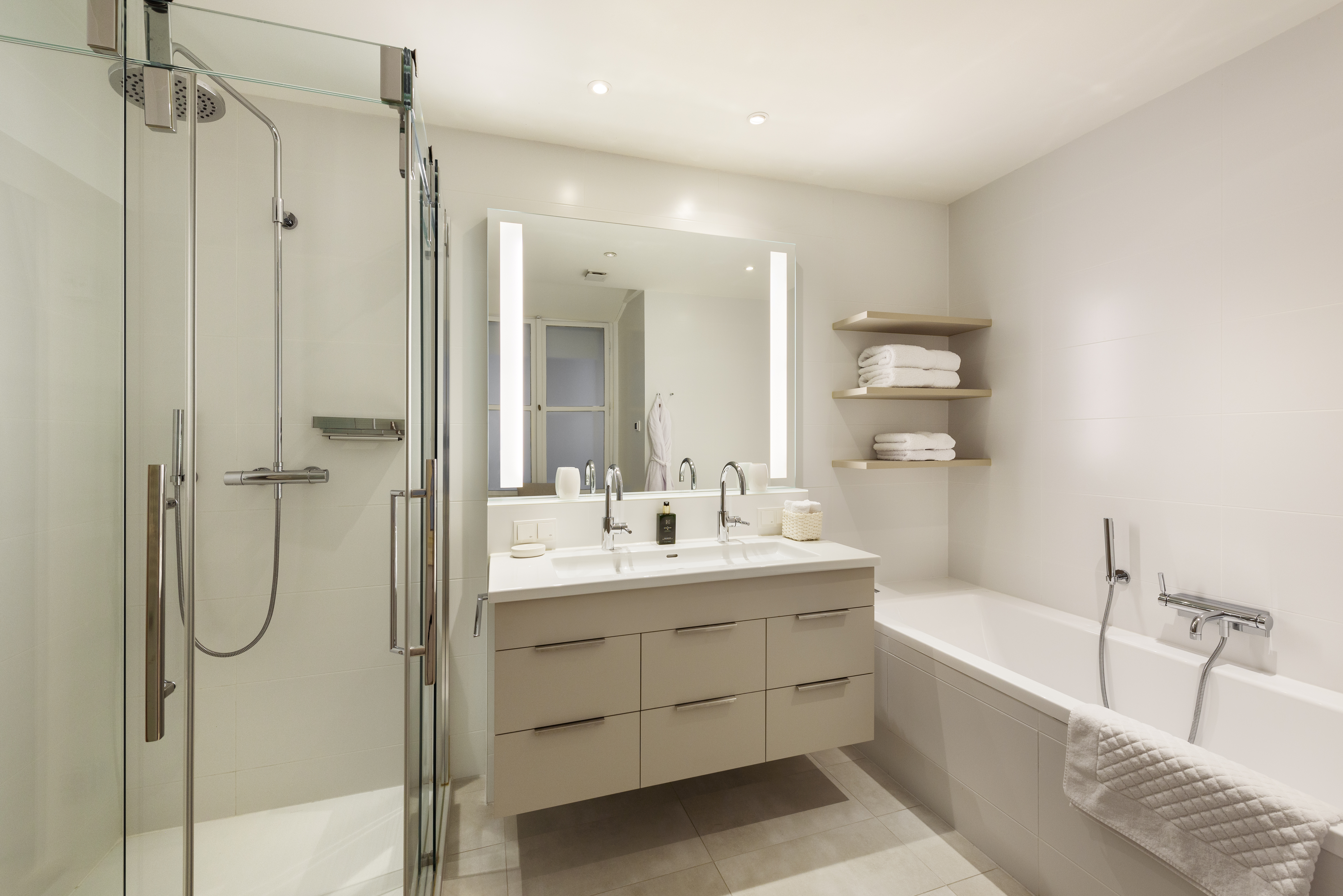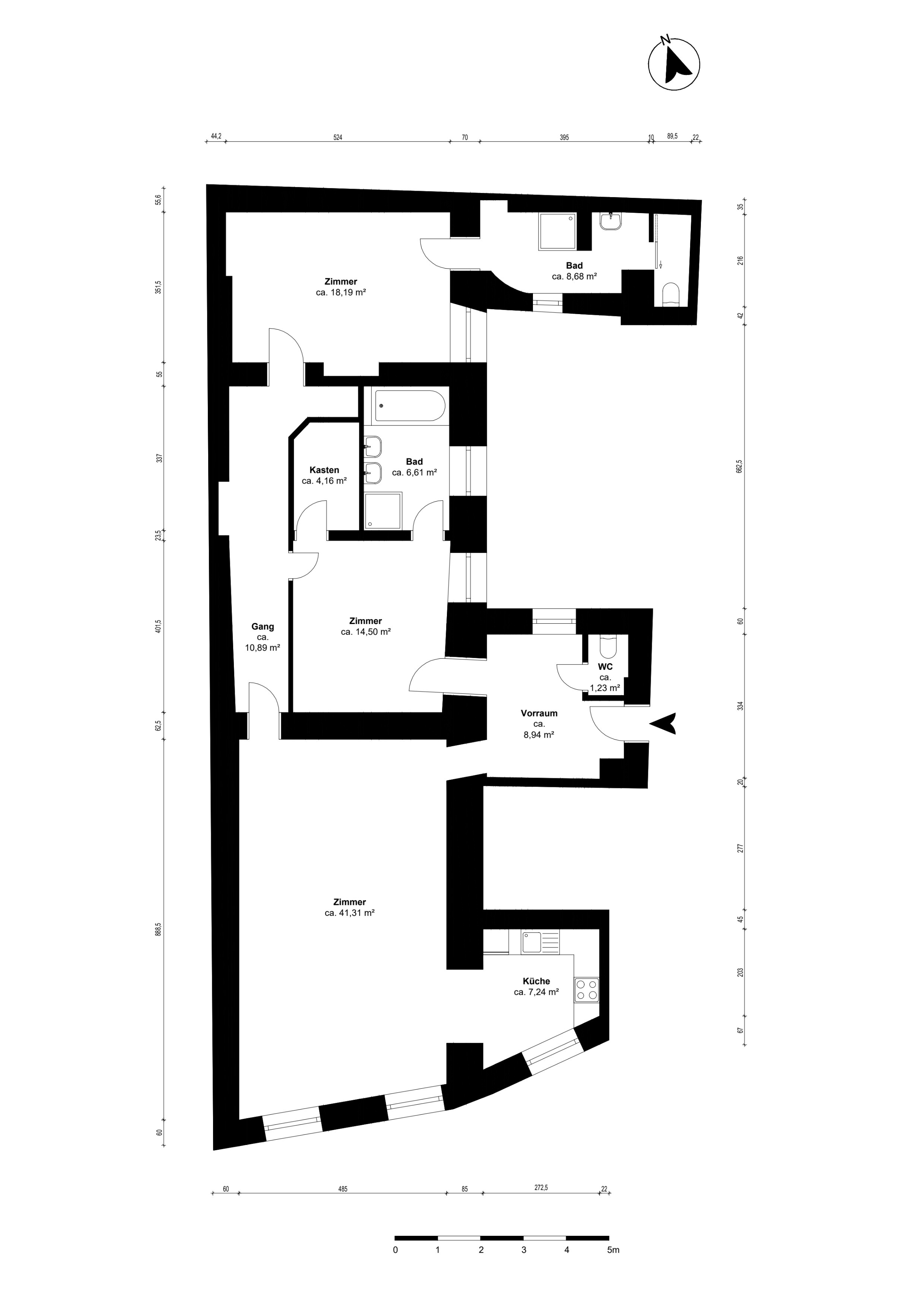 Zwei absolut ruhig gelegene Schlafzimmer sorgen für Privatsphäre und Komfort. Jedes der beiden Schlafbereiche verfügt über ein eigenes Bad - das erste ist mit Dusche und WC ausgestattet, das zweite mit Badewanne, Dusche, Doppelwaschbecken und WC – ideal für Familien oder Gäste. Ein praktischer Schrankraum mit Tischlermöbel bietet ausreichend Stauraum - ergänzt wird die Wohnung durch einen Vorraum mit Gäste-WC.
