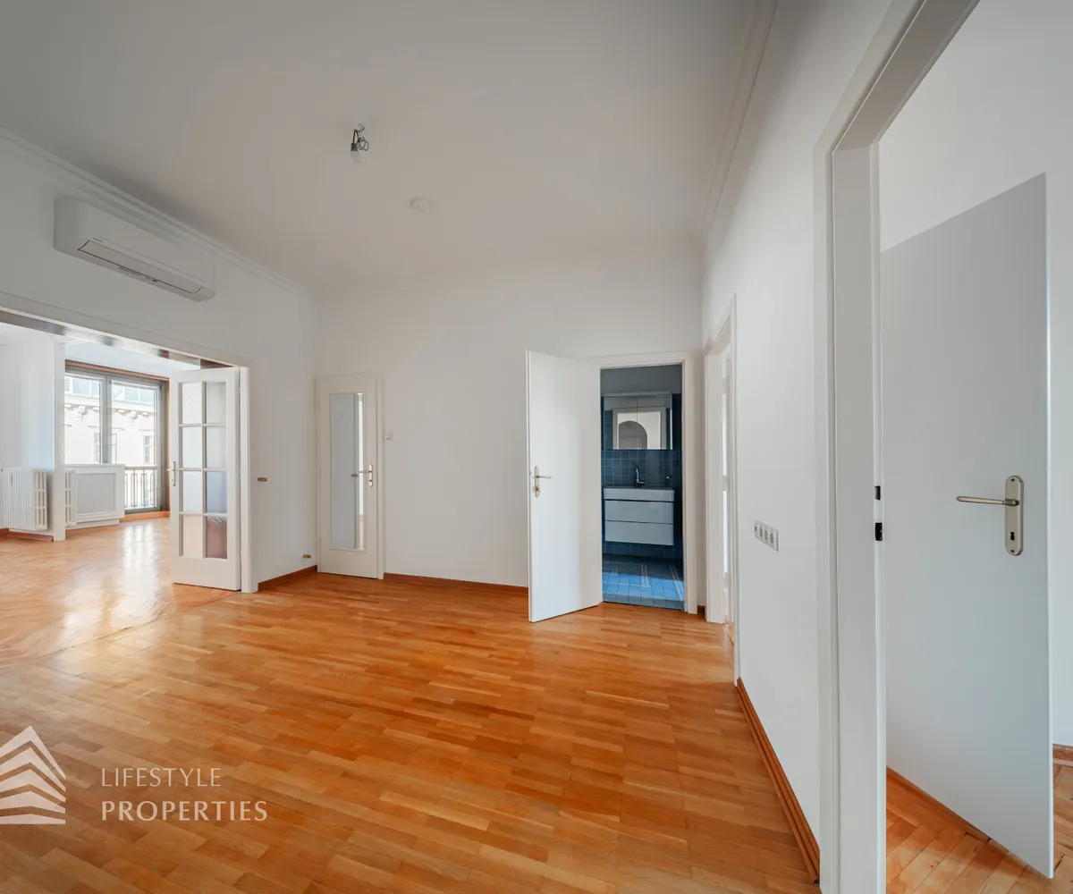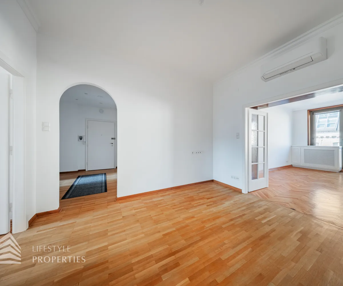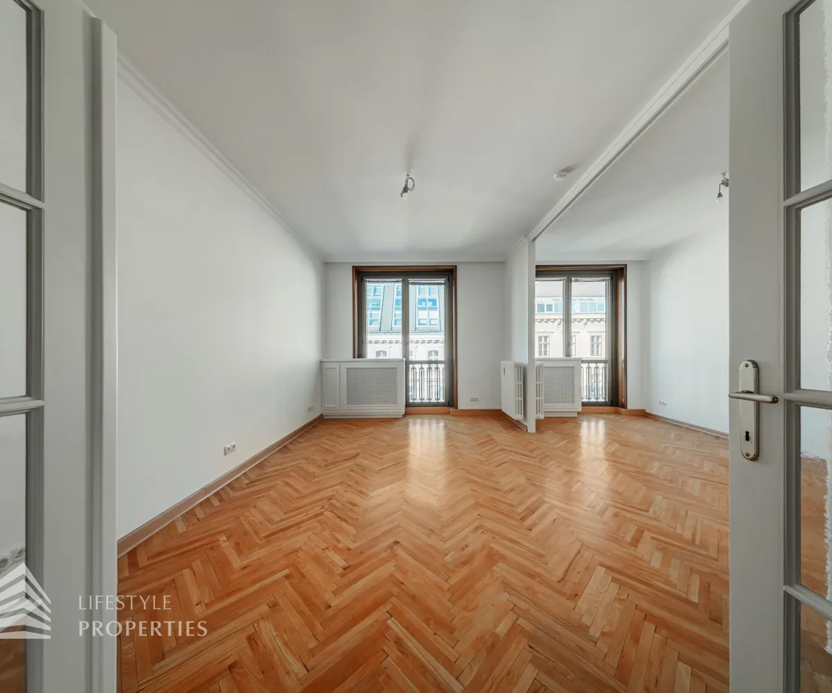 Der hofseitige Teil der Wohnung bildet das Herzstück: Zwei weitläufige Räume, die zu einem ca. 35 m² großen Wohnzimmer verbunden sind und eine absolute Ruhelage genießen. Dieser Bereich eignet sich perfekt als stilvoller Wohn- und Entspannungsbereich inmitten des pulsierenden Stadtzentrums. Sowohl der große Vorraum als auch das Wohnzimmer sind mit Klimaanlagen ausgestattet, die für angenehmes Raumklima zu jeder Jahreszeit sorgen.