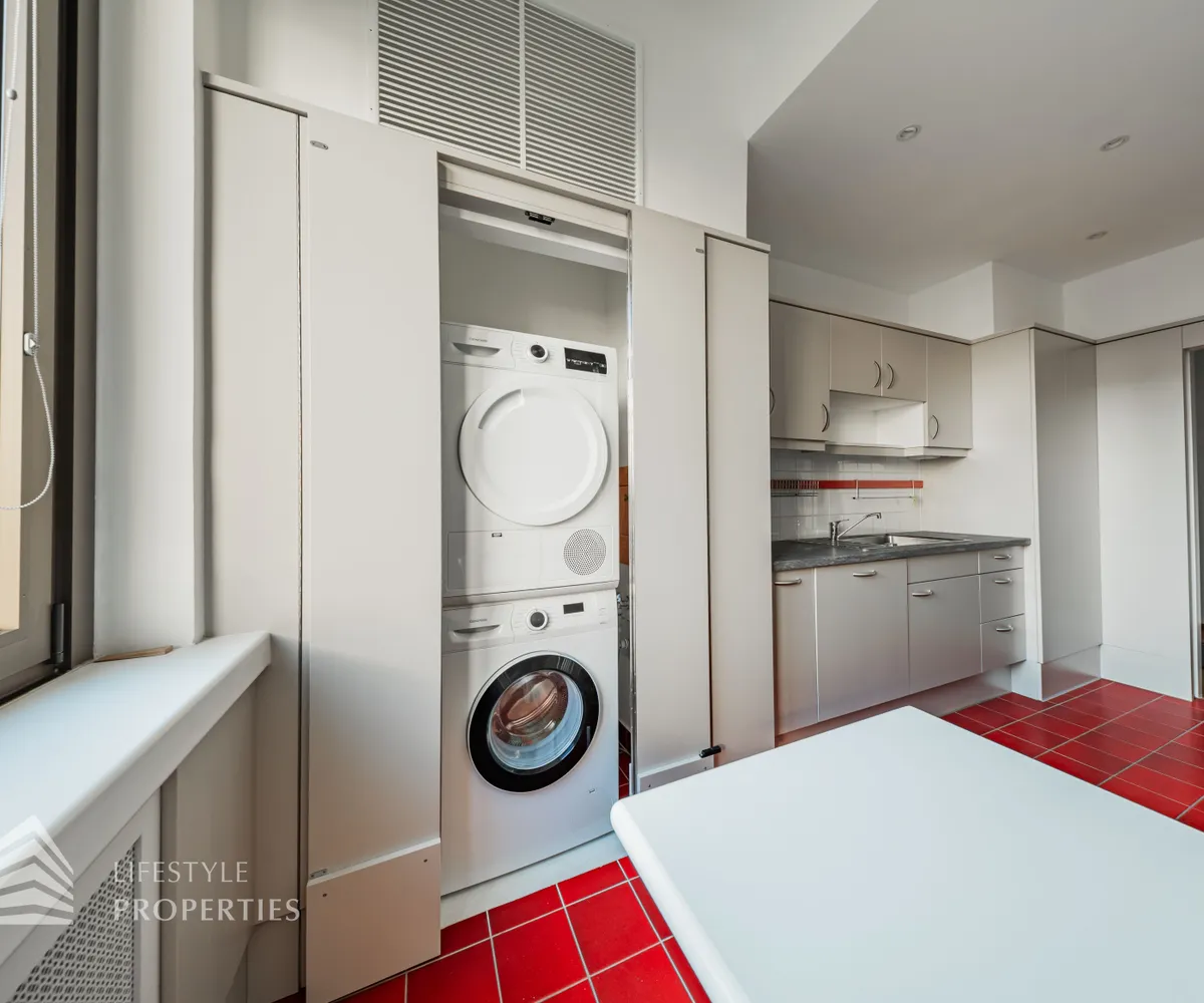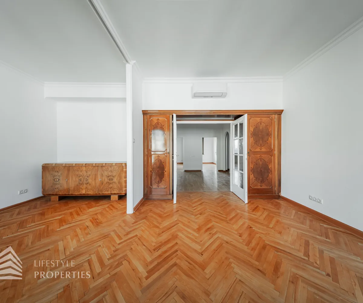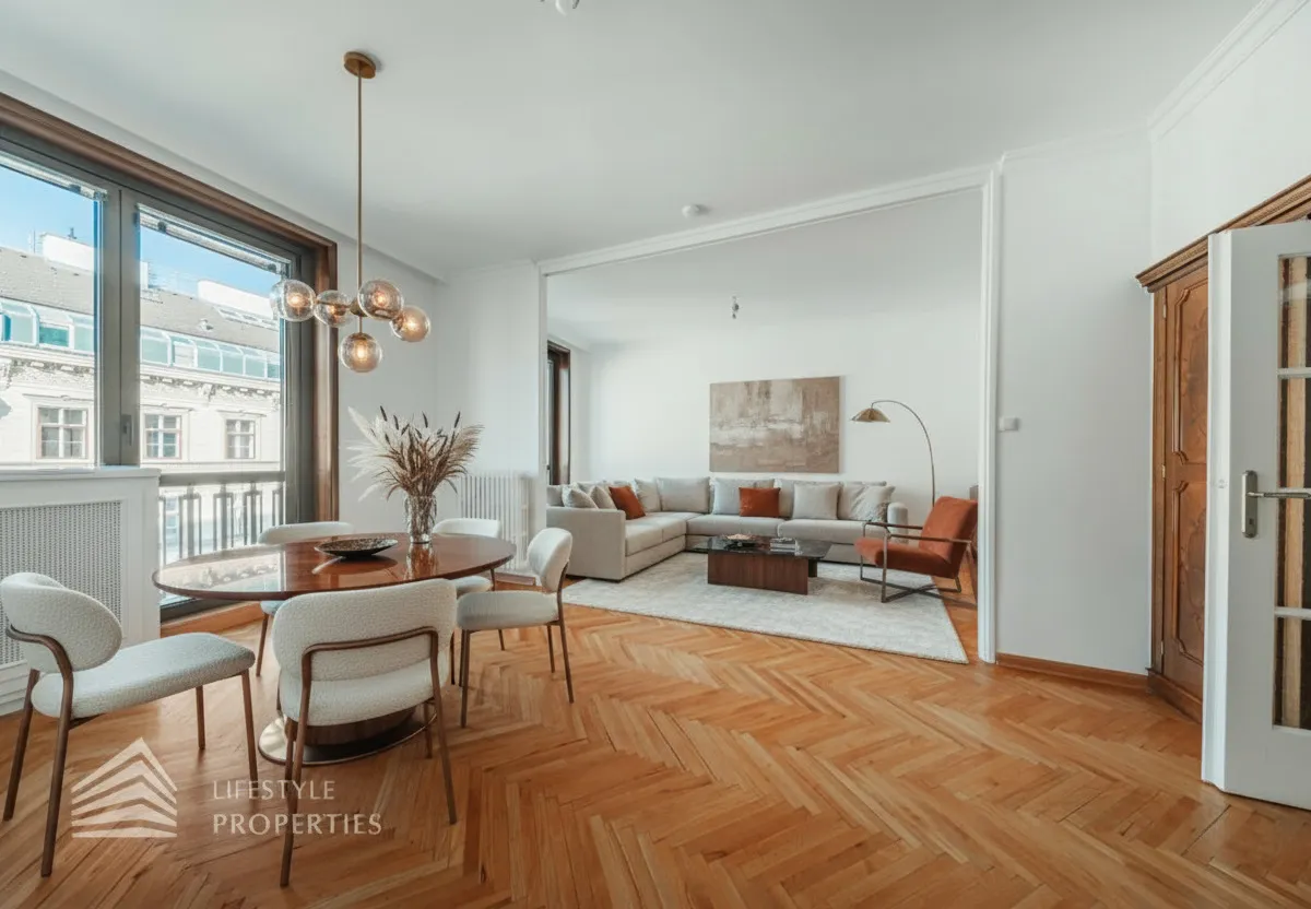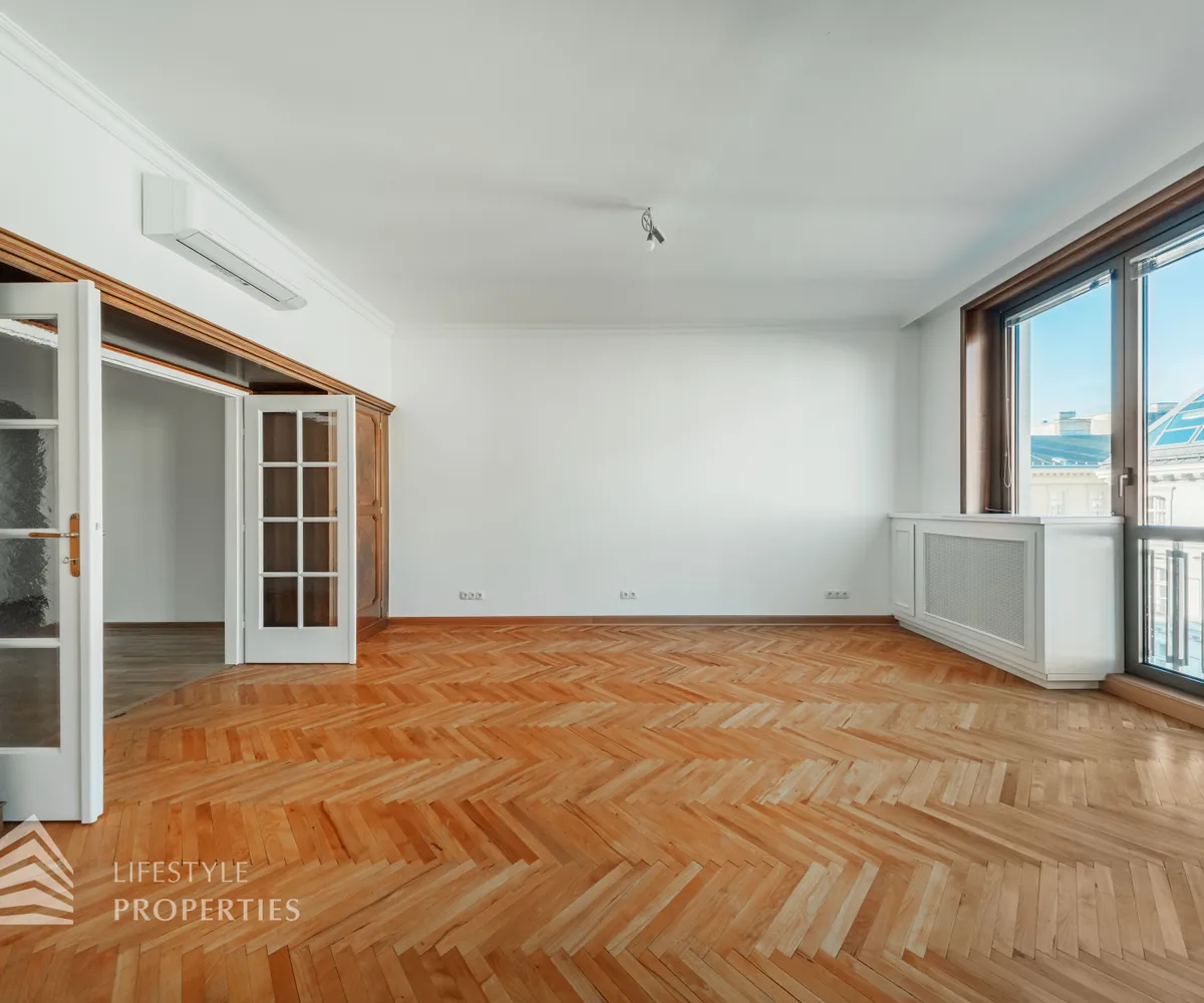 Der hofseitige Teil der Wohnung bildet das Herzstück: Zwei weitläufige Räume, die zu einem ca. 35 m² großen Wohnzimmer verbunden sind und eine absolute Ruhelage genießen. Dieser Bereich eignet sich perfekt als stilvoller Wohn- und Entspannungsbereich inmitten des pulsierenden Stadtzentrums. Sowohl der große Vorraum als auch das Wohnzimmer sind mit Klimaanlagen ausgestattet, die für angenehmes Raumklima zu jeder Jahreszeit sorgen.