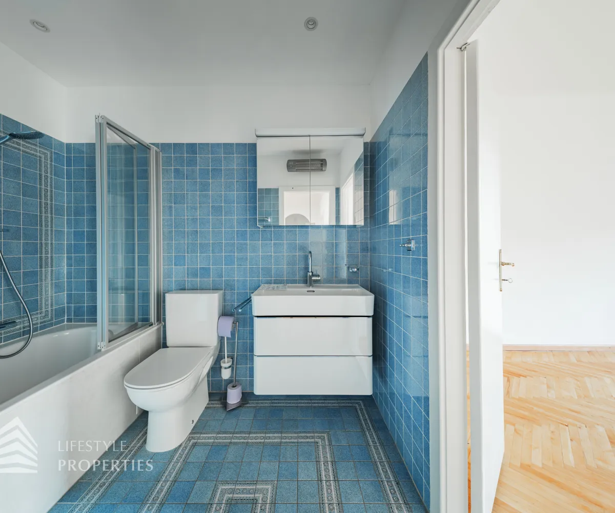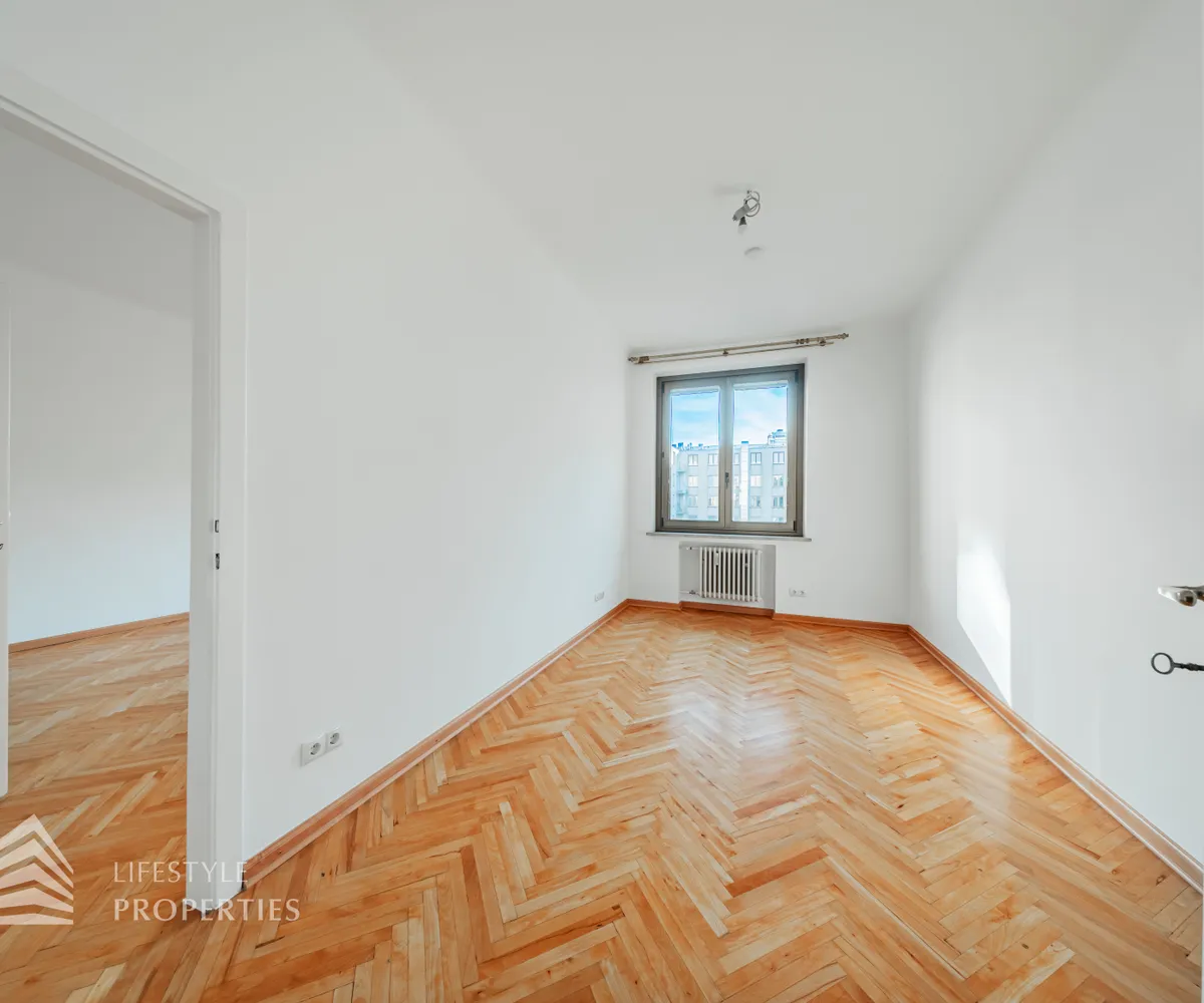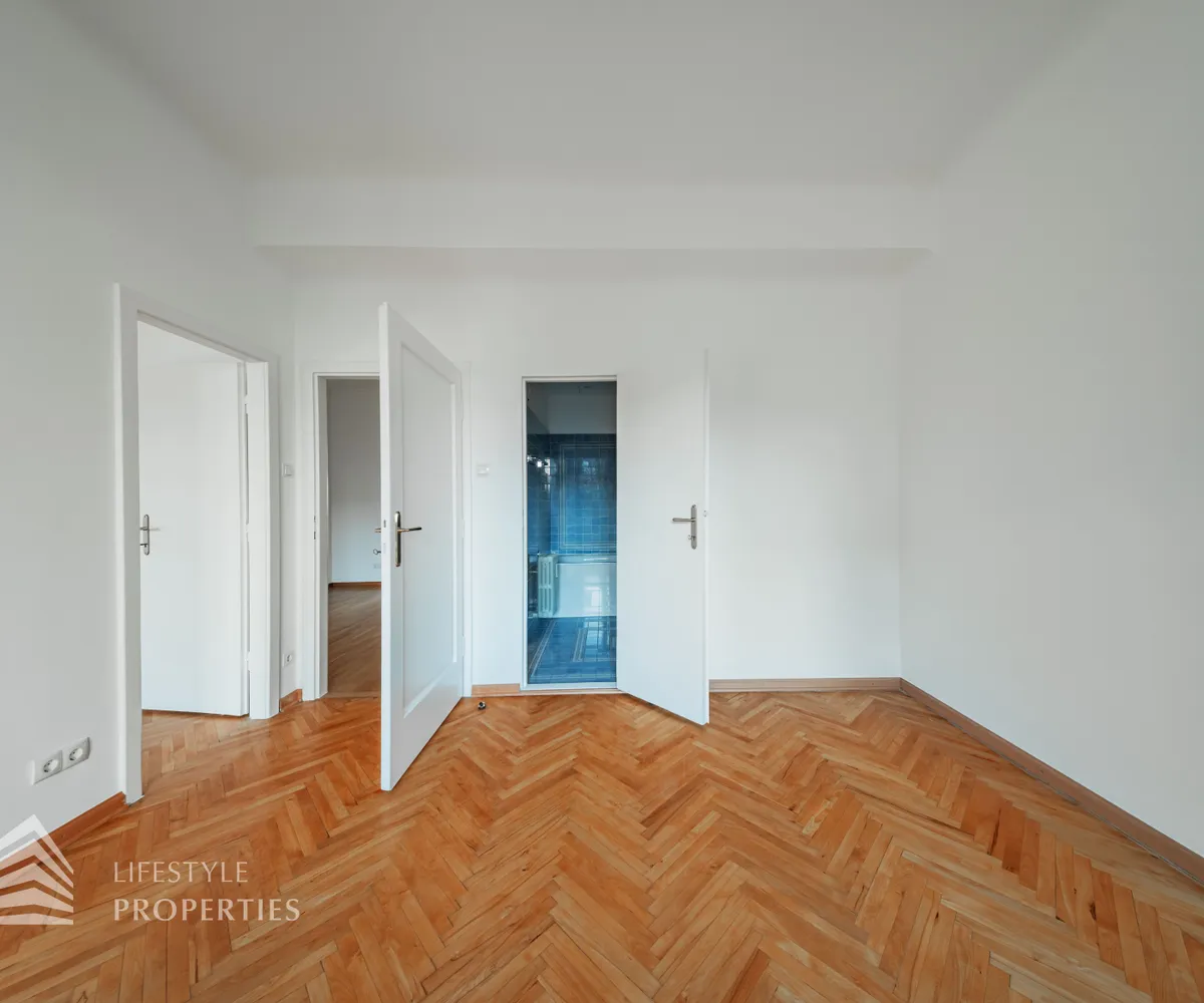 Straßenseitig befinden sich zwei Schlafzimmer, ein ca. 14 m² großes Zimmer, ideal als Kinder-, Gäste- oder Arbeitszimmer, sowie ein großzügiges ca. 19 m² Hauptschlafzimmer, welches über einen direkten Zugang zum Badezimmer verfügt. Das modernisierte Badezimmer ist sowohl vom Hauptschlafzimmer als auch vom zentralen Vorraum aus begehbar und mit Badewanne und WC ausgestattet. Zusätzlich steht ein separates Gäste-WC zur Verfügung.