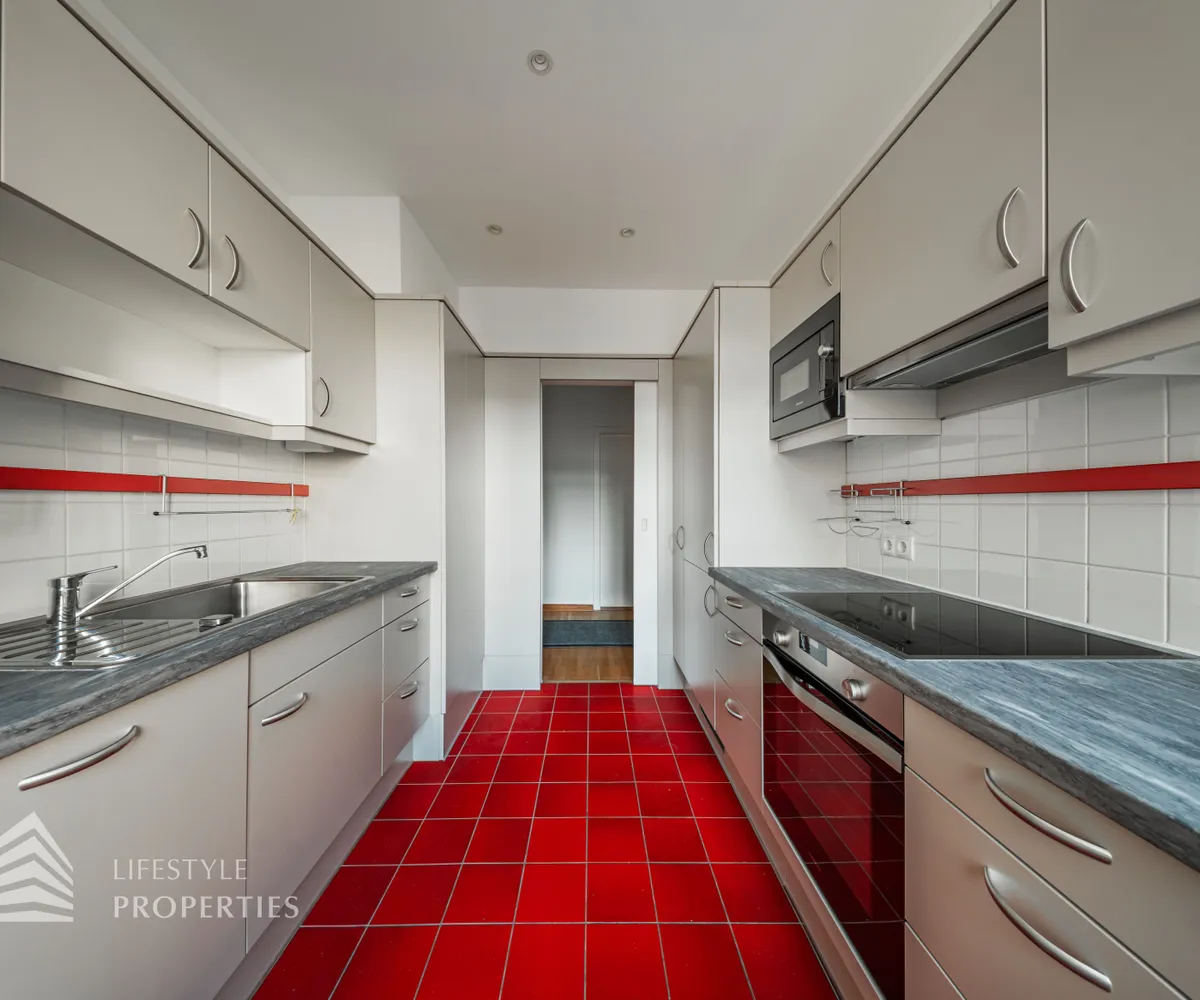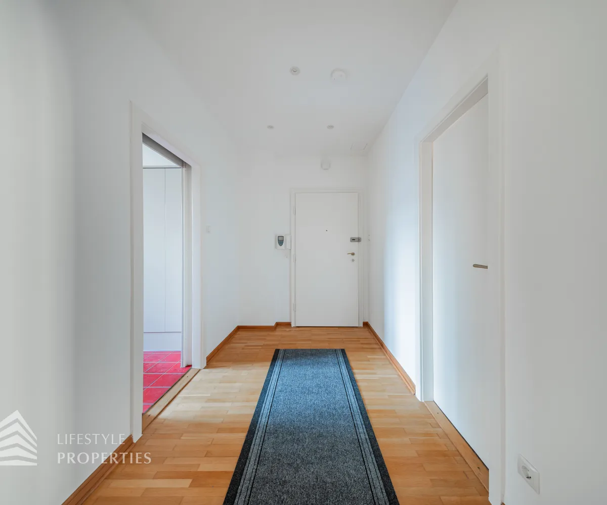 Beim Betreten der Wohnung eröffnet sich ein rund 7 m² großer Vorraum, der den Zugang zu allen Bereichen der großzügig geschnittenen Wohnfläche vermittelt. Rechterhand befindet sich die separate, voll ausgestattete Küche mit hochwertigen Geräten und einer praktischen, angrenzenden Waschmaschinen- und Trocknerkammer. Der gesamte Küchenbereich umfasst etwa 10 m² und ist ideal strukturiert. Linkerhand der Eingangstüre bietet eine ca. 3,5 m² große Abstellkammer wertvollen zusätzlichen Stauraum. Im Anschluss gelangt man in einen beeindruckend knapp 13 m² großen zentralen Vorraum, der vielseitige Nutzungsmöglichkeiten eröffnet – ob als Essbereich, Home-Office, Garderobenlounge oder stilvolle Empfangszone.