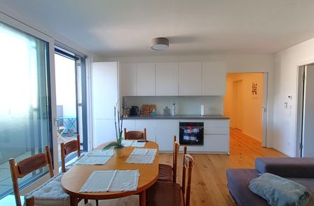 Diese 2-Zimmer Wohnung befindet sich in einem neu errichteten Dachgeschoss und überzeugt mit hochwertiger Ausstattung und smartem Layout. Auf insgesamt rund 55,62 m² Wohnfläche erwartet Sie eine moderne Einbauküche mit Vollausstattung. Die Küche bietet alles was Sie für das entspannte Kochen benötigen - Ceran Kochfeld, Dunstabzug, Geschirrspüler, Backofen und Kühlschrank mit Gefrierfach lassen keine Wünsche offen.
