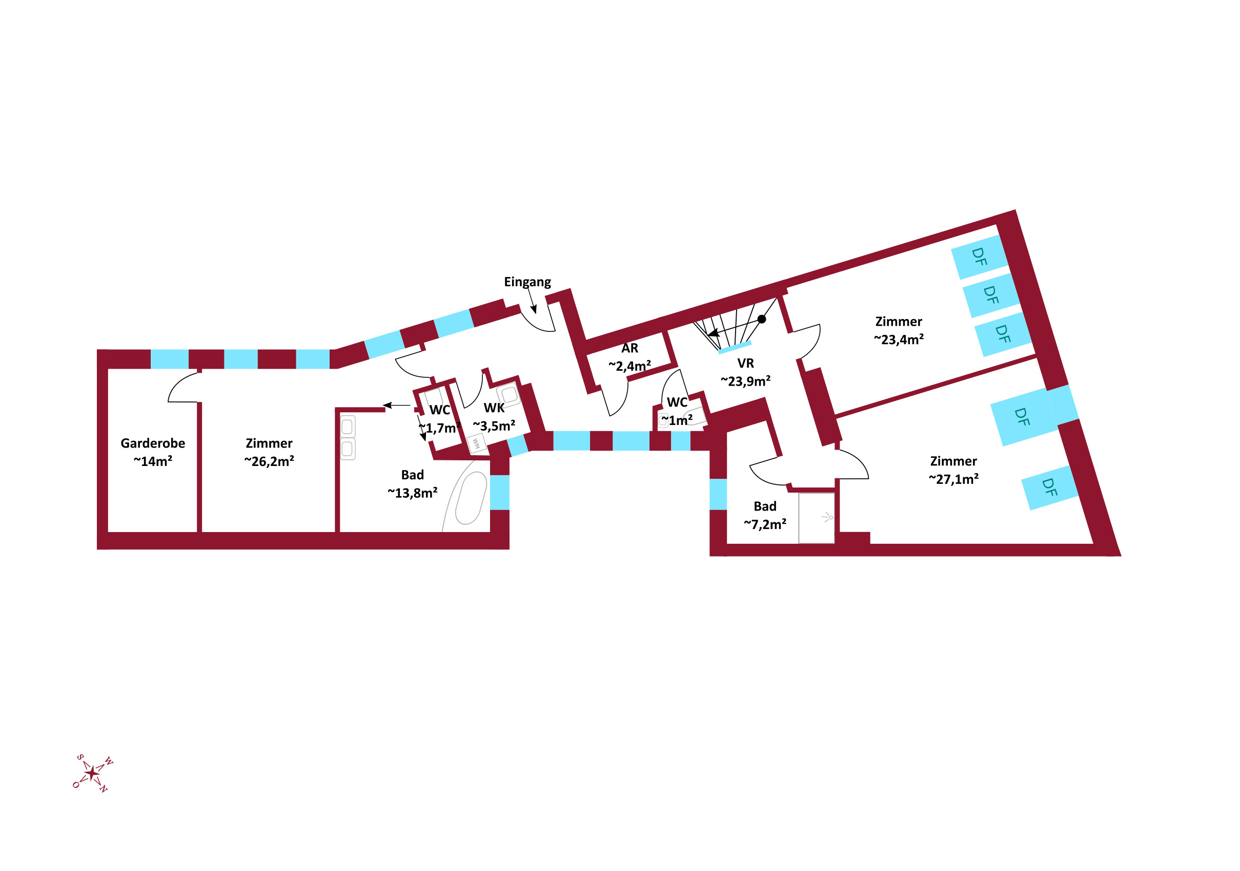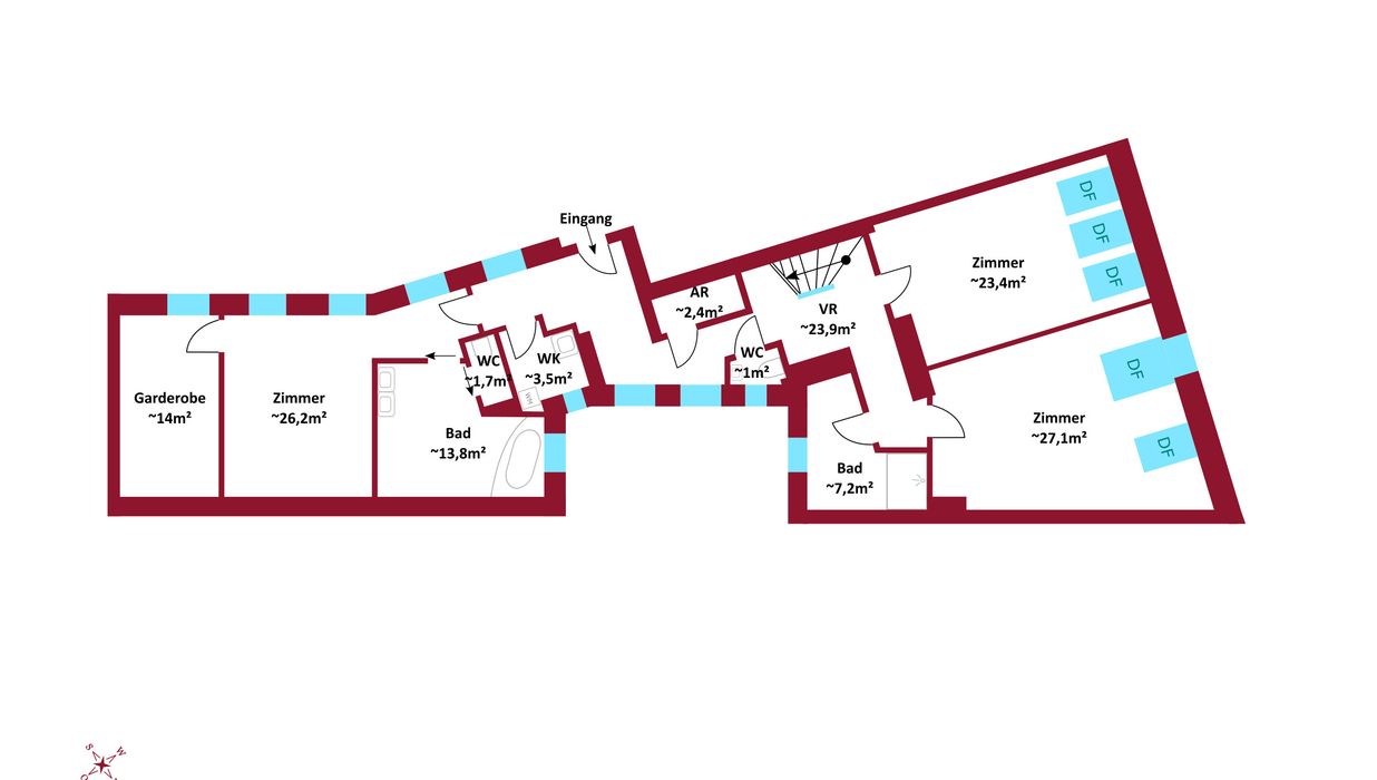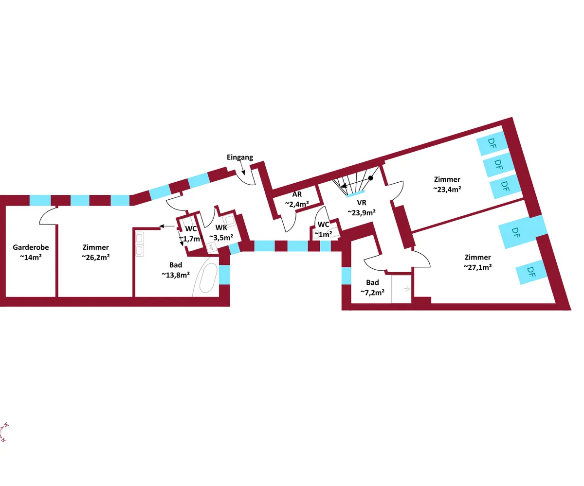 Raumangebot: Insgesamt 7 Zimmer und 3 Badezimmer